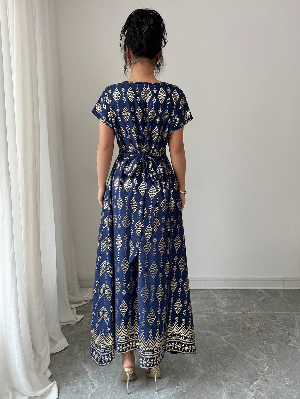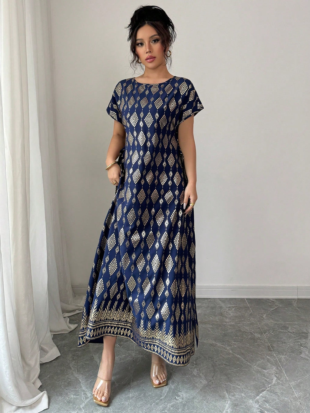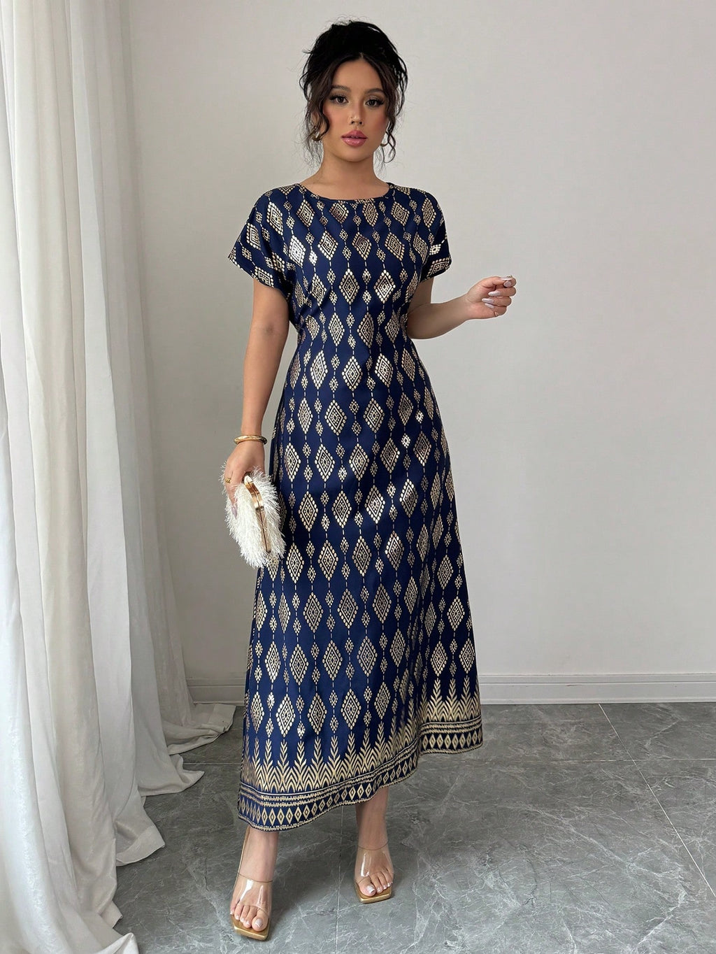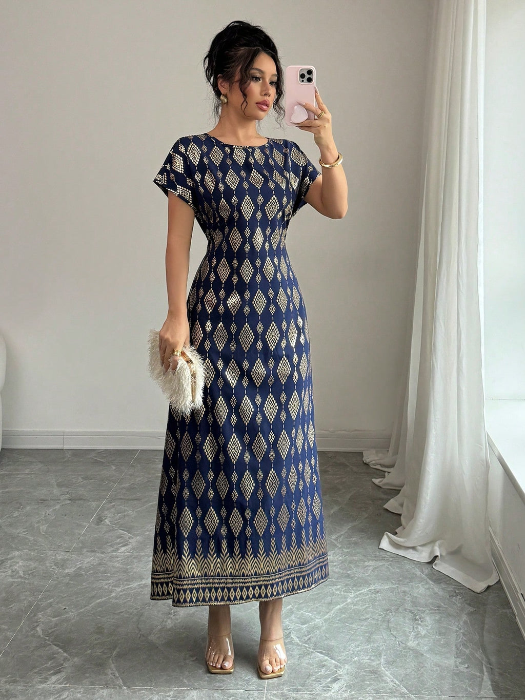 BELLAVOG Women Allover Print Elegant Round Neck Short Sleeve Dress