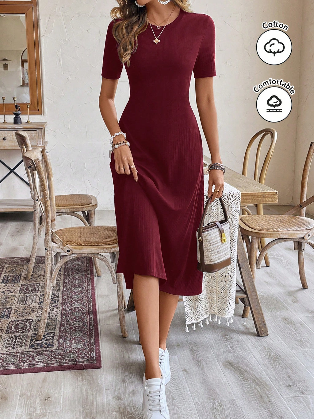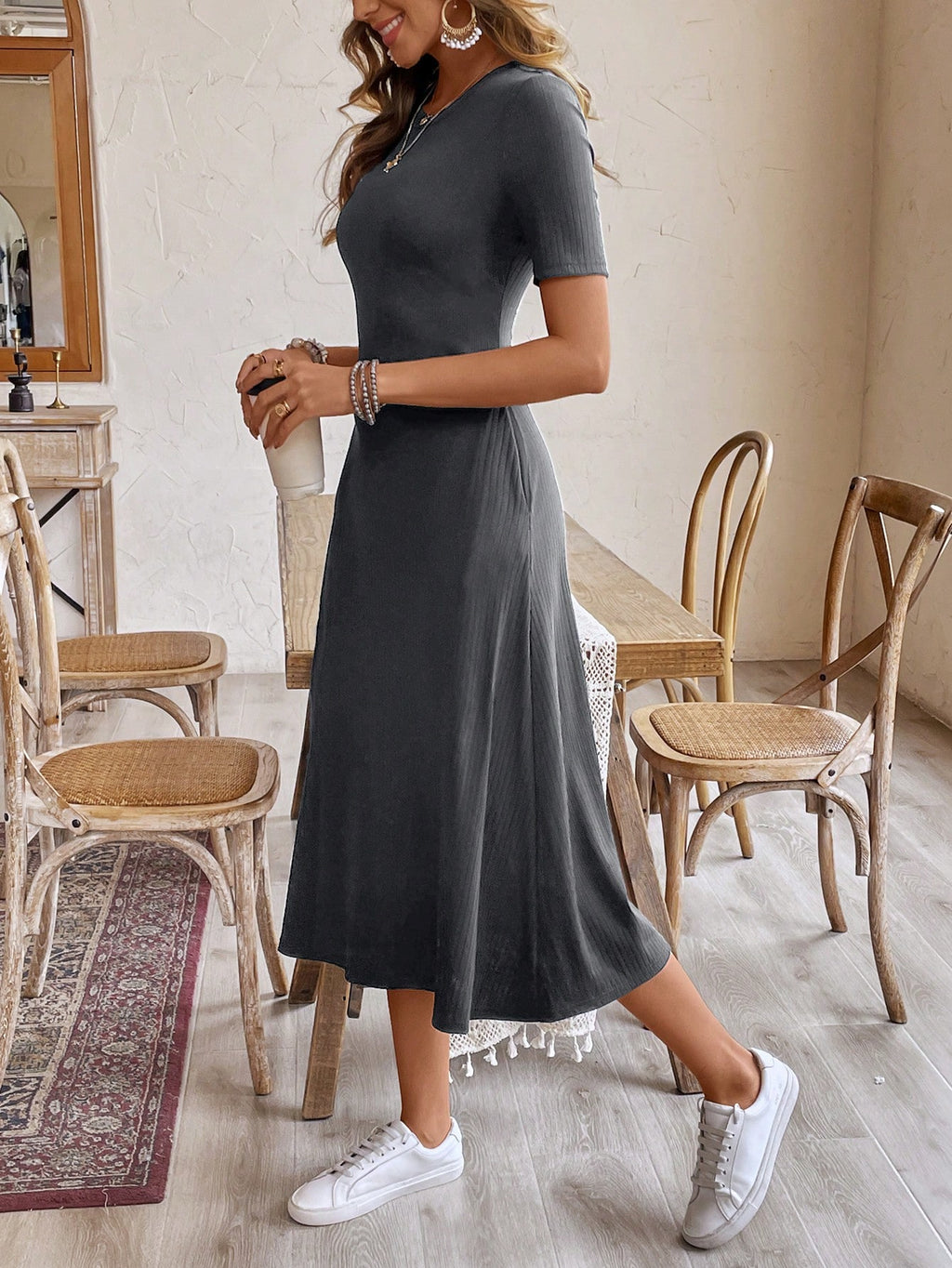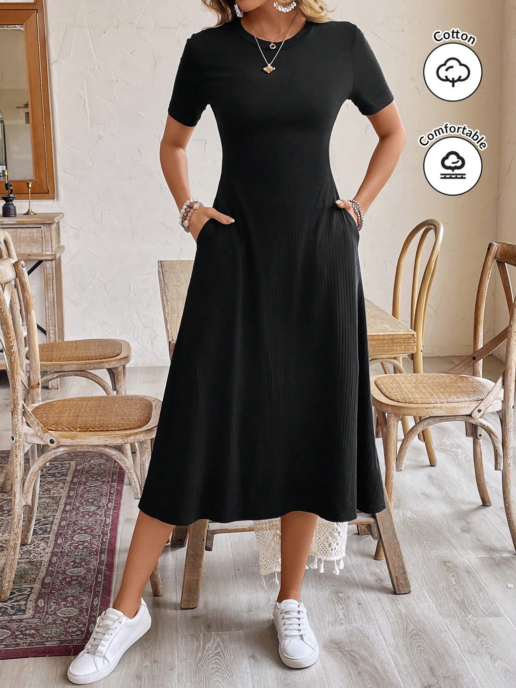 BELLAVOG Women Earthy Clothes Work Women Dresses Mother Day Dress Casual Short-Sleeve Round Neck Summer Black Long Dress,Commute,Office,Old Money,Simple,Minimalist,