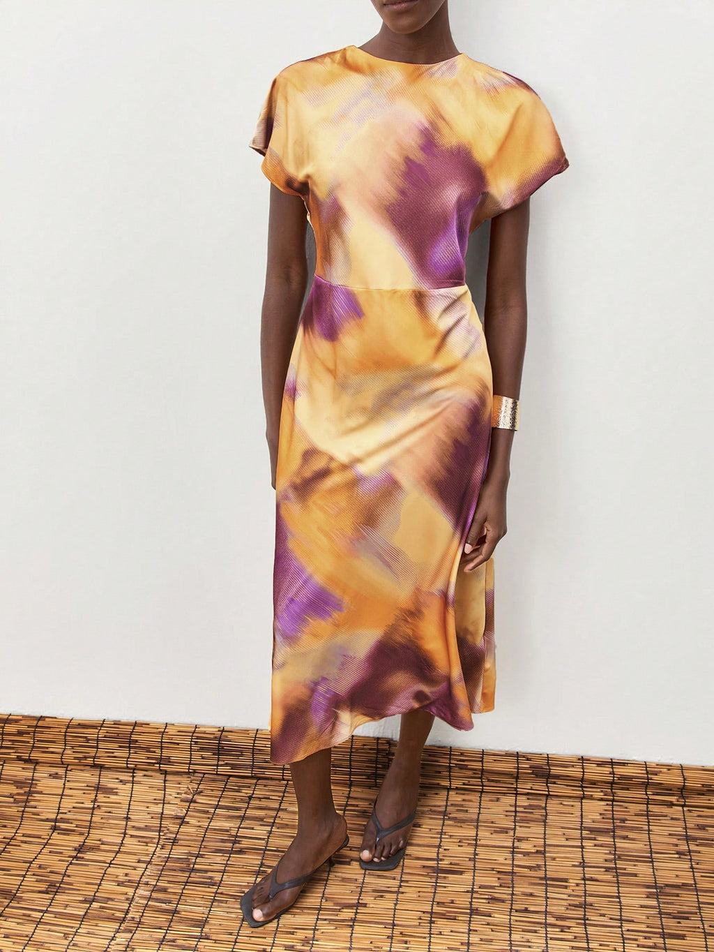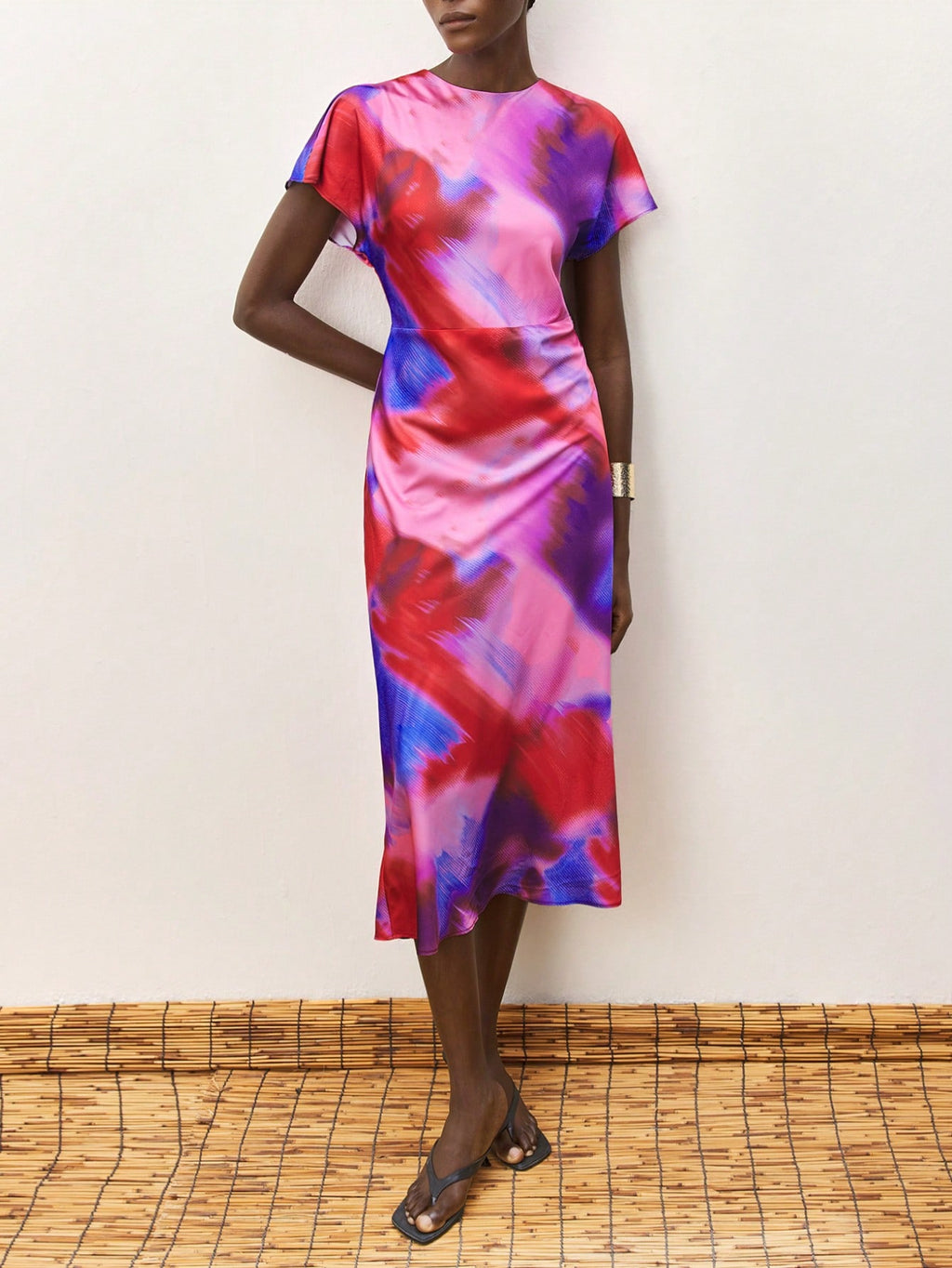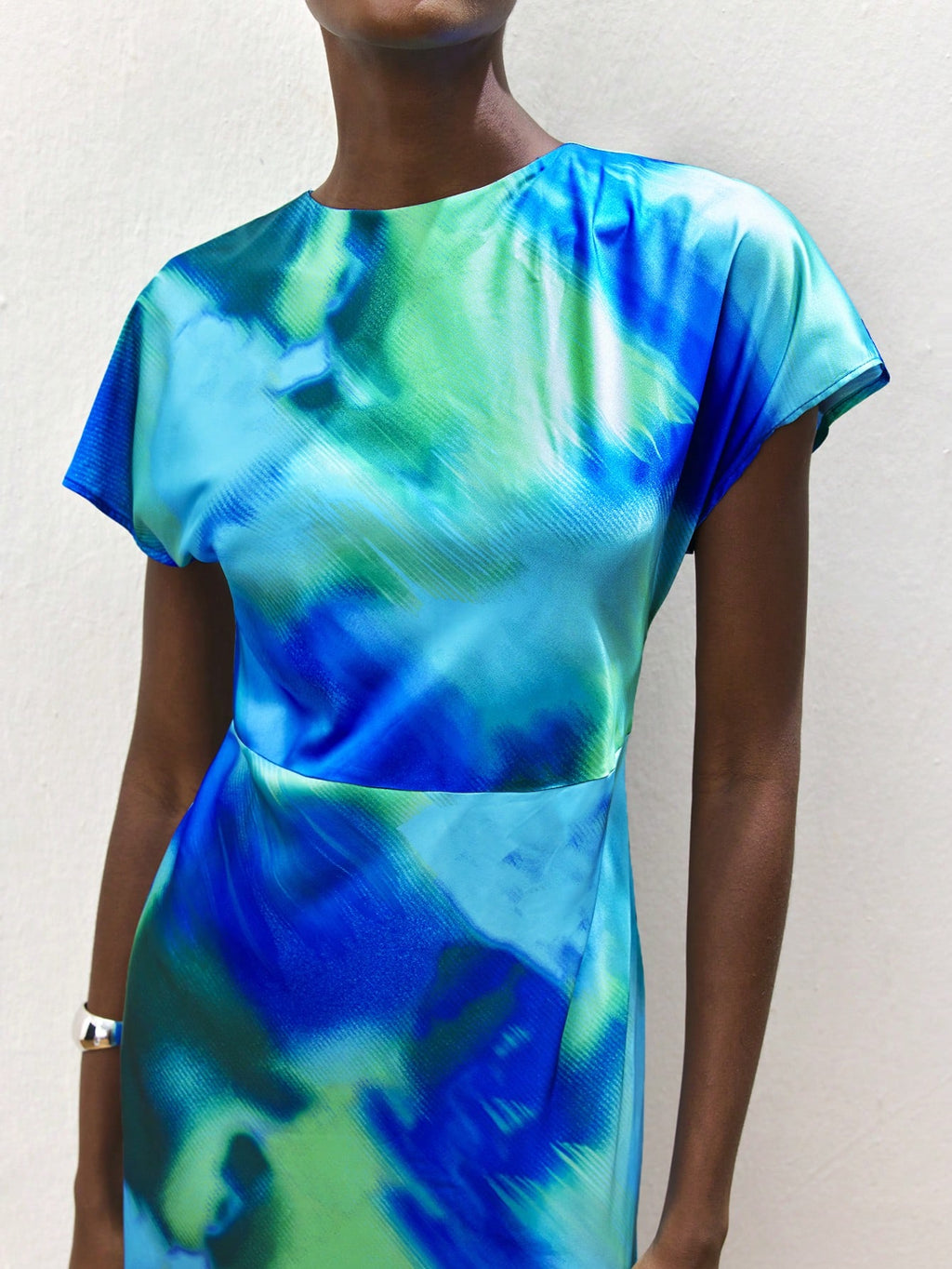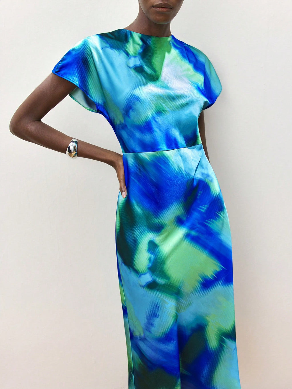 BELLAVOG Women's Elegant Romantic Tie Dye Print Silk Satin Short Sleeve Ruched Waist Long Dress, Suitable For Music Festivals, Easter