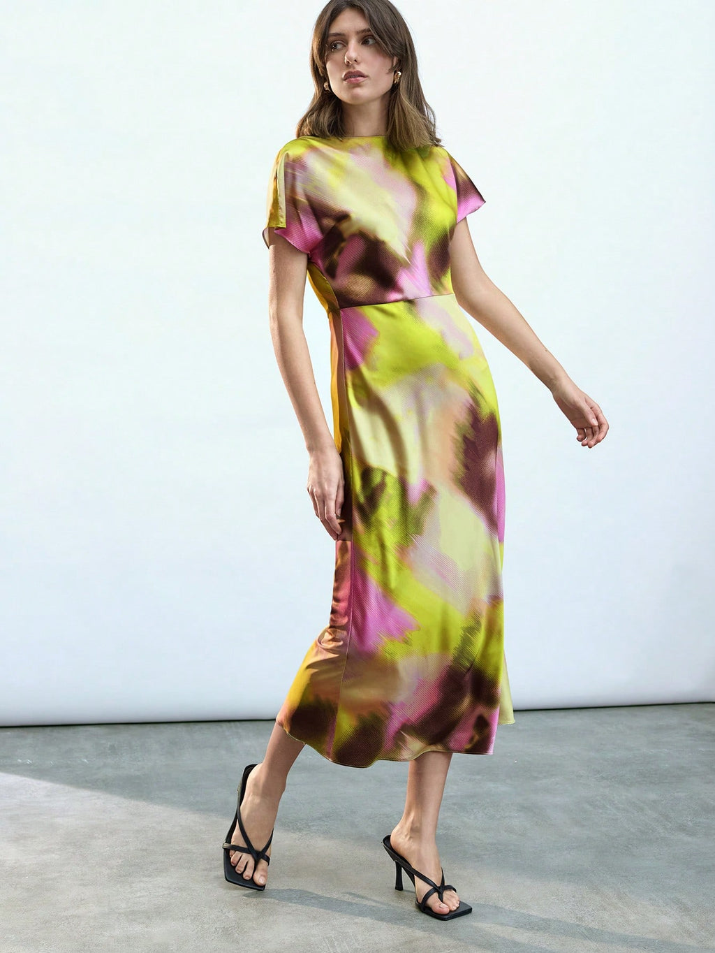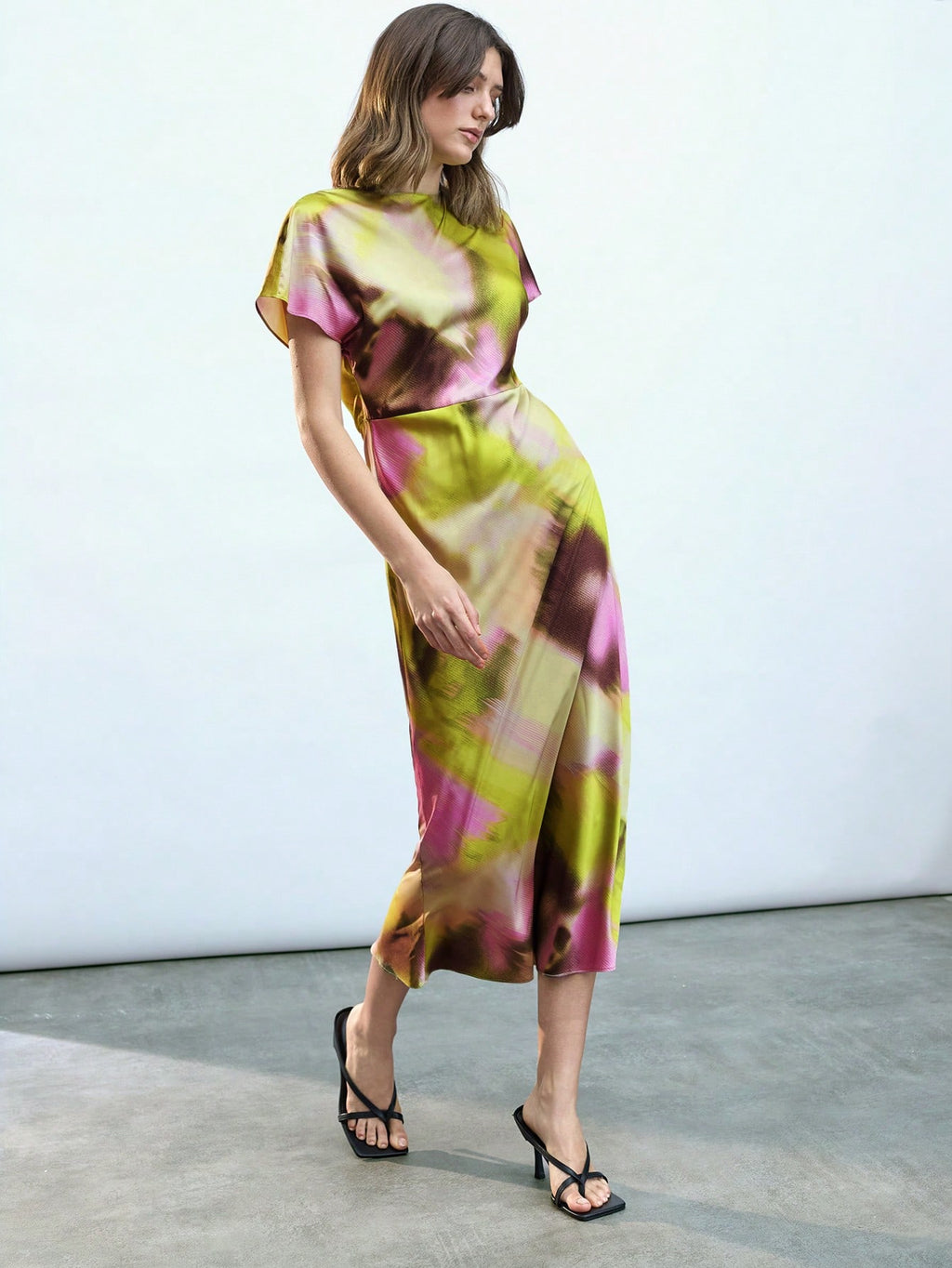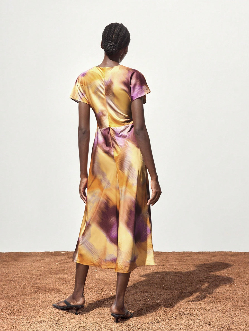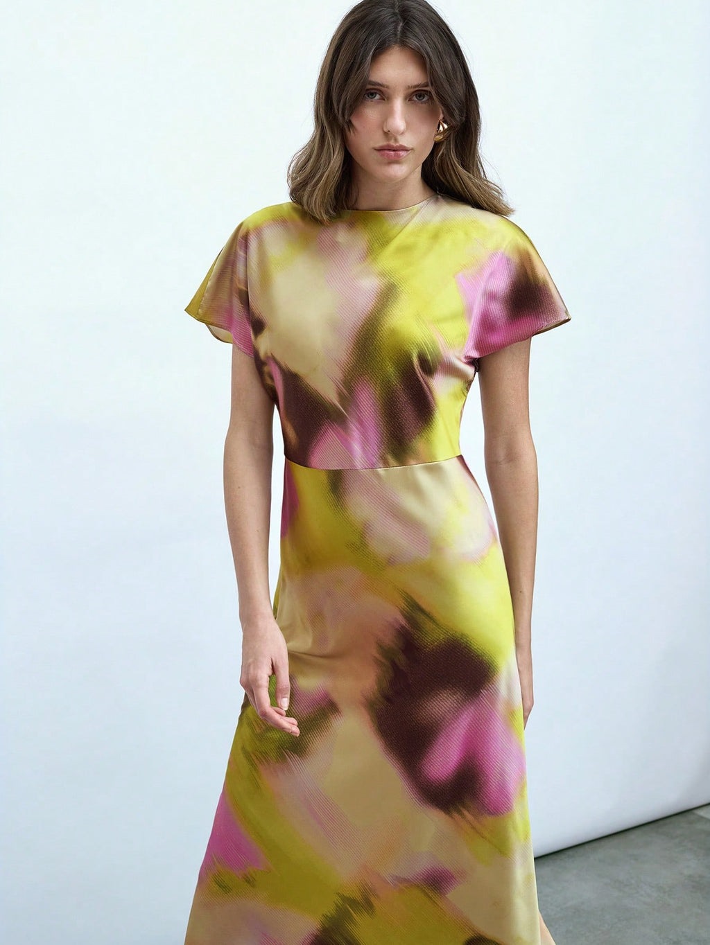 BELLAVOG Women's Elegant Romantic Tie Dye Print Silk Satin Short Sleeve Ruched Waist Long Dress, Suitable For Music Festivals, Easter