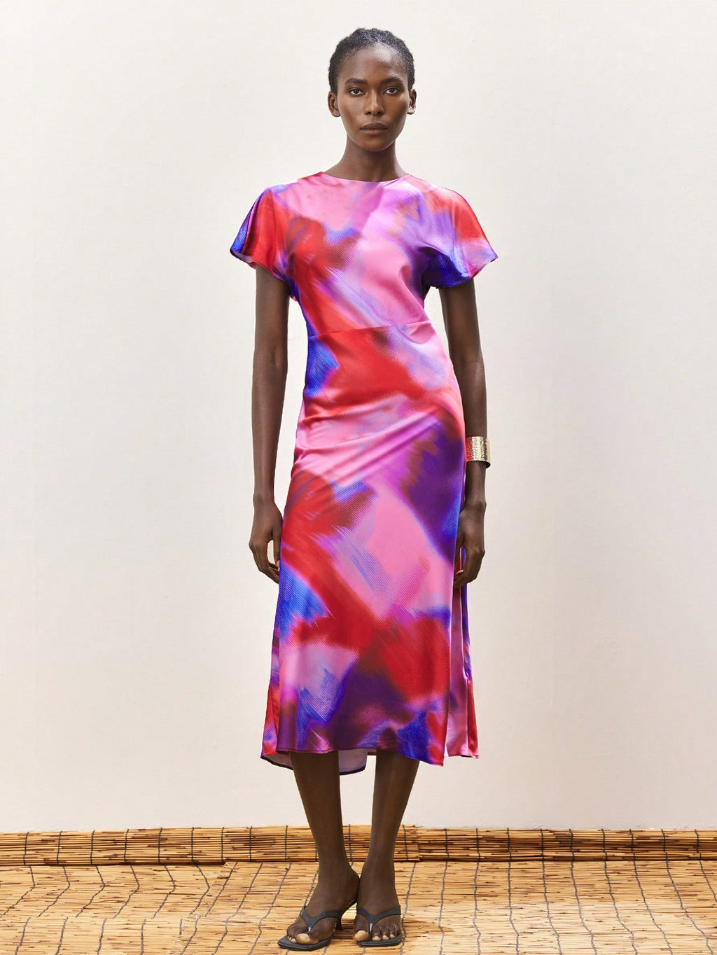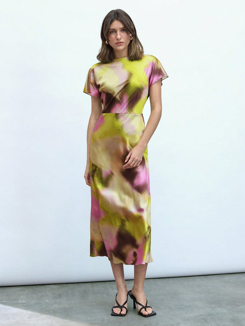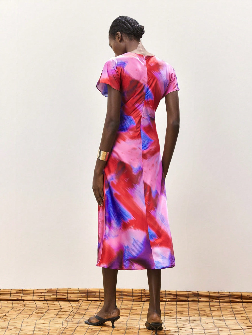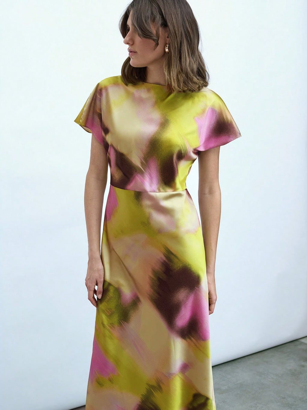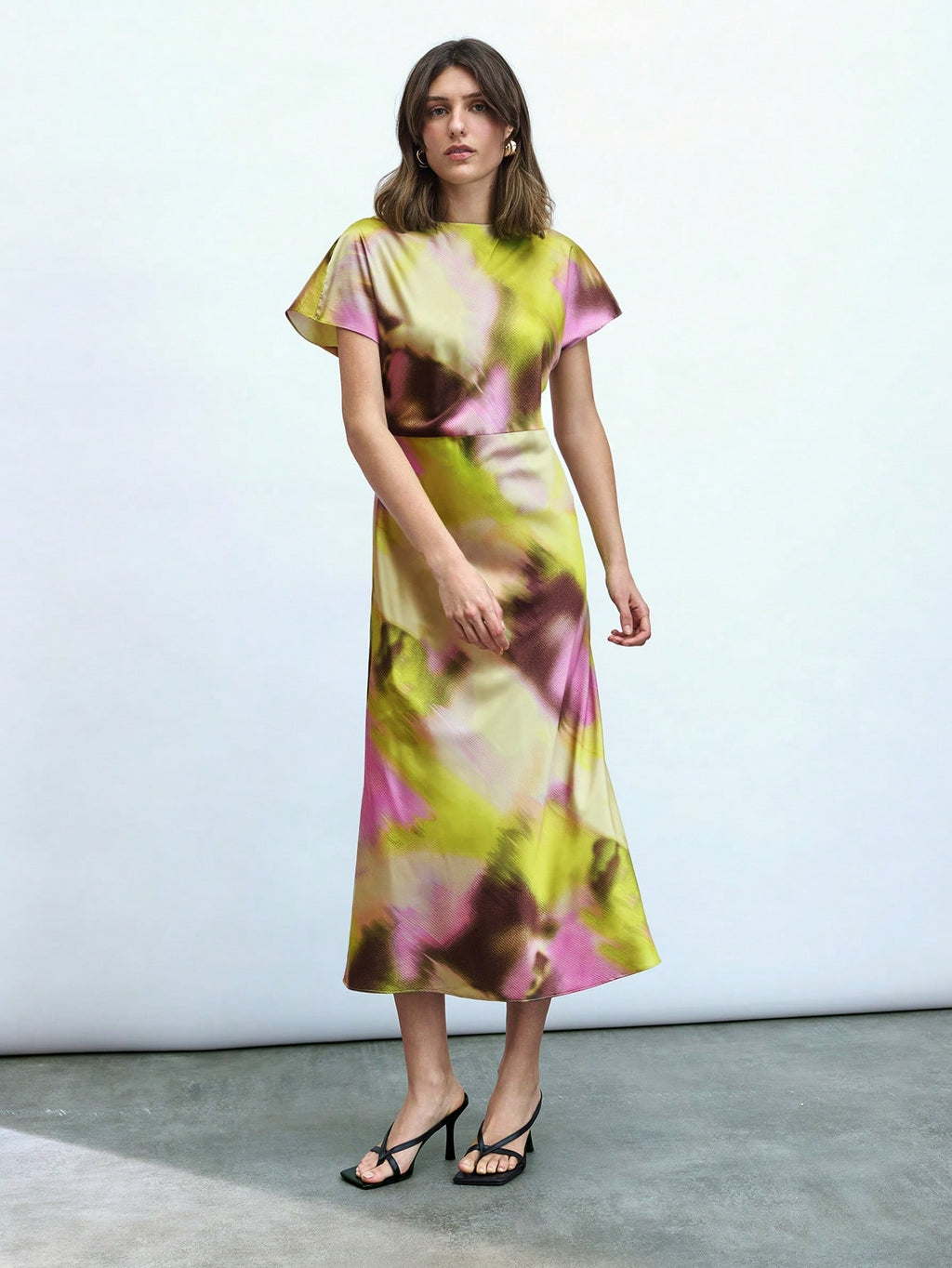 BELLAVOG Women's Elegant Romantic Tie Dye Print Silk Satin Short Sleeve Ruched Waist Long Dress, Suitable For Music Festivals, Easter