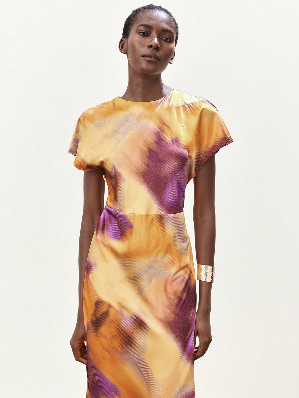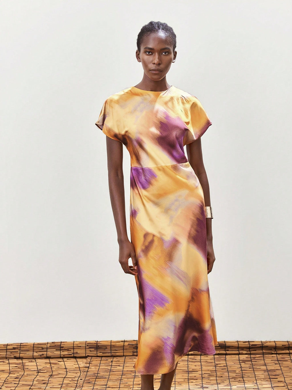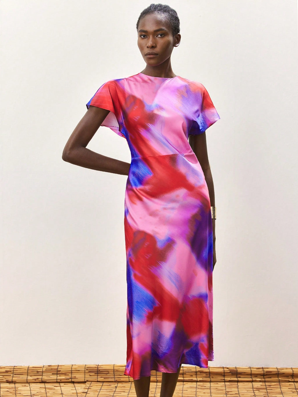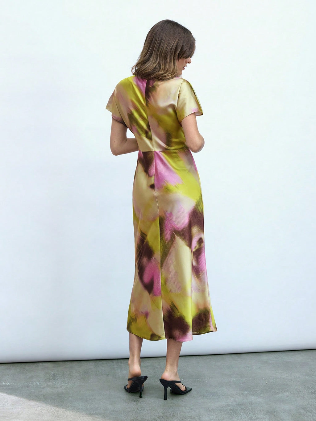 BELLAVOG Women's Elegant Romantic Tie Dye Print Silk Satin Short Sleeve Ruched Waist Long Dress, Suitable For Music Festivals, Easter