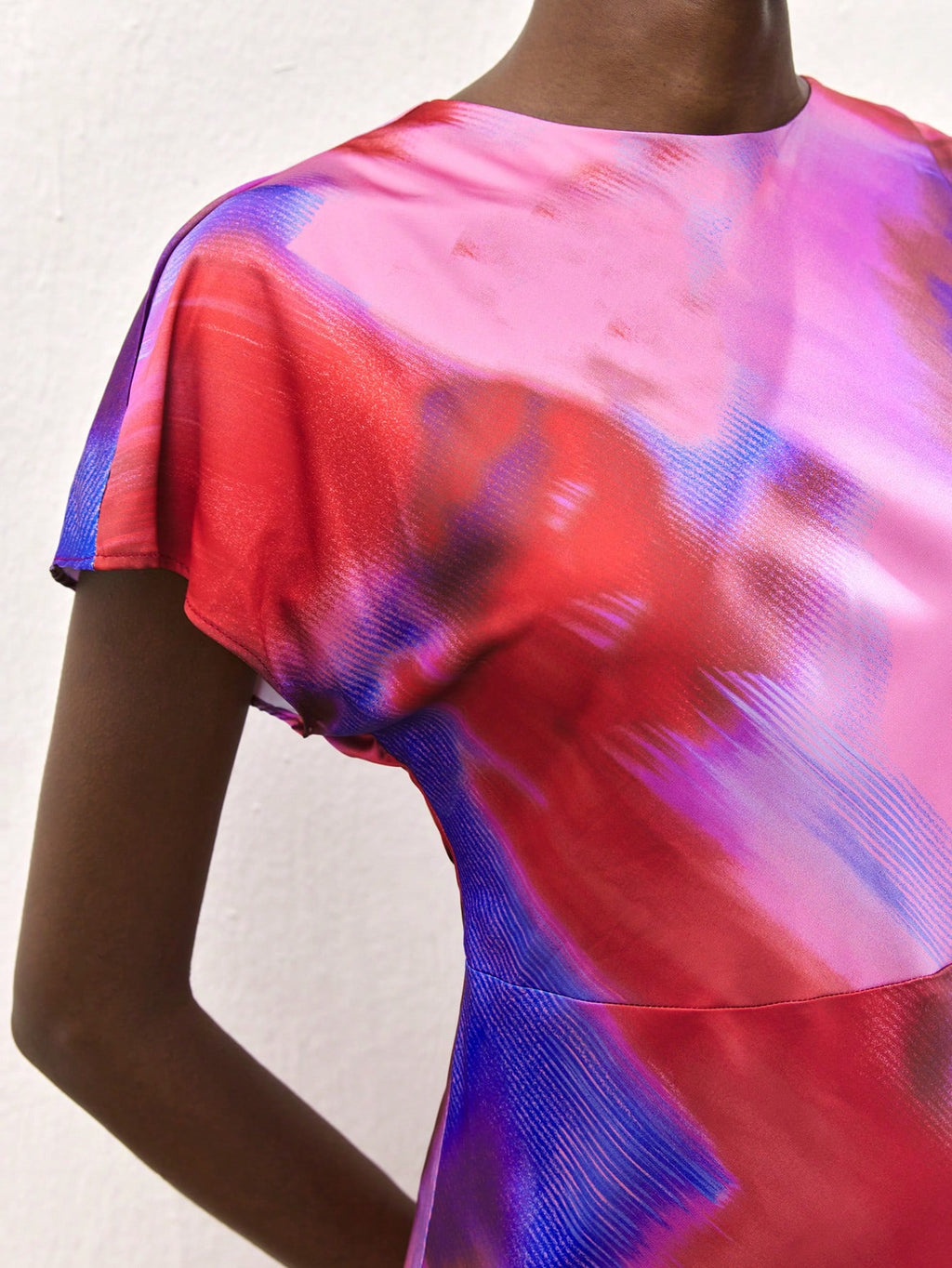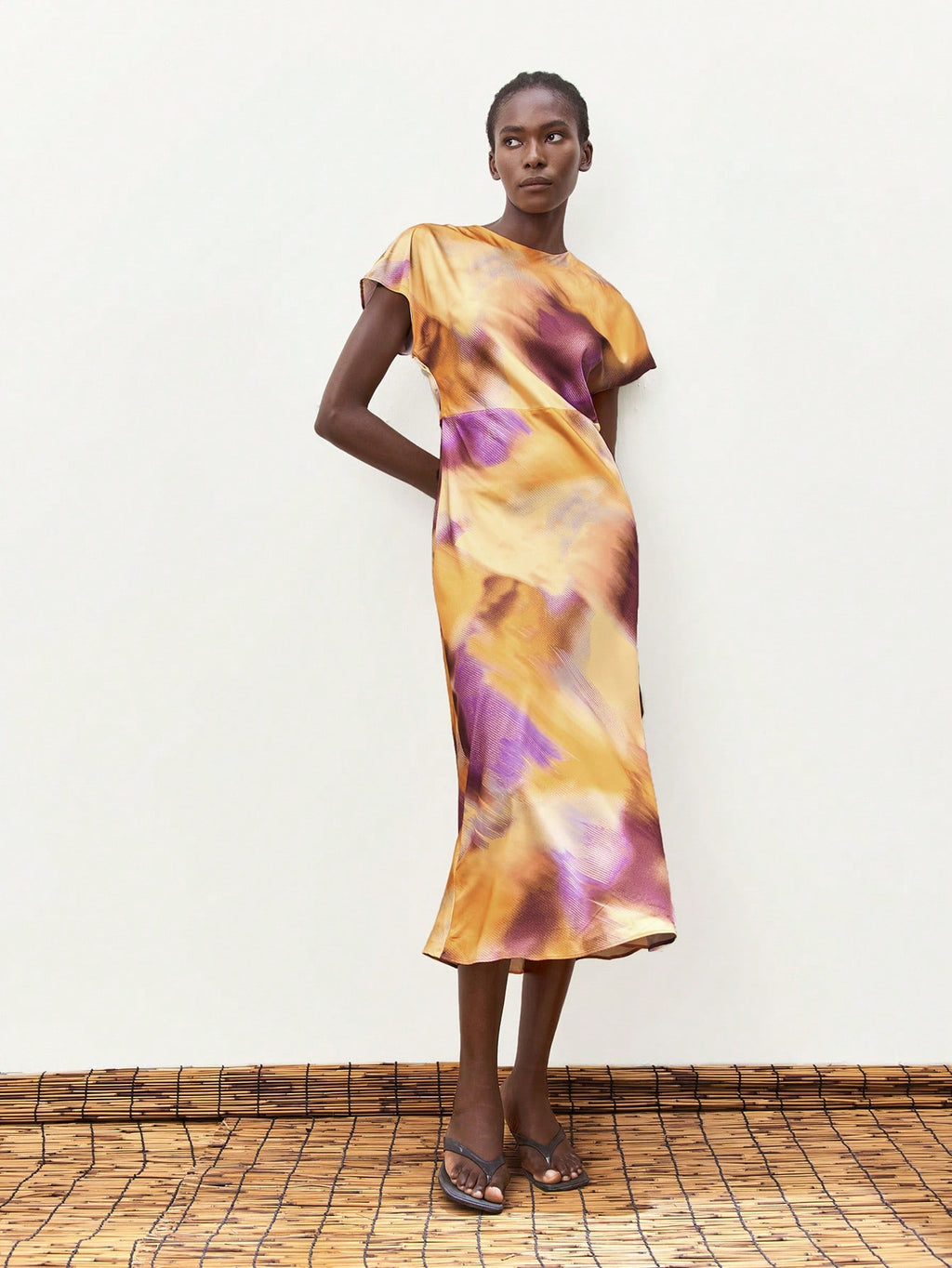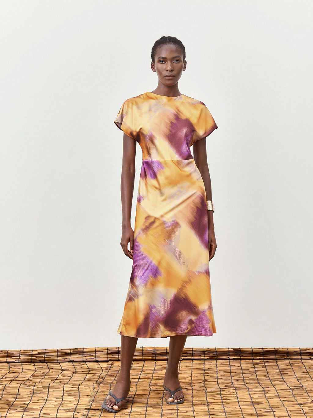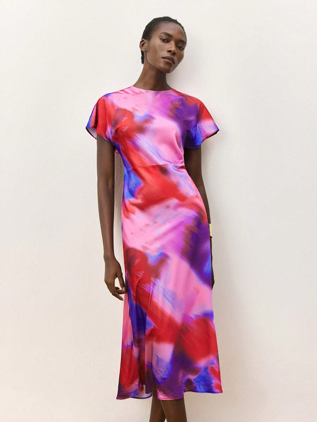 BELLAVOG Women's Elegant Romantic Tie Dye Print Silk Satin Short Sleeve Ruched Waist Long Dress, Suitable For Music Festivals, Easter