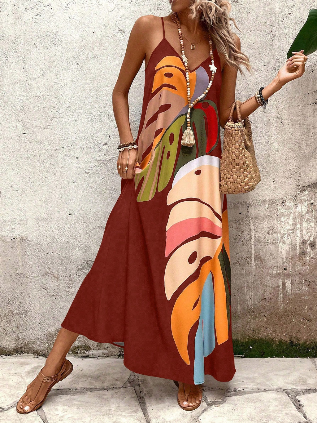BELLAVOG Women's Fashionable Colorful Leaf Printed Strappy Dress Maxi Women Outfit