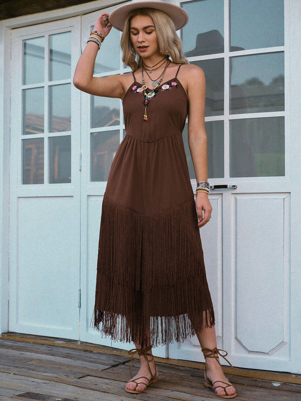 BELLAVOG Women's Fitted Western Style Embroidered Spaghetti Strap Tassel Hem Dress