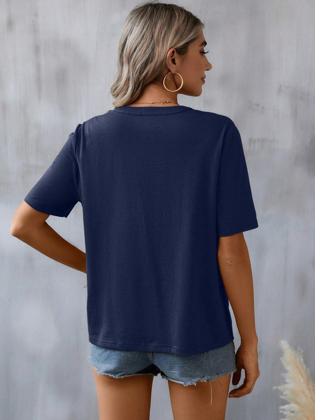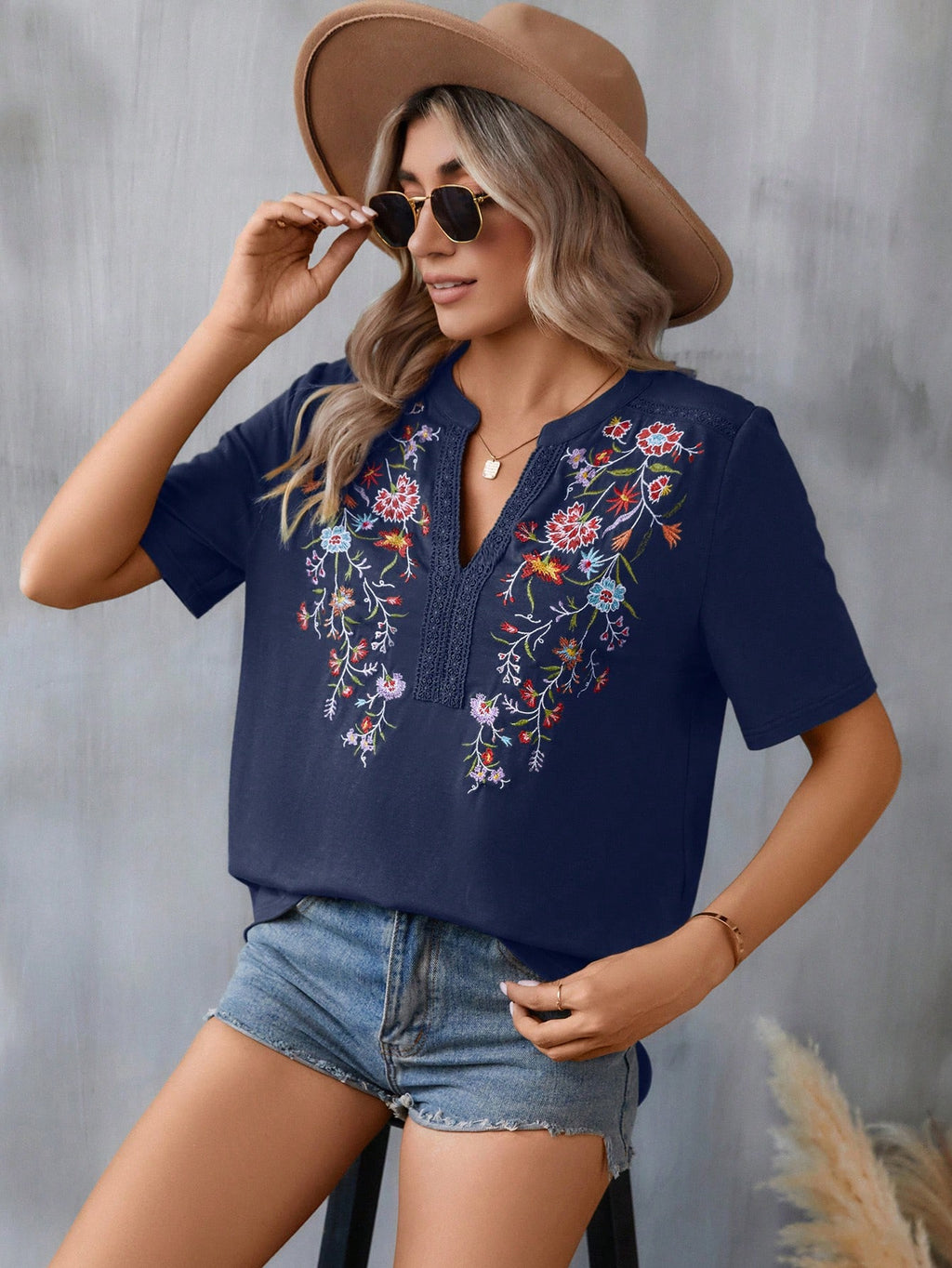 BELLAVOG Women's Floral Embroidery Notched Neck T-Shirt
