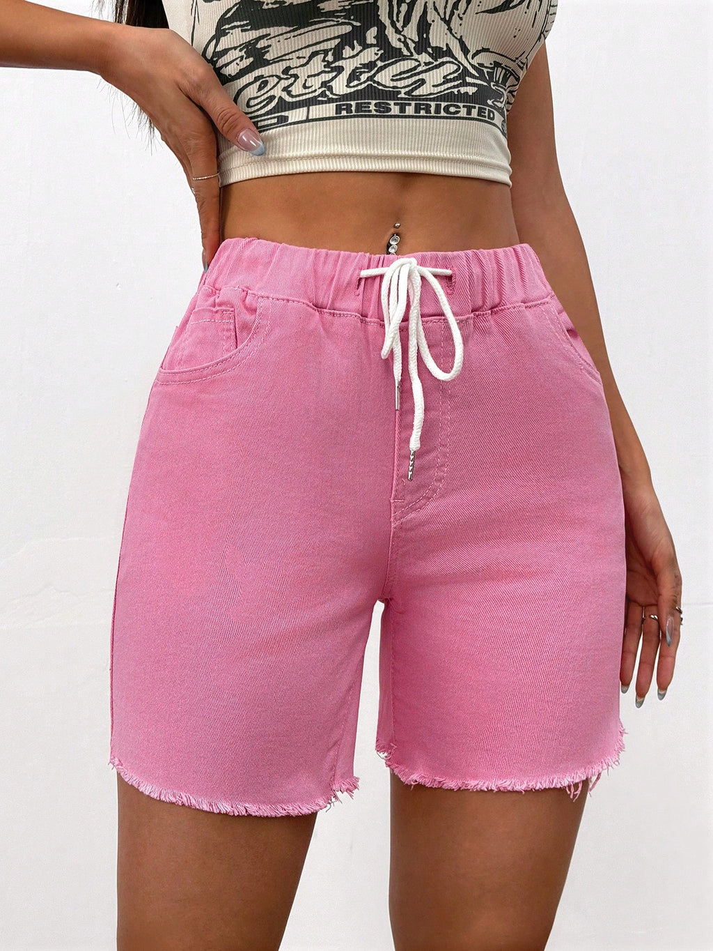 BELLAVOG Women's Frayed Hem Drawstring Denim Shorts With Patch Pockets