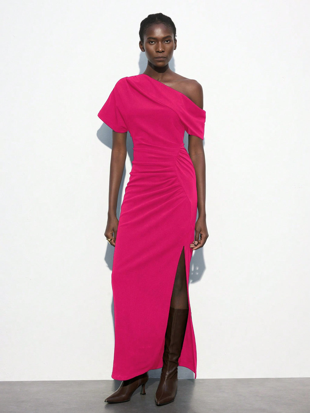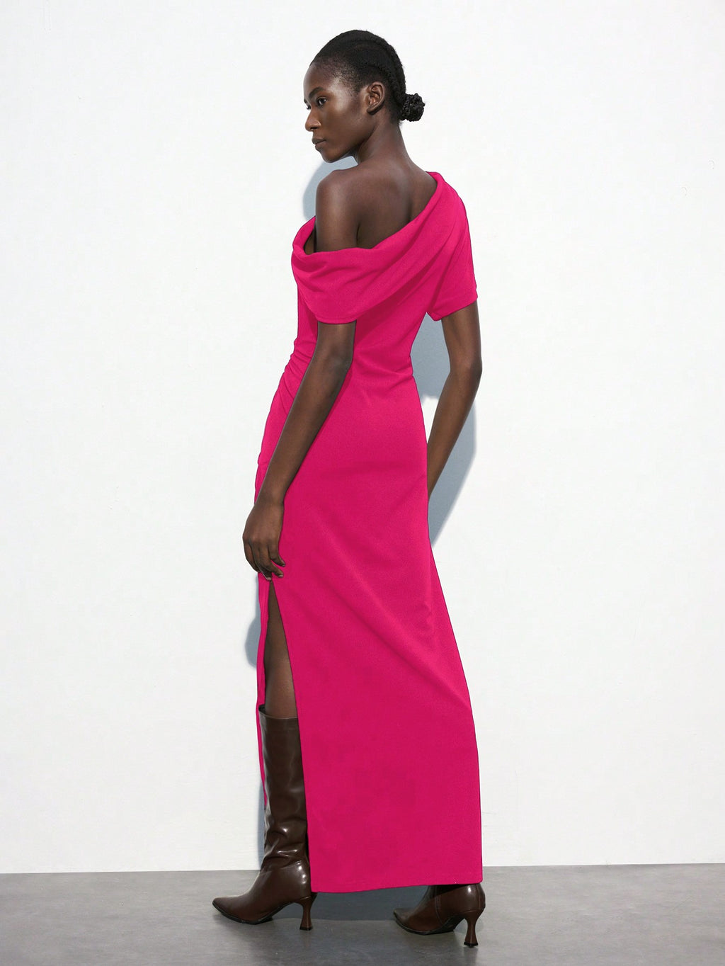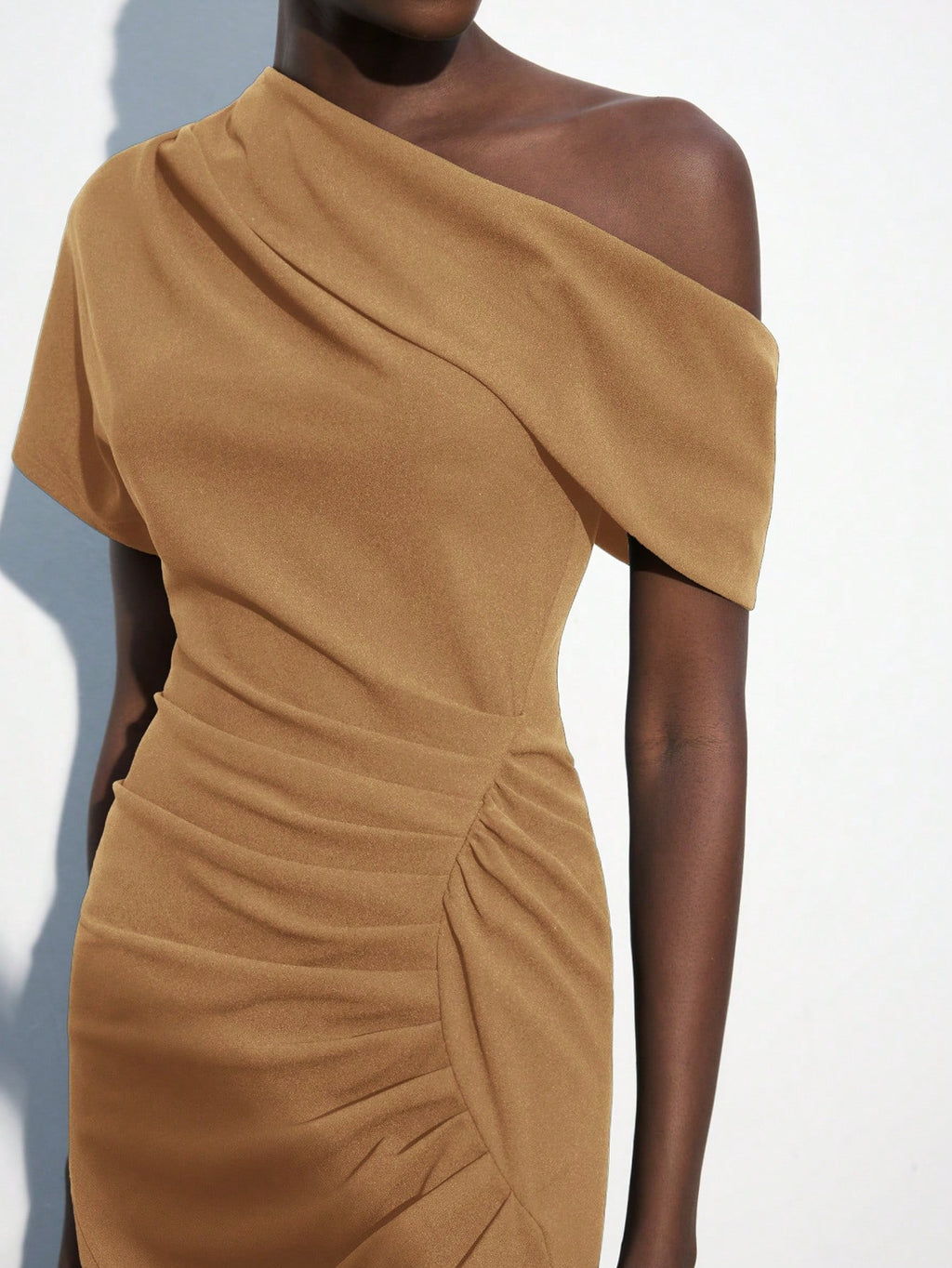 BELLAVOG Women's Khaki Versatile Spring/Summer Dress, Asymmetrical Neckline, Ruched Waist, High Slit, Sleeveless, Fitted, Elegant For Parties, Valentine's Day