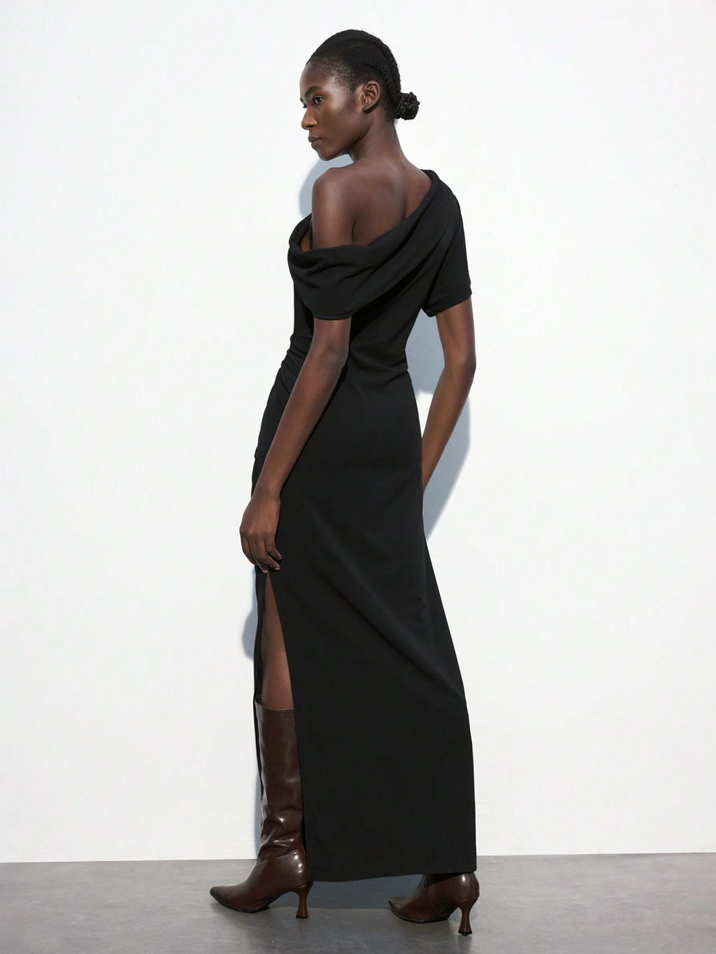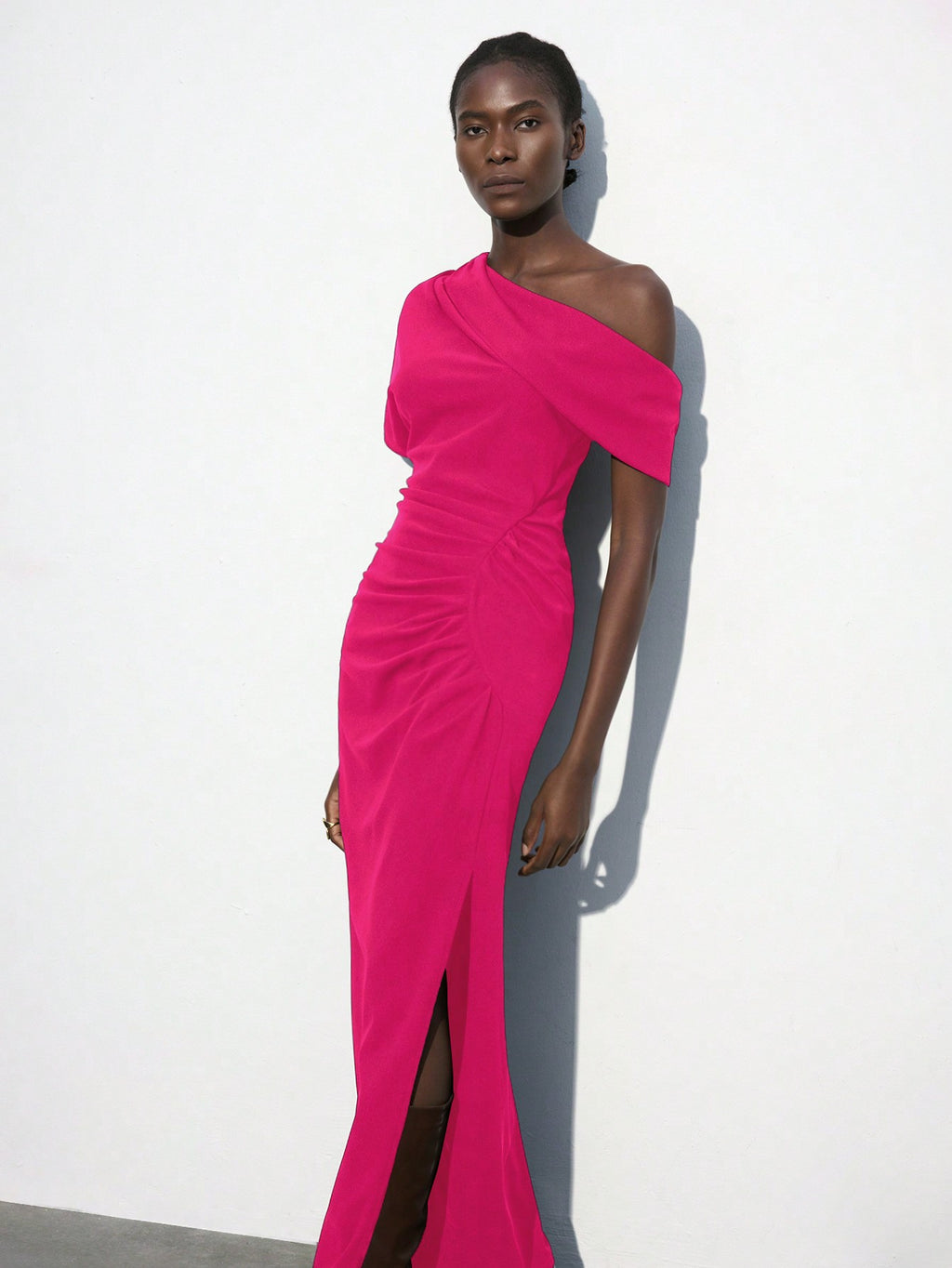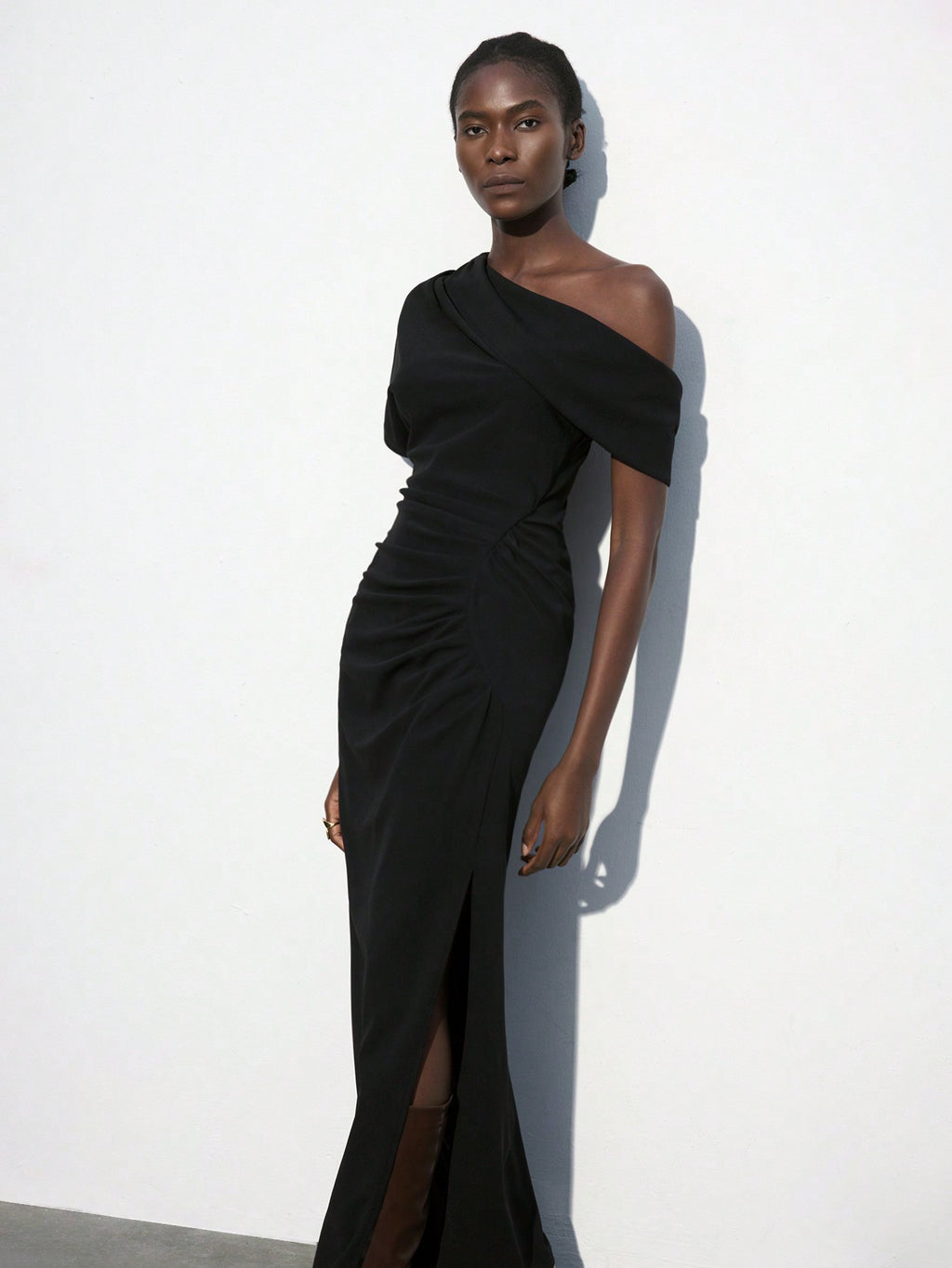 BELLAVOG Women's Khaki Versatile Spring/Summer Dress, Asymmetrical Neckline, Ruched Waist, High Slit, Sleeveless, Fitted, Elegant For Parties, Valentine's Day