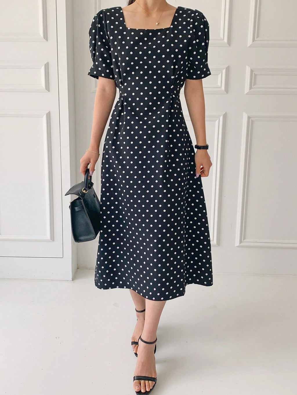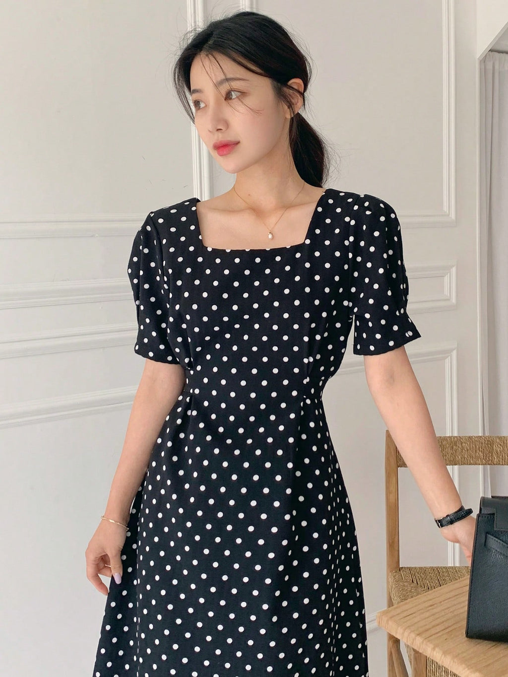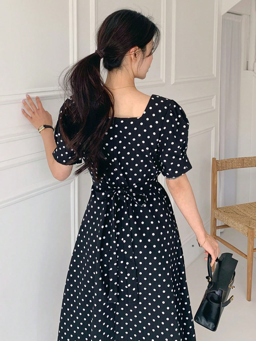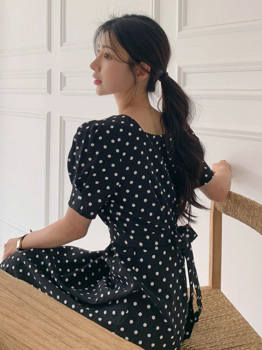 BELLAVOG Women's Mini Square Collar Polka Dot Puff Sleeve Bow Tie Waist Elegant Mid-Length Dress Milkmaid Dress Women S Summer Blouses Women S Top Women S Summer Set