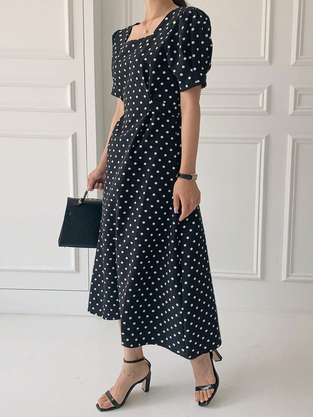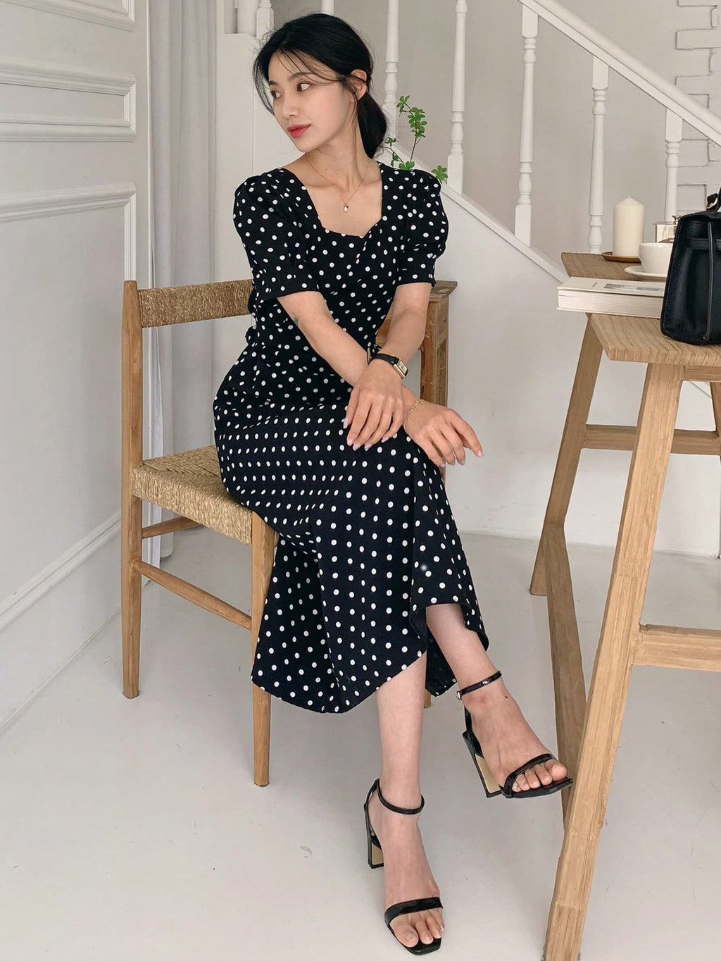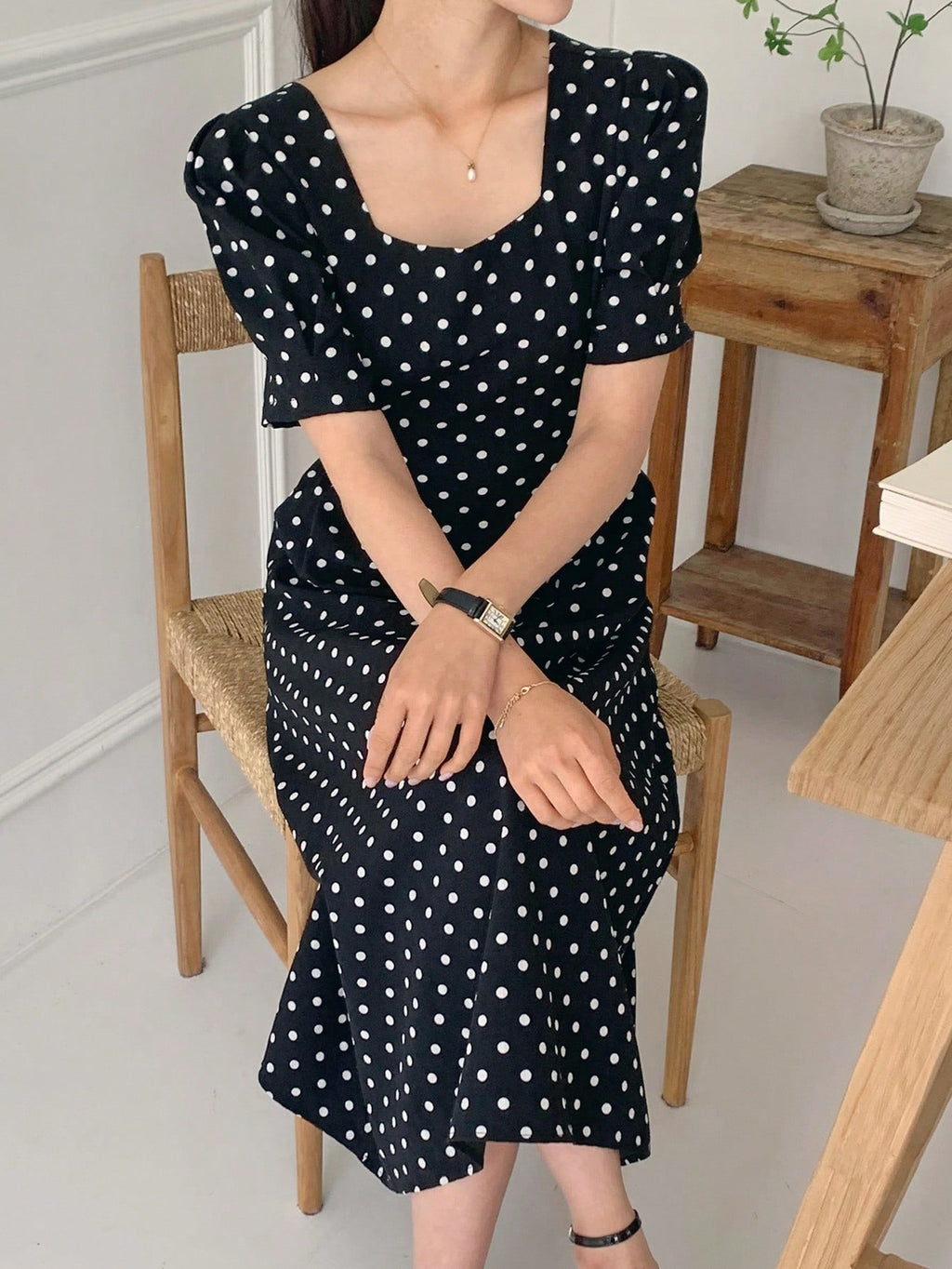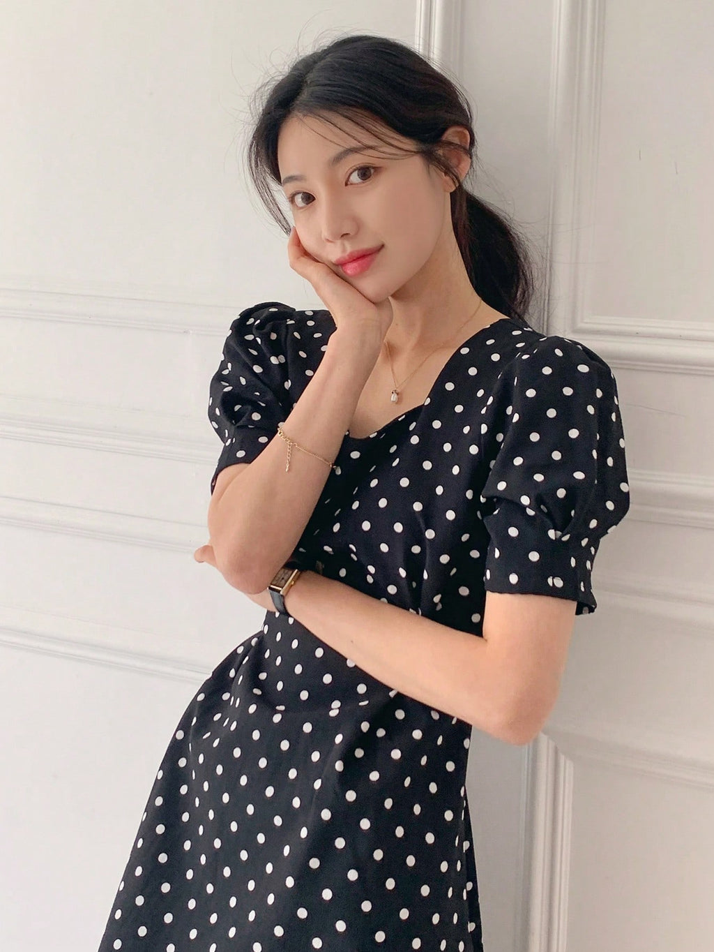 BELLAVOG Women's Mini Square Collar Polka Dot Puff Sleeve Bow Tie Waist Elegant Mid-Length Dress Milkmaid Dress Women S Summer Blouses Women S Top Women S Summer Set