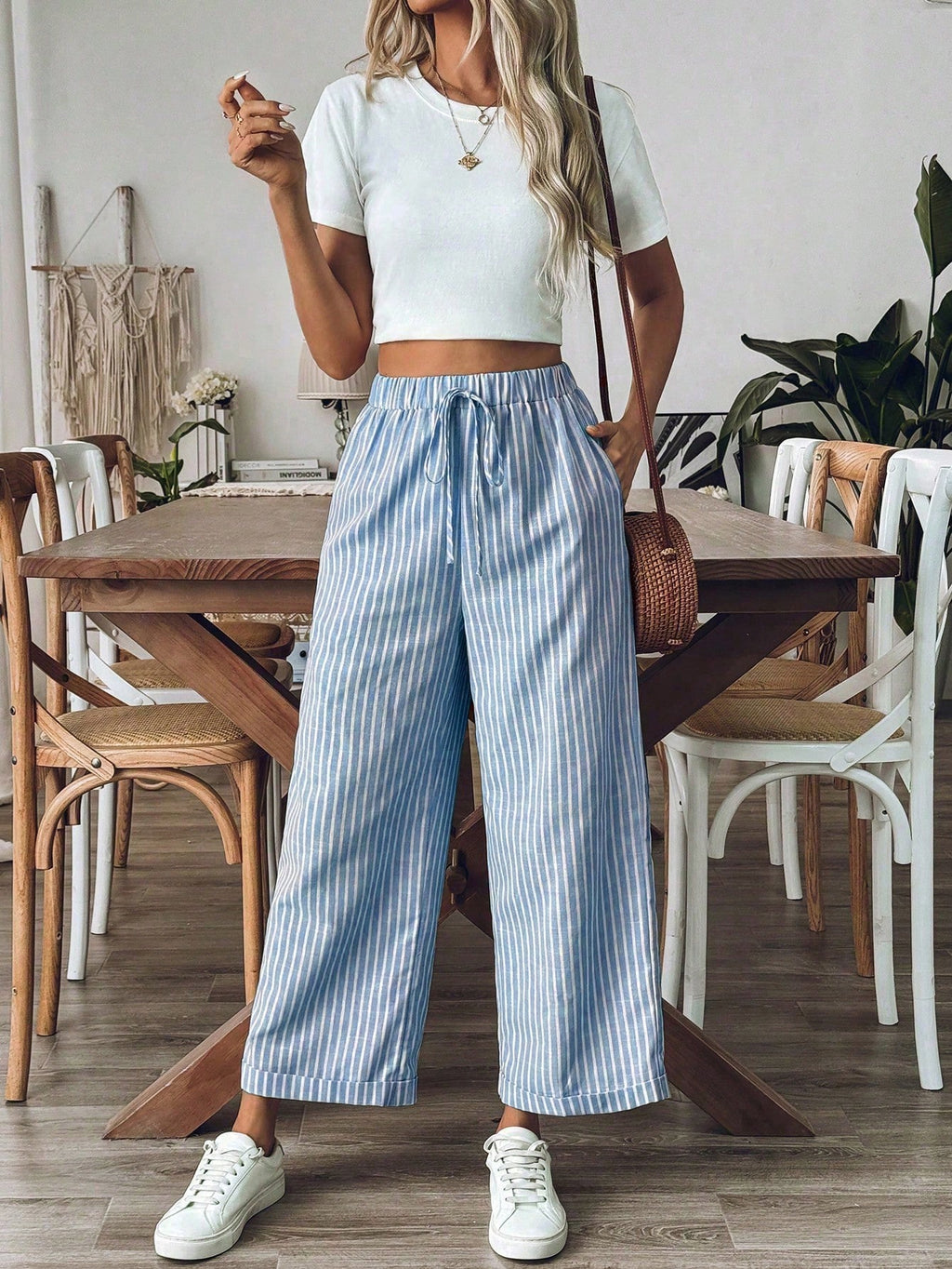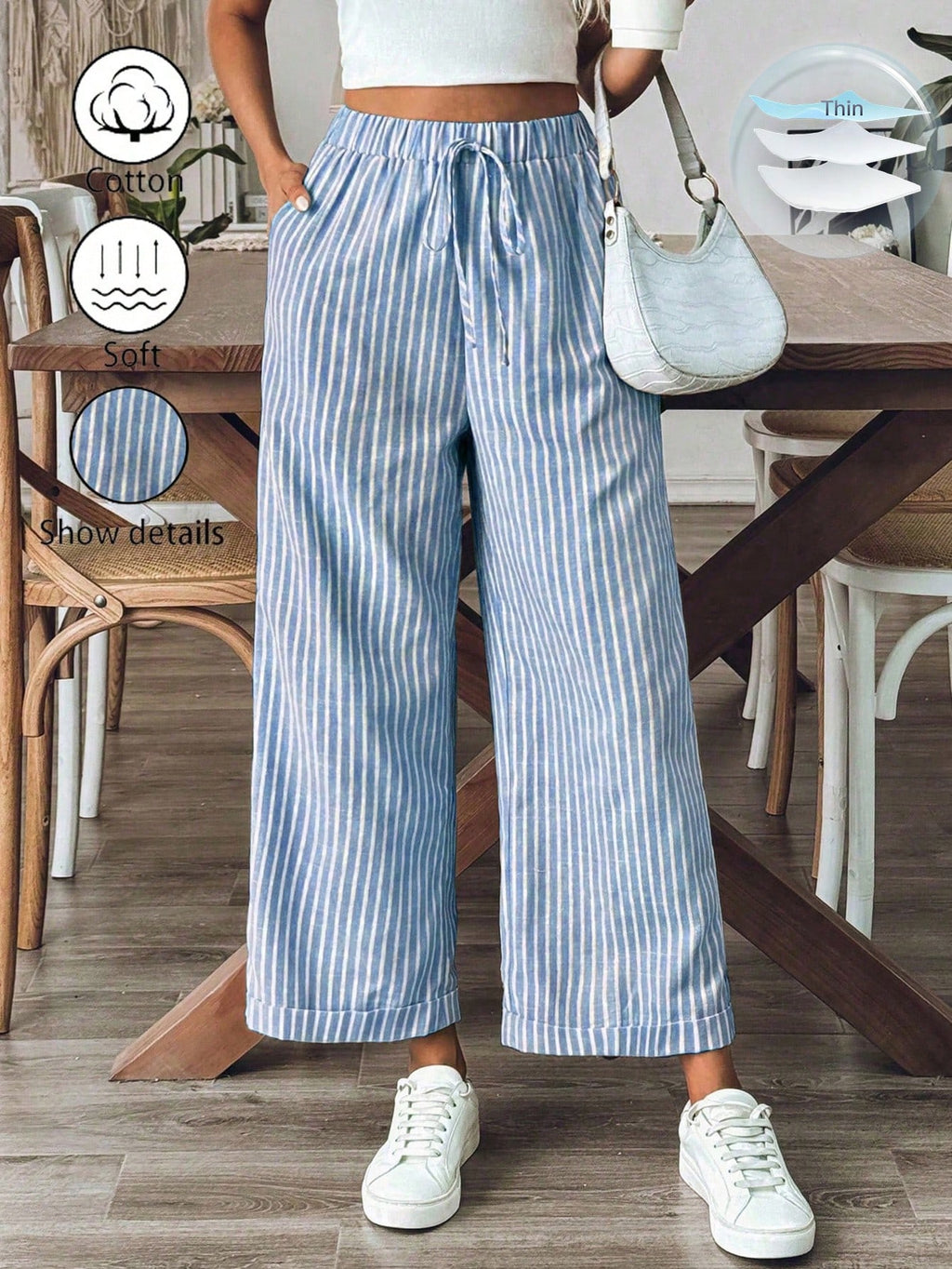 BELLAVOG Women's Old Money Style Striped Wide-Leg Belted Daily Wear Casual Straight Pants,Old Money Outfits