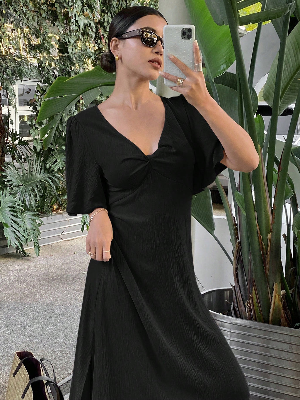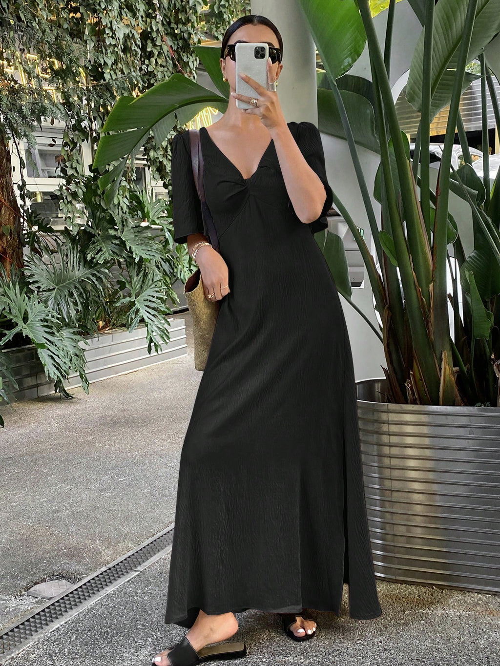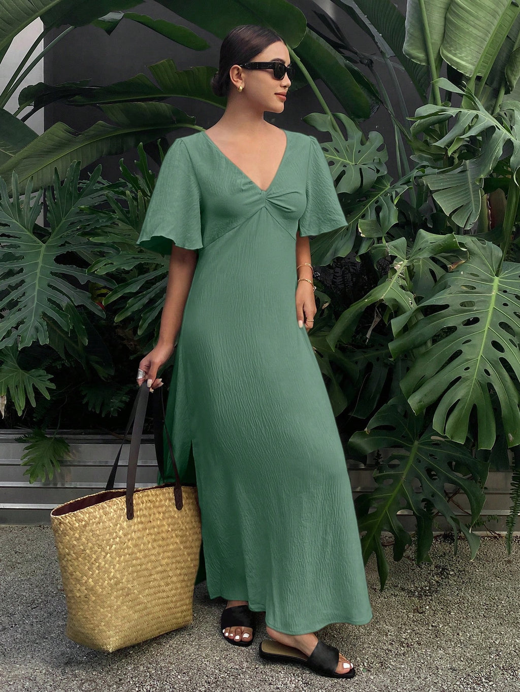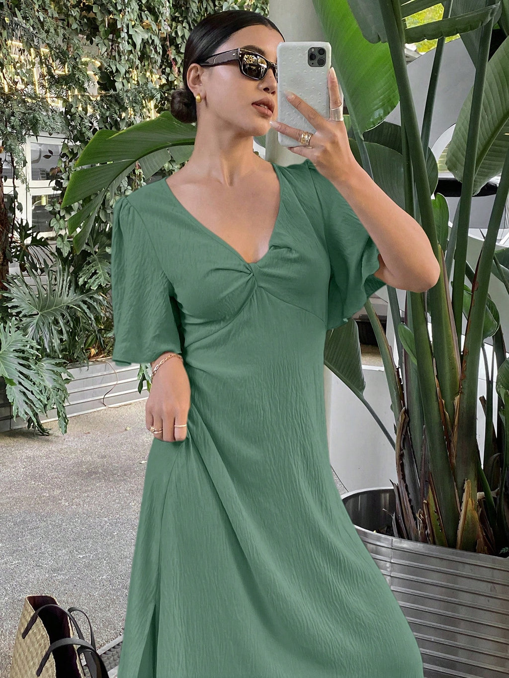 BELLAVOG Women's Solid Color V-Neck Short Sleeve Twist Knot Elegant Dress,Bohemia