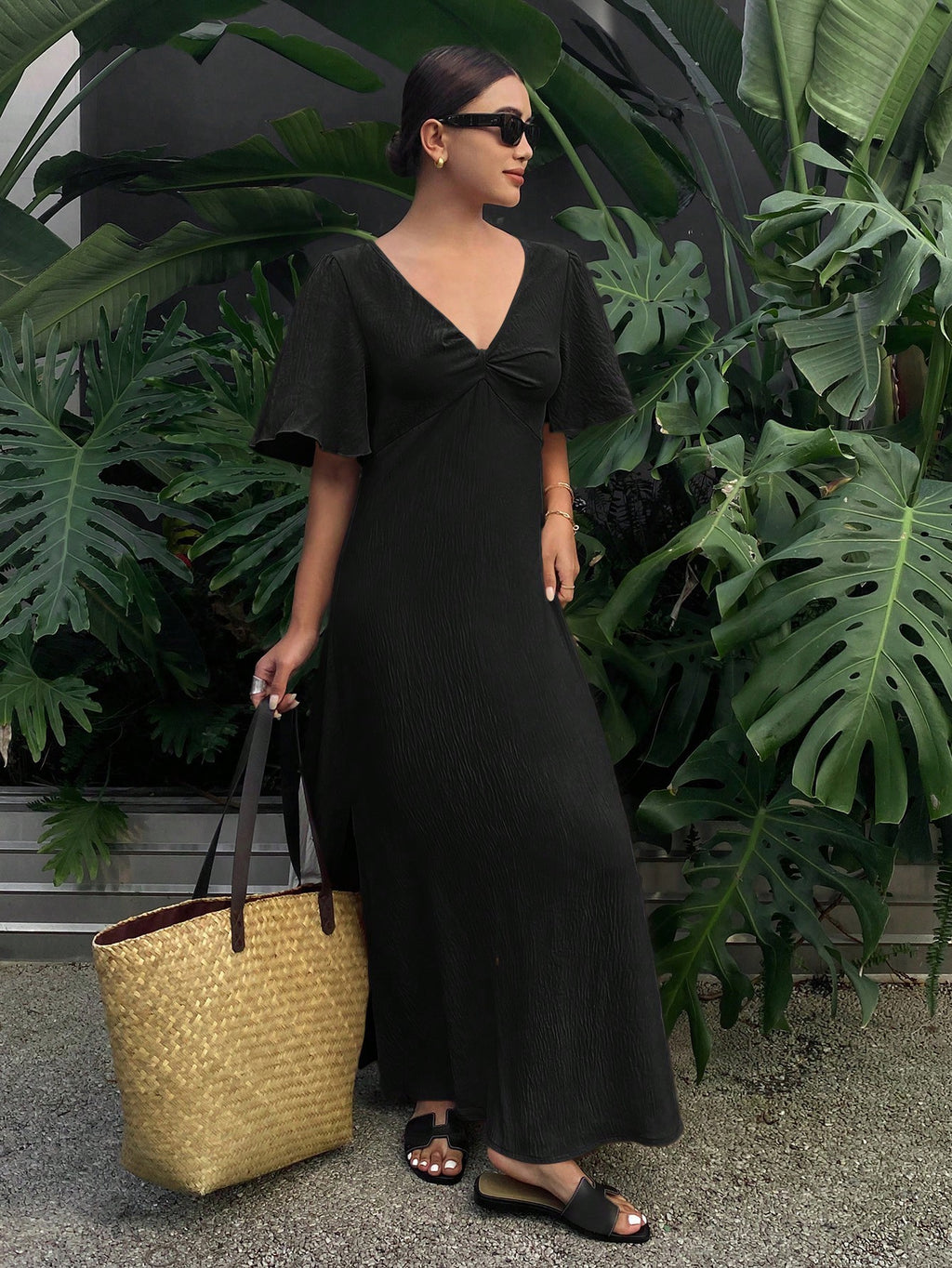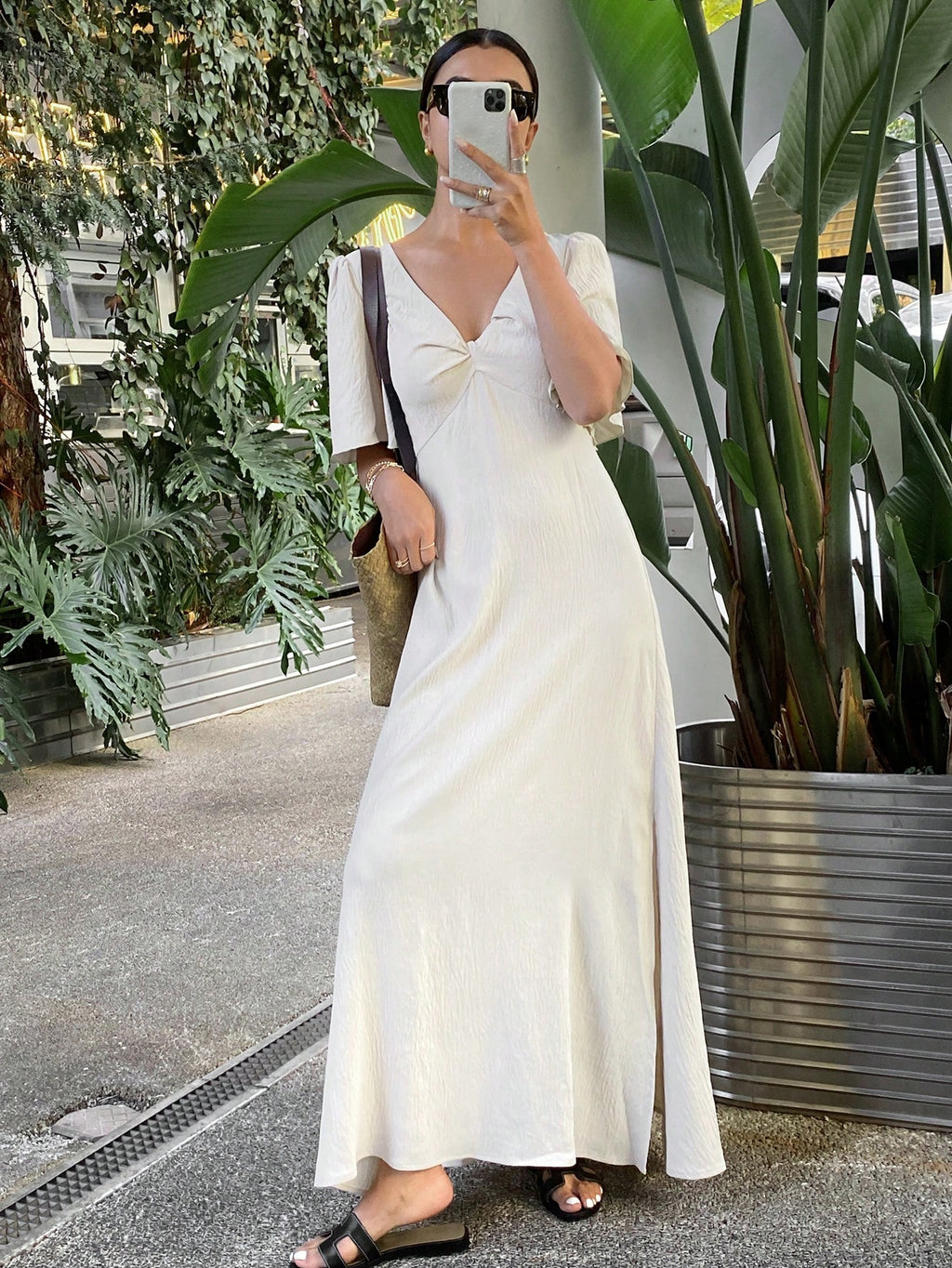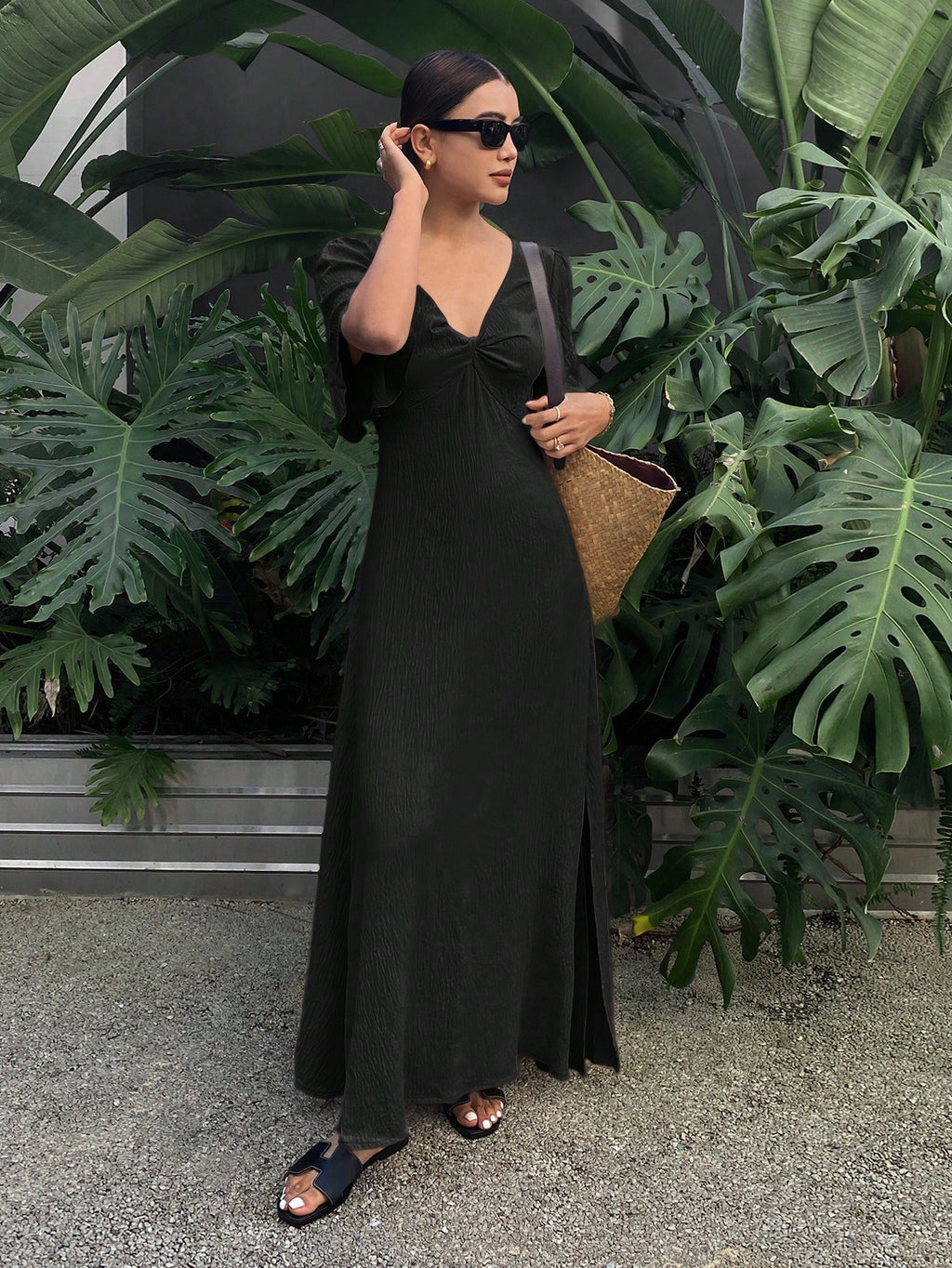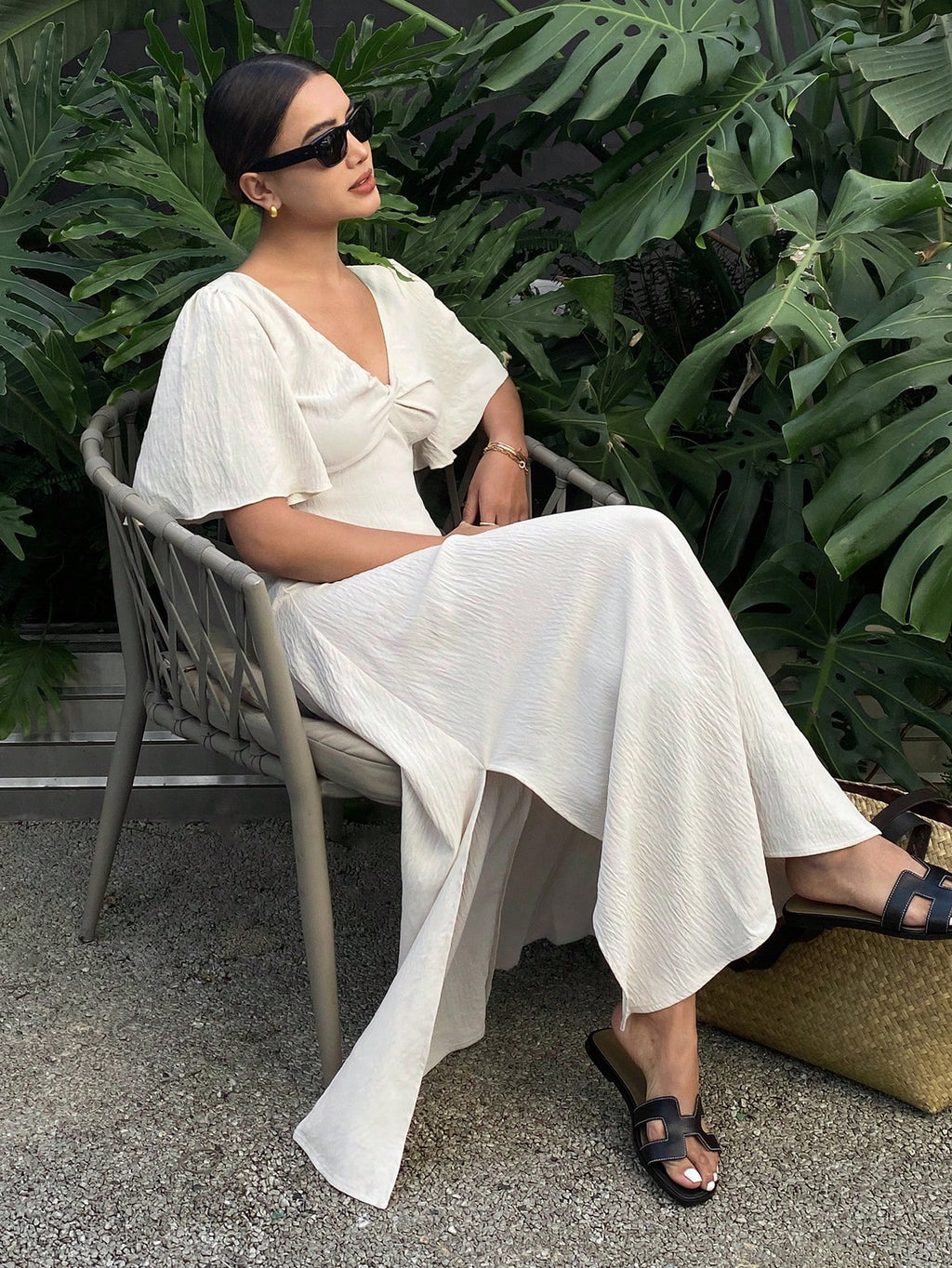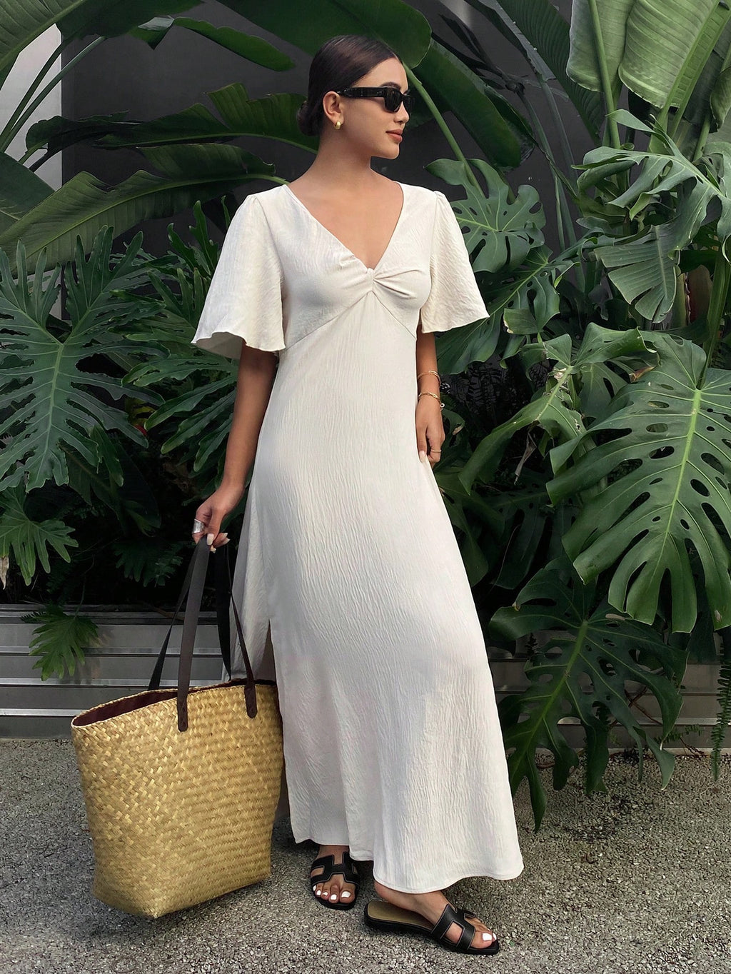 BELLAVOG Women's Solid Color V-Neck Short Sleeve Twist Knot Elegant Dress,Bohemia