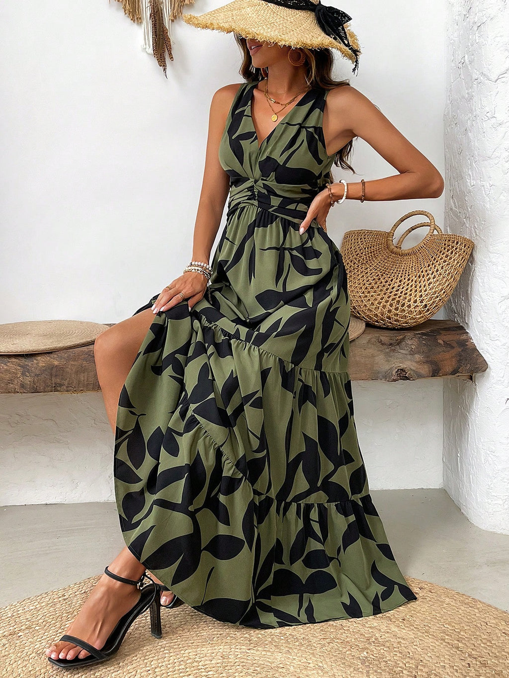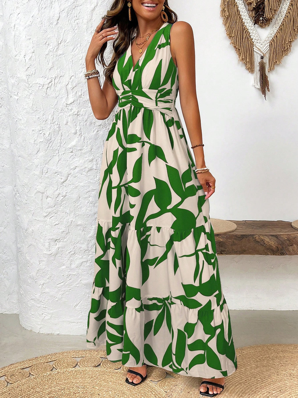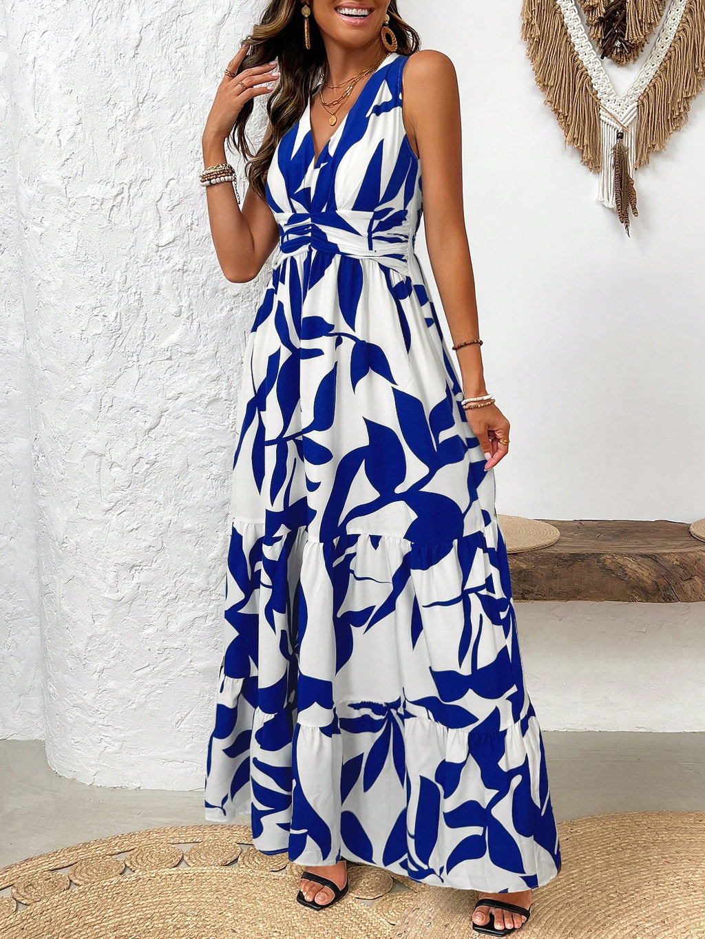 BELLAVOG Women's V-Neck Sleeveless Dress With All-Over Print And Ruffled Hemline For Summer Maxi Vacation Beach Outfit