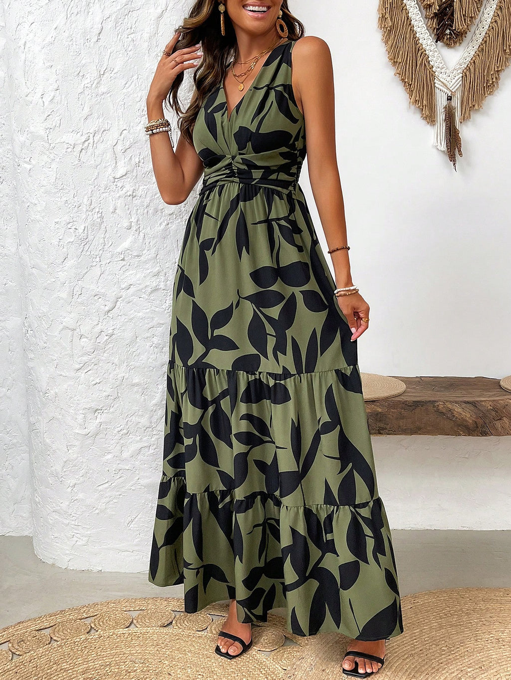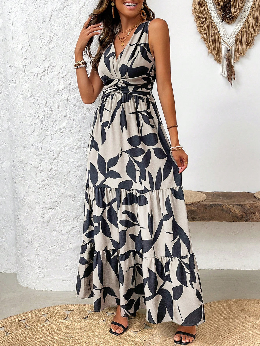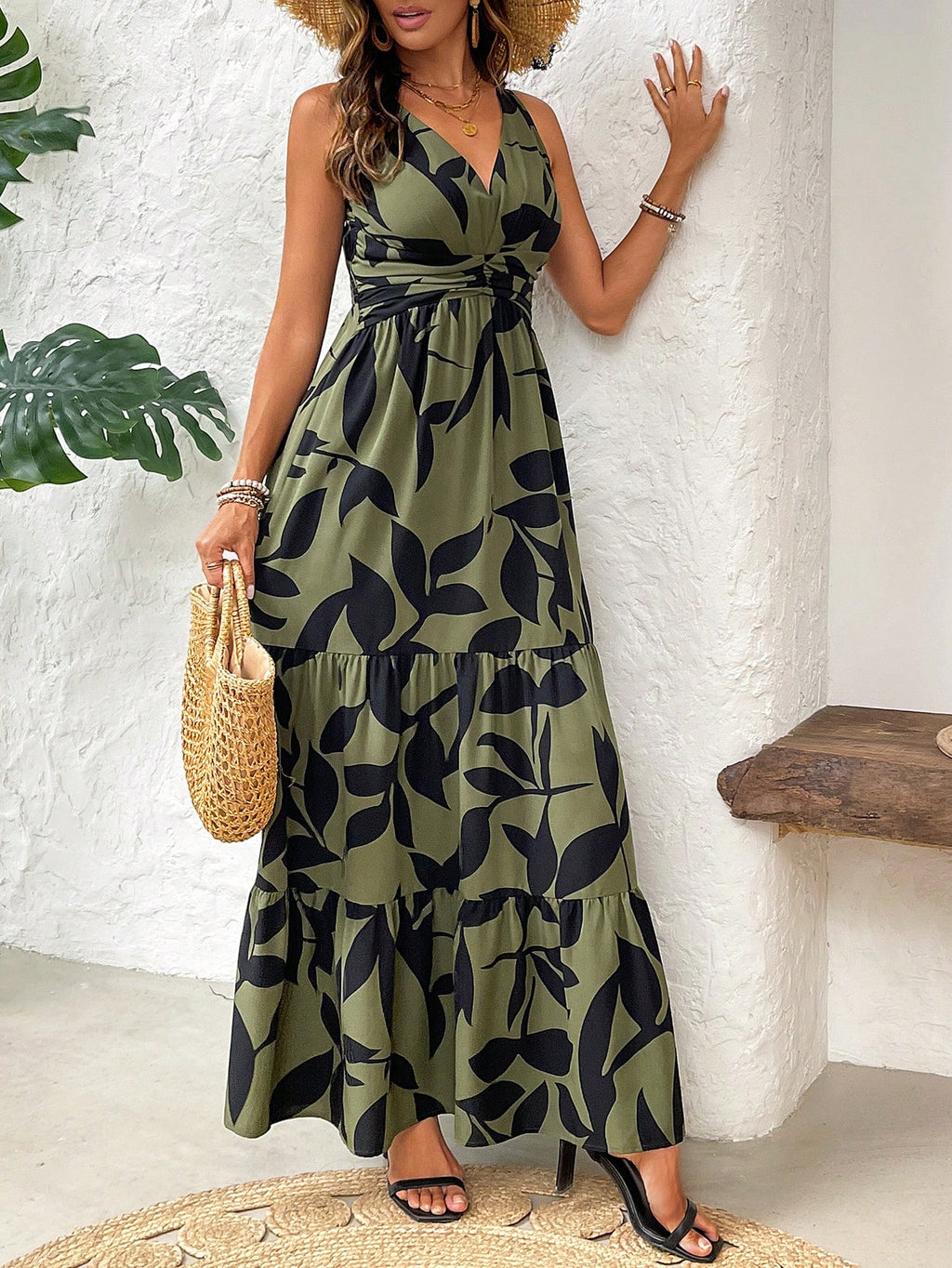 BELLAVOG Women's V-Neck Sleeveless Dress With All-Over Print And Ruffled Hemline For Summer Maxi Vacation Beach Outfit
