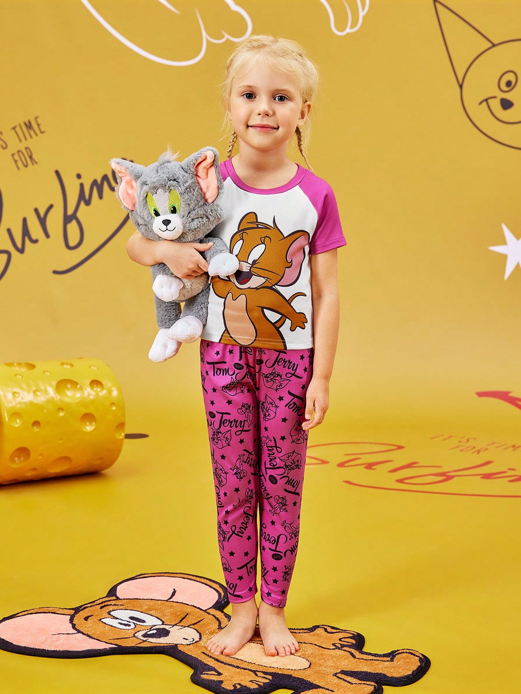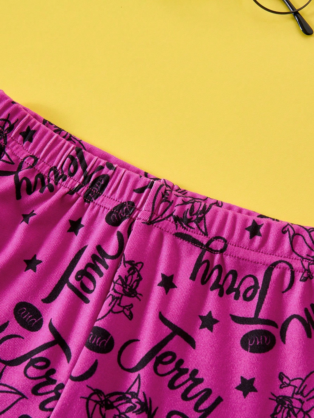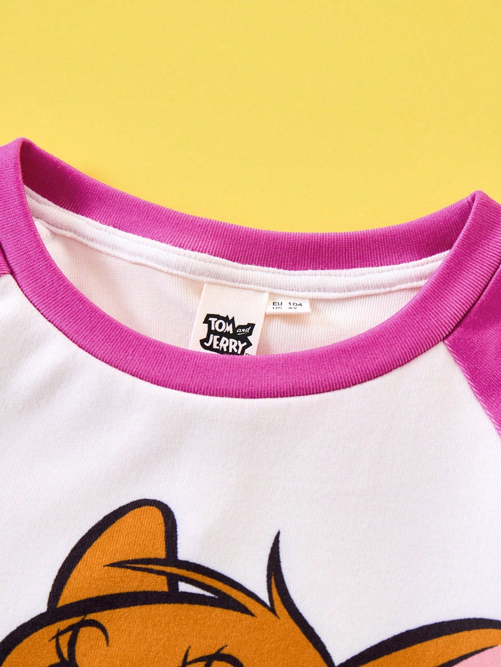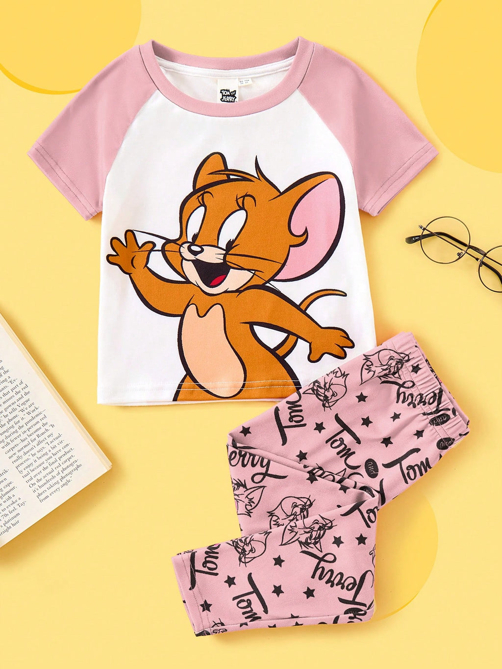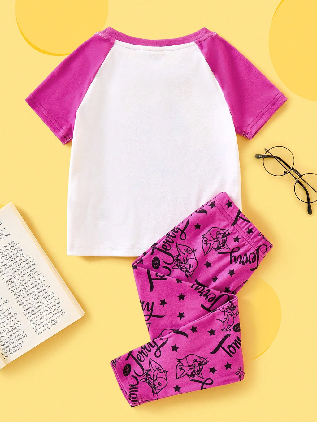 BELLAVOG Young Girl Cartoon Print Contrast Color Raglan Sleeve T-Shirt And Comfortable Stretch Pants Pink Snug Fit Pajama Set