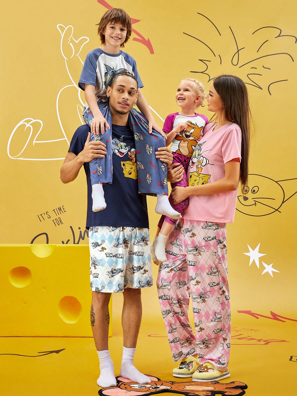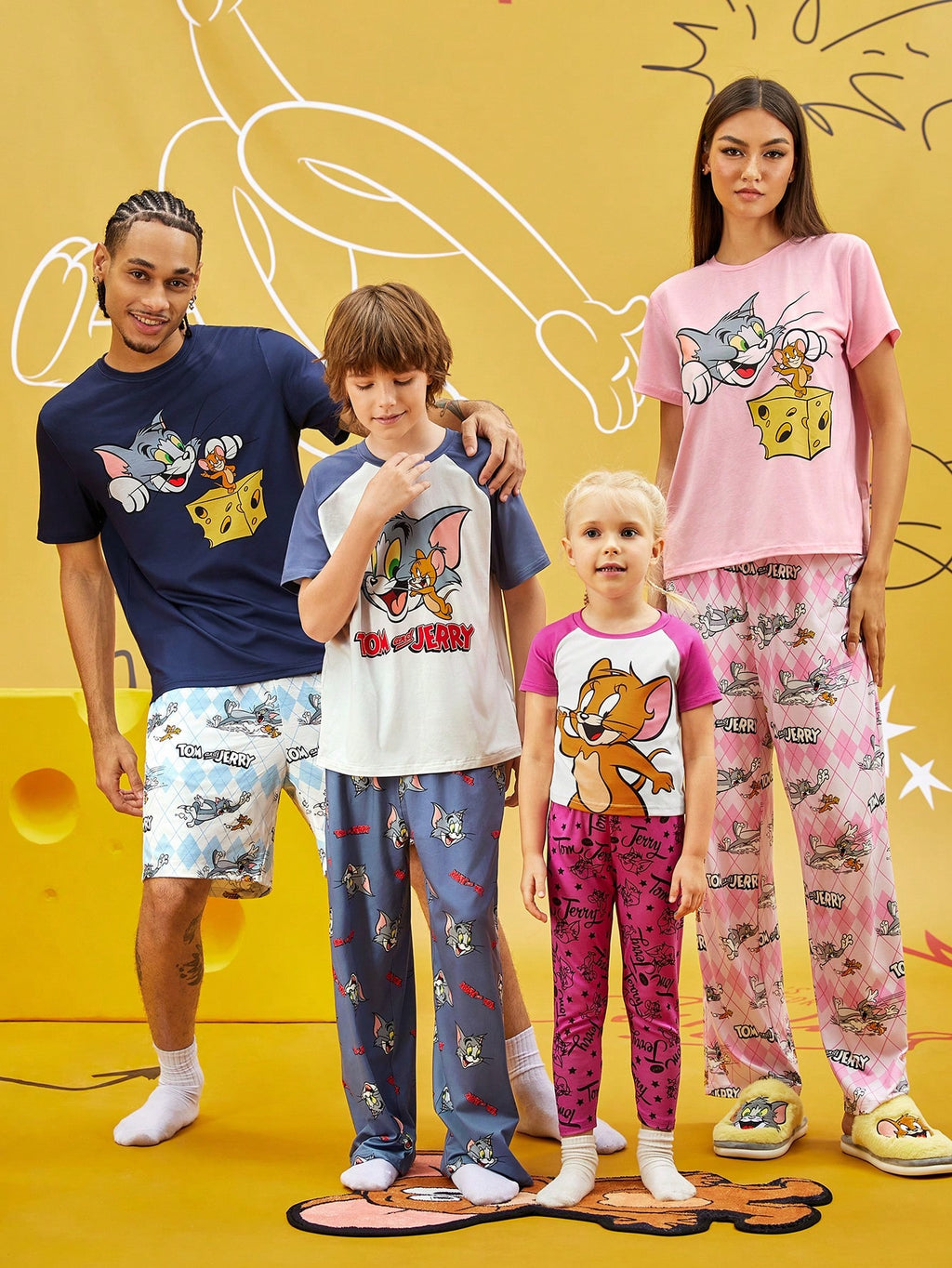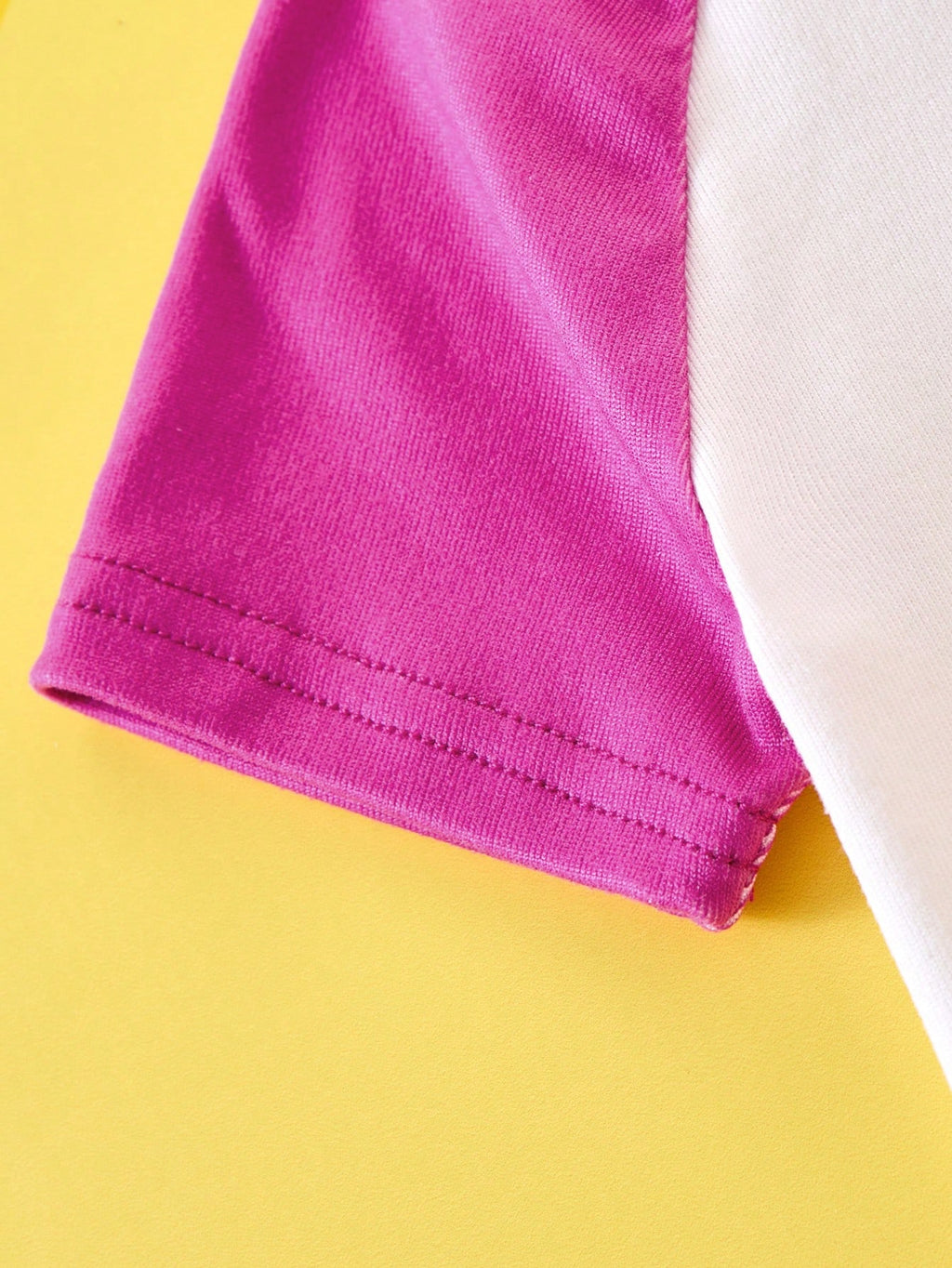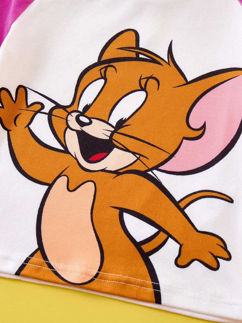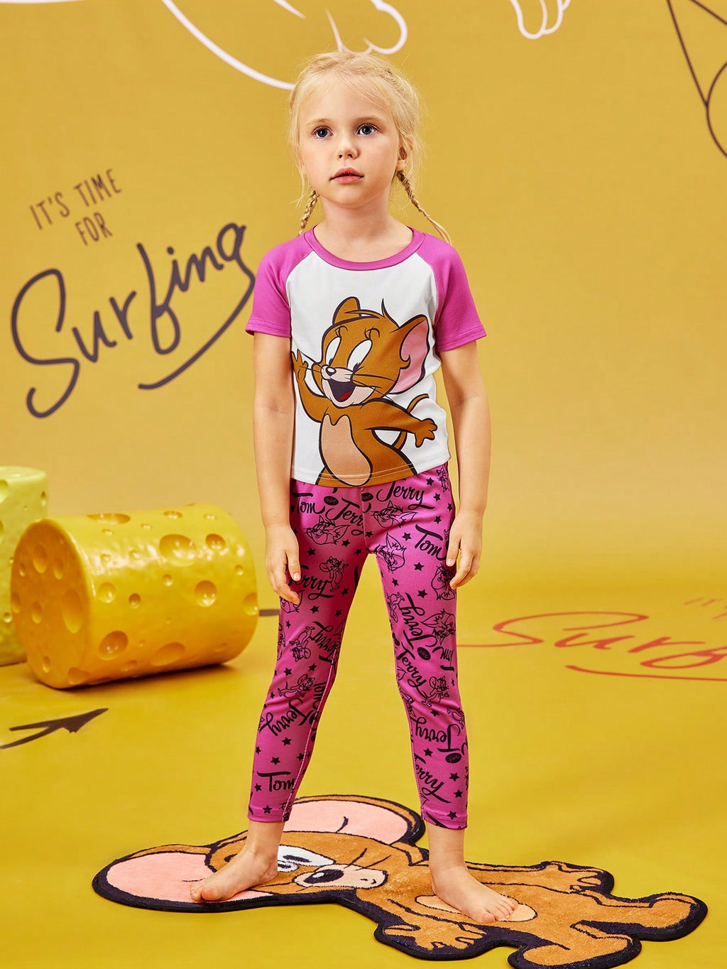 BELLAVOG Young Girl Cartoon Print Contrast Color Raglan Sleeve T-Shirt And Comfortable Stretch Pants Pink Snug Fit Pajama Set