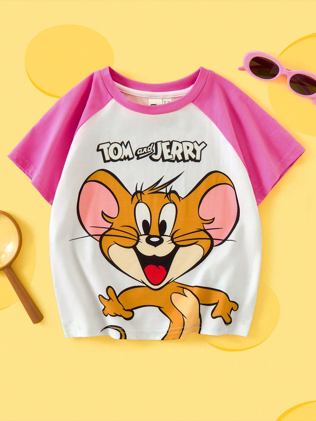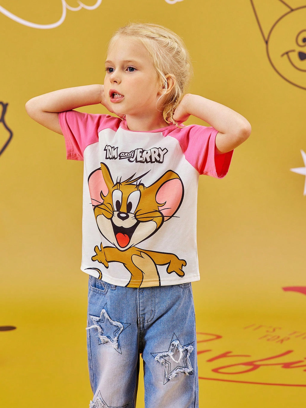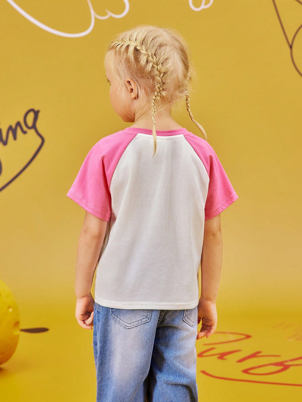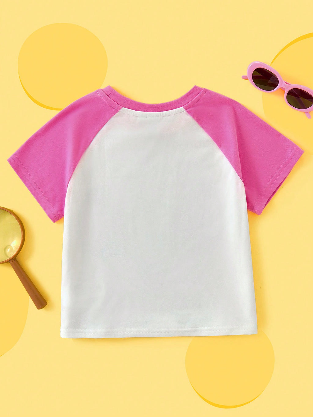 BELLAVOG Young Girl Cartoon Print Contrast Raglan Sleeve Casual T-Shirt, Summer Graphic Tee