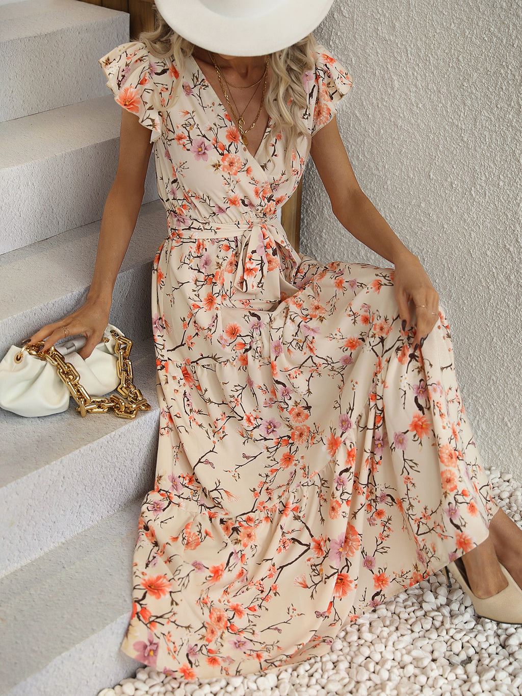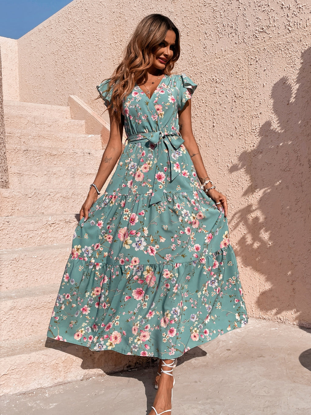 BELLAVOG Floral Print Butterfly Sleeve Ruffle Hem Belted Dress Maxi Vacation Beach Outfits Women