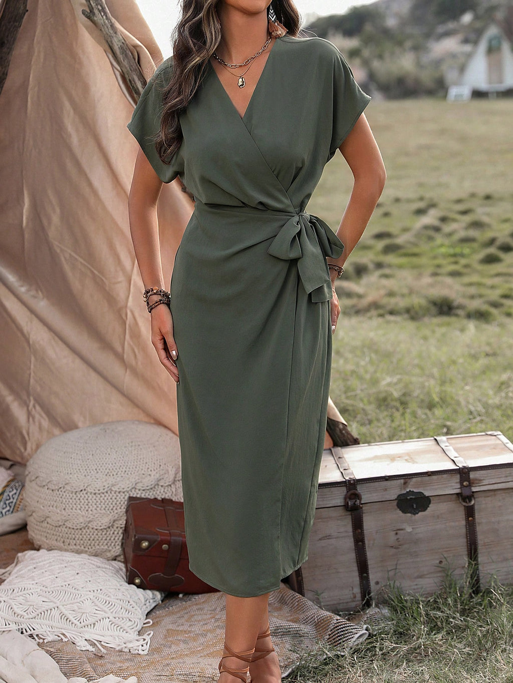 MIU AZRA Ženska Crna Crep Haljina sa Nabranom Ovratnikom i Rukavima u Zvonu