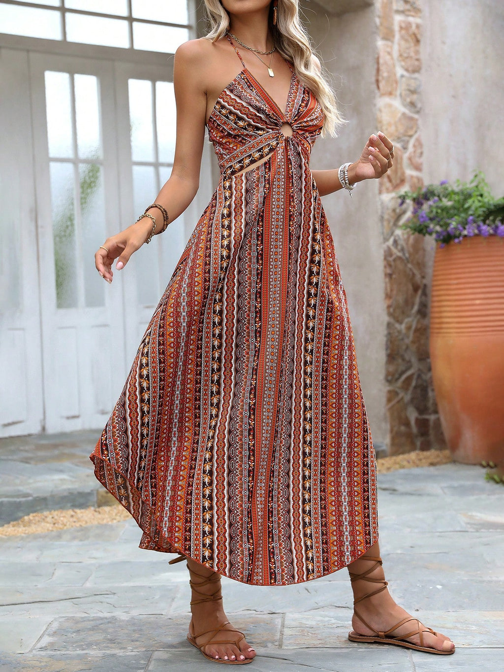 BELLAVOG Women Vacation Floral Print Halter Maxi Dress With Circle Link And Side Slits Vacation Beach Outfit