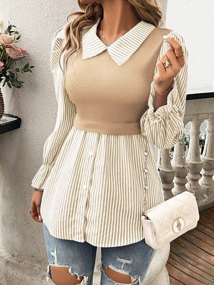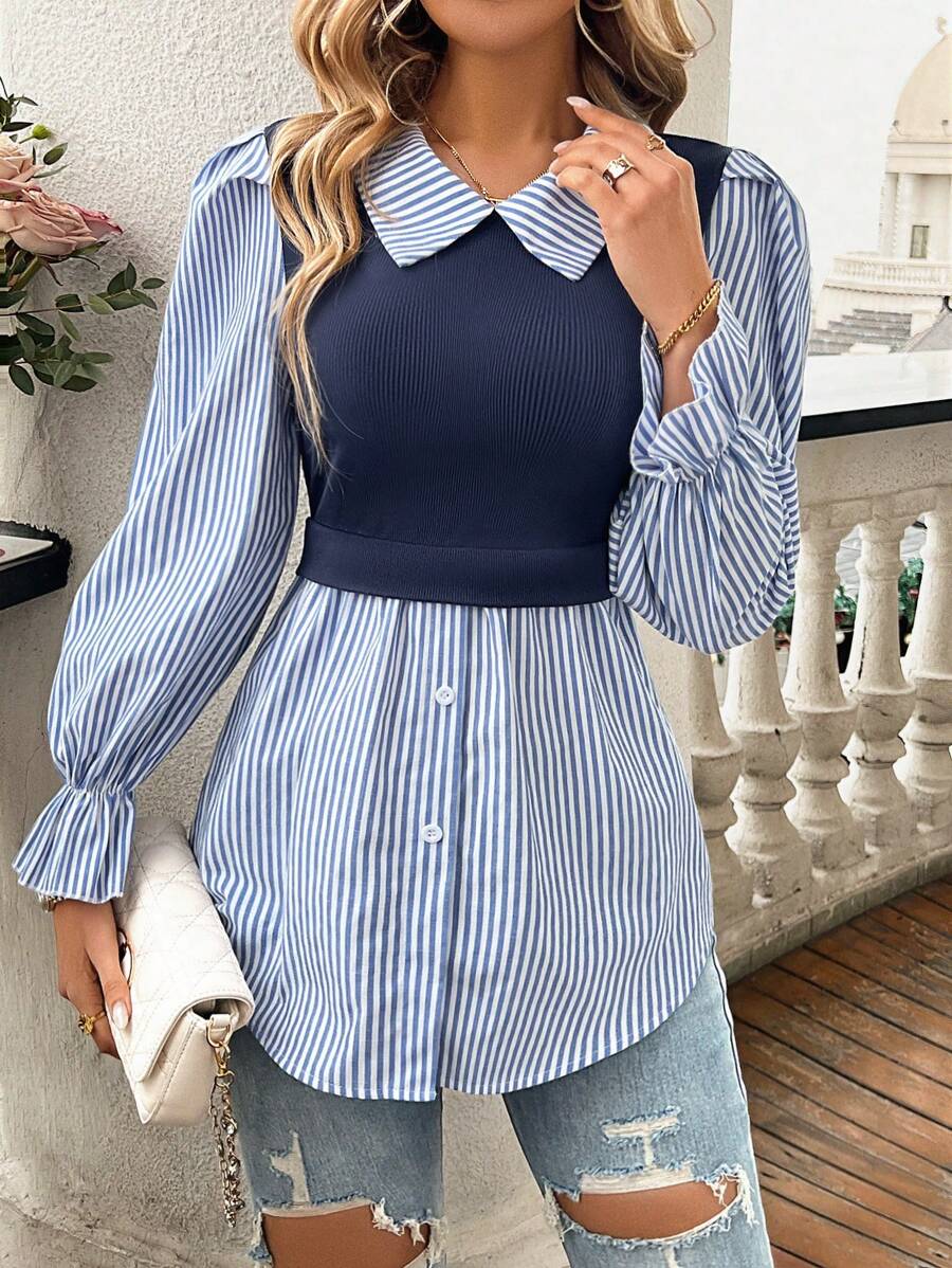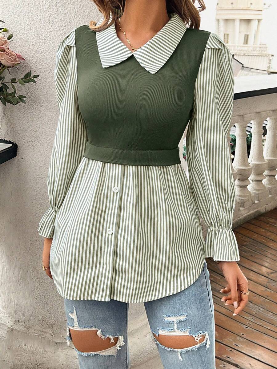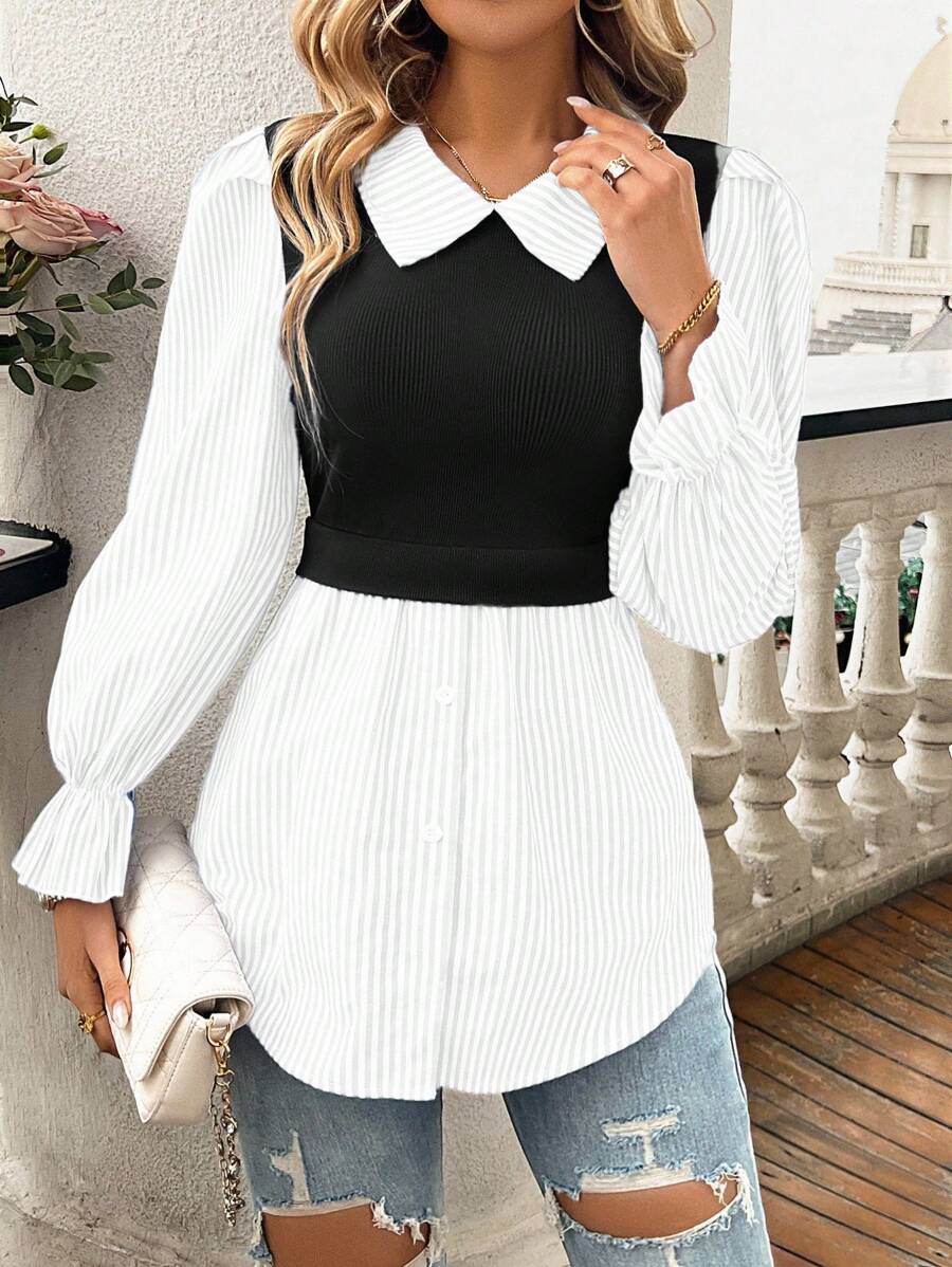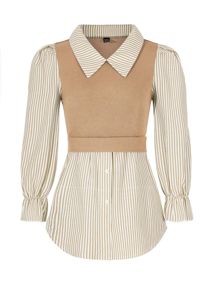 Chiquease Women's Casual Striped Patchwork Puff Sleeve 2 In 1 Top, Spring Autumn Fall Cloth For Women