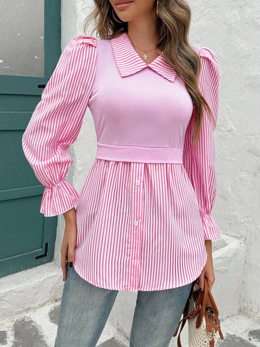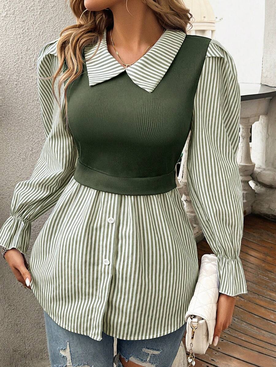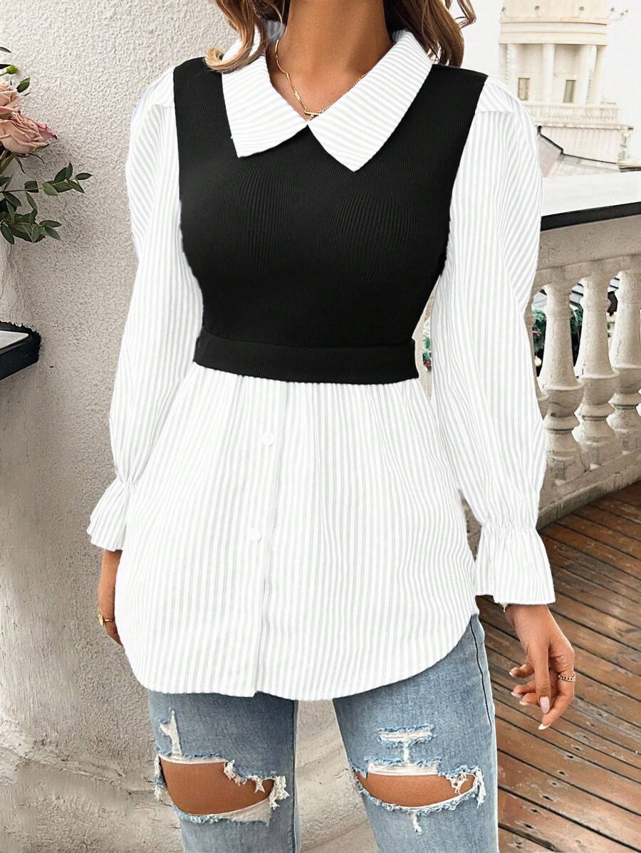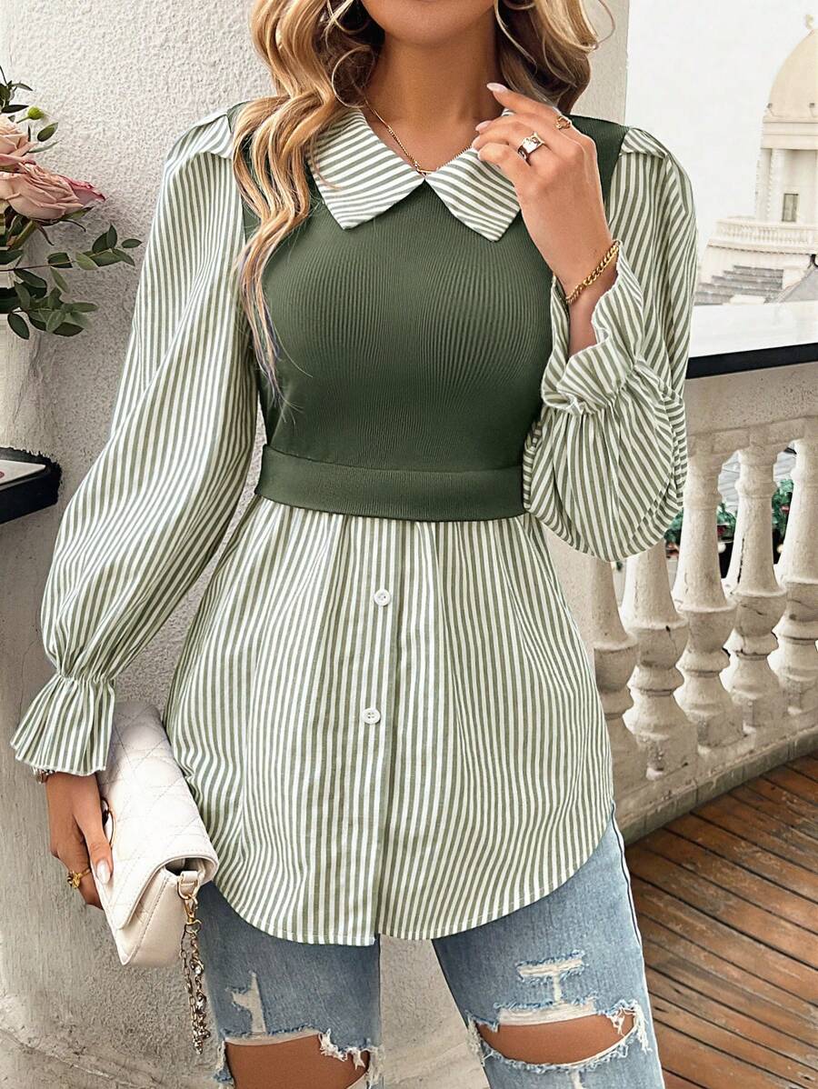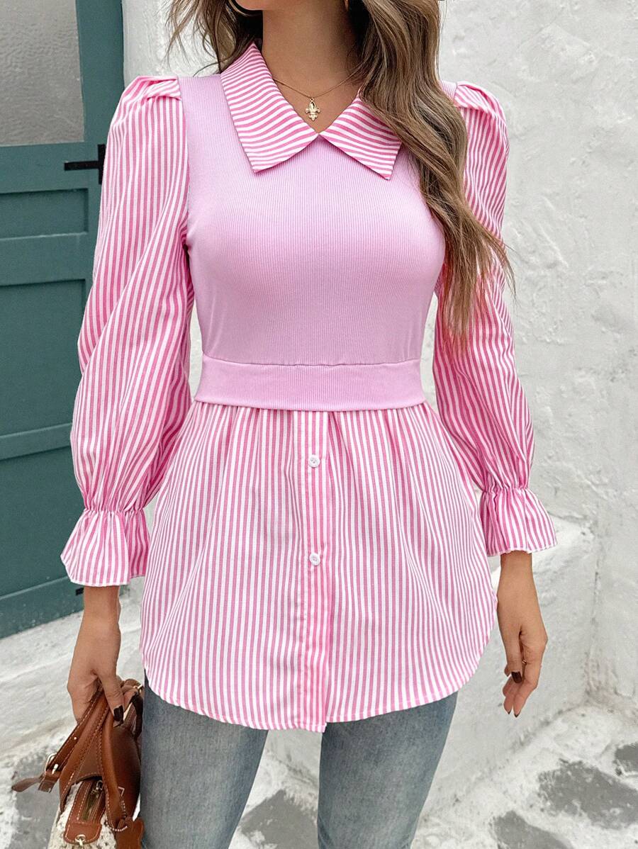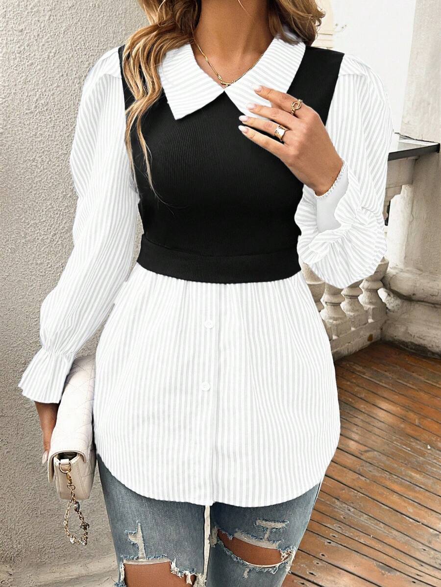 Chiquease Women's Casual Striped Patchwork Puff Sleeve 2 In 1 Top, Spring Autumn Fall Cloth For Women
