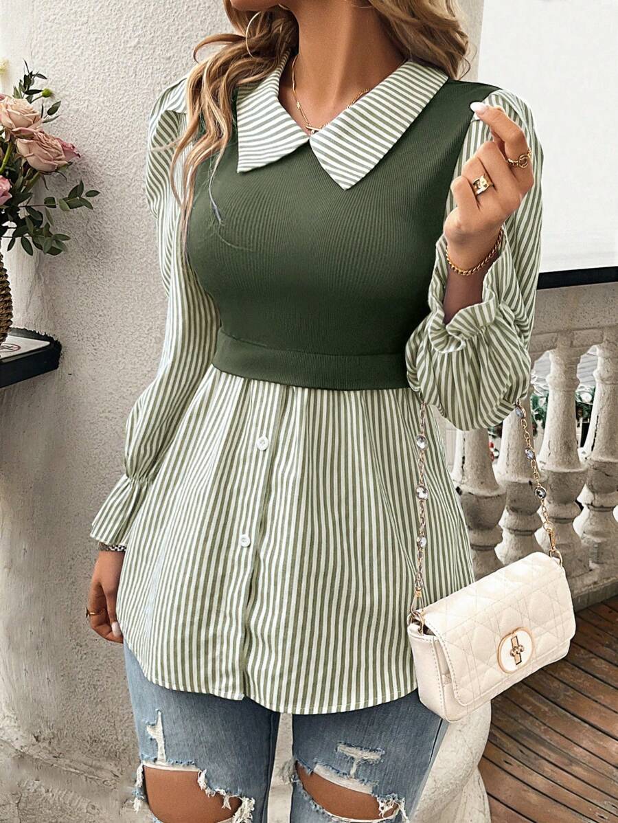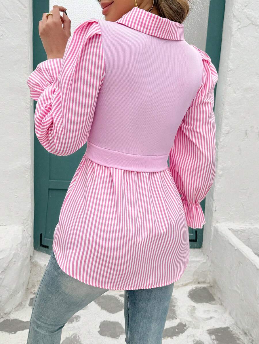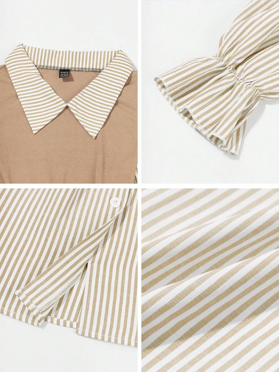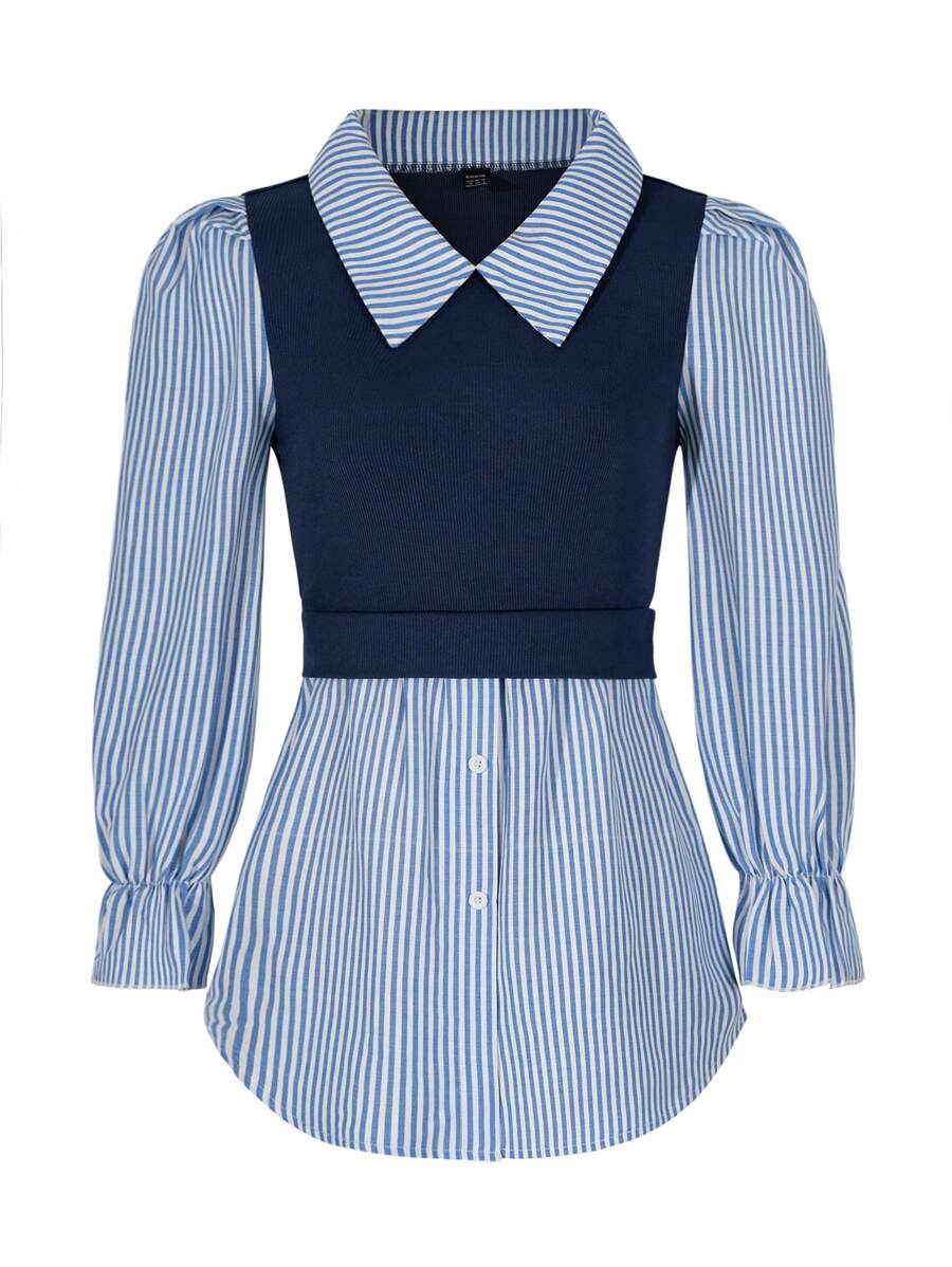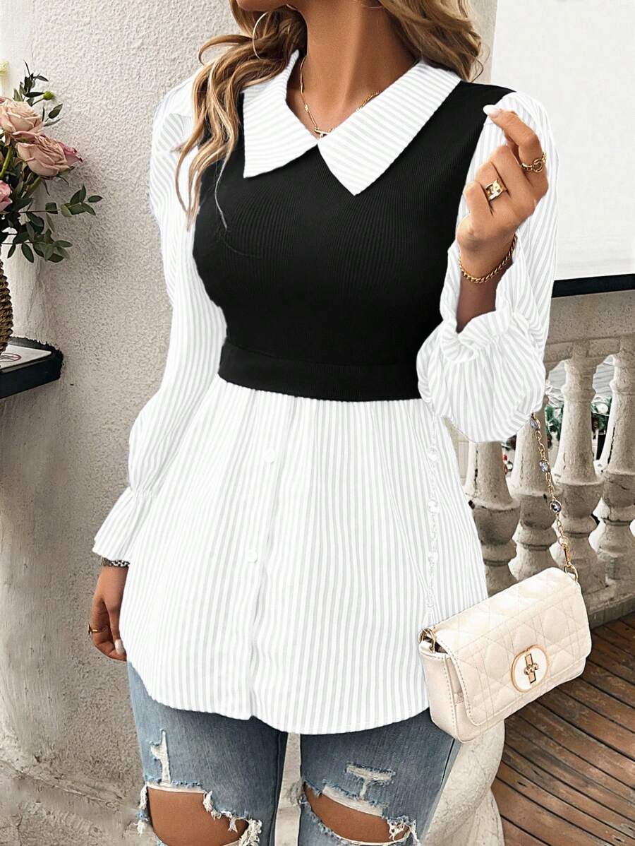Chiquease Women's Casual Striped Patchwork Puff Sleeve 2 In 1 Top, Spring Autumn Fall Cloth For Women