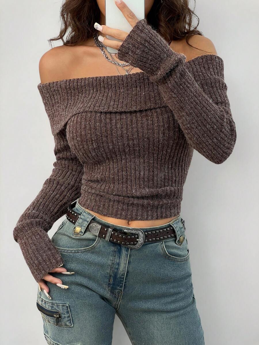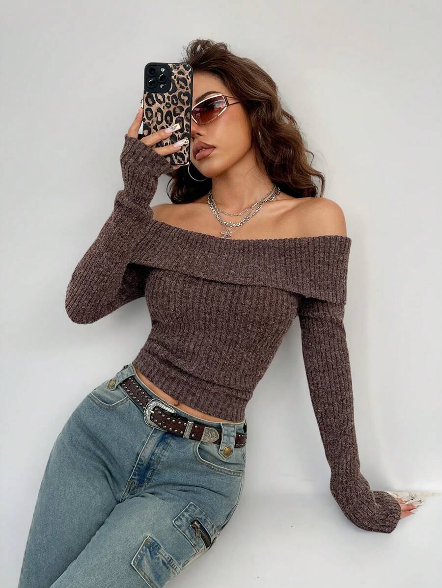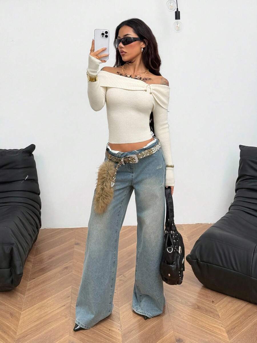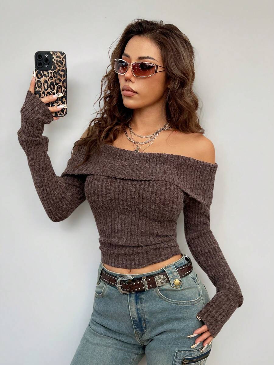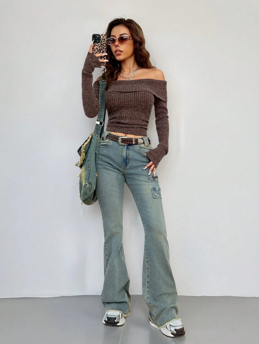 Coolane ženski jesenji pleteni džemper spuštenih ramena, rastezljivog materijala i vintage Y2K dizajna — idealan za izlaske, zabave, koncerte i streetwear kombinacije u retro stilu.
