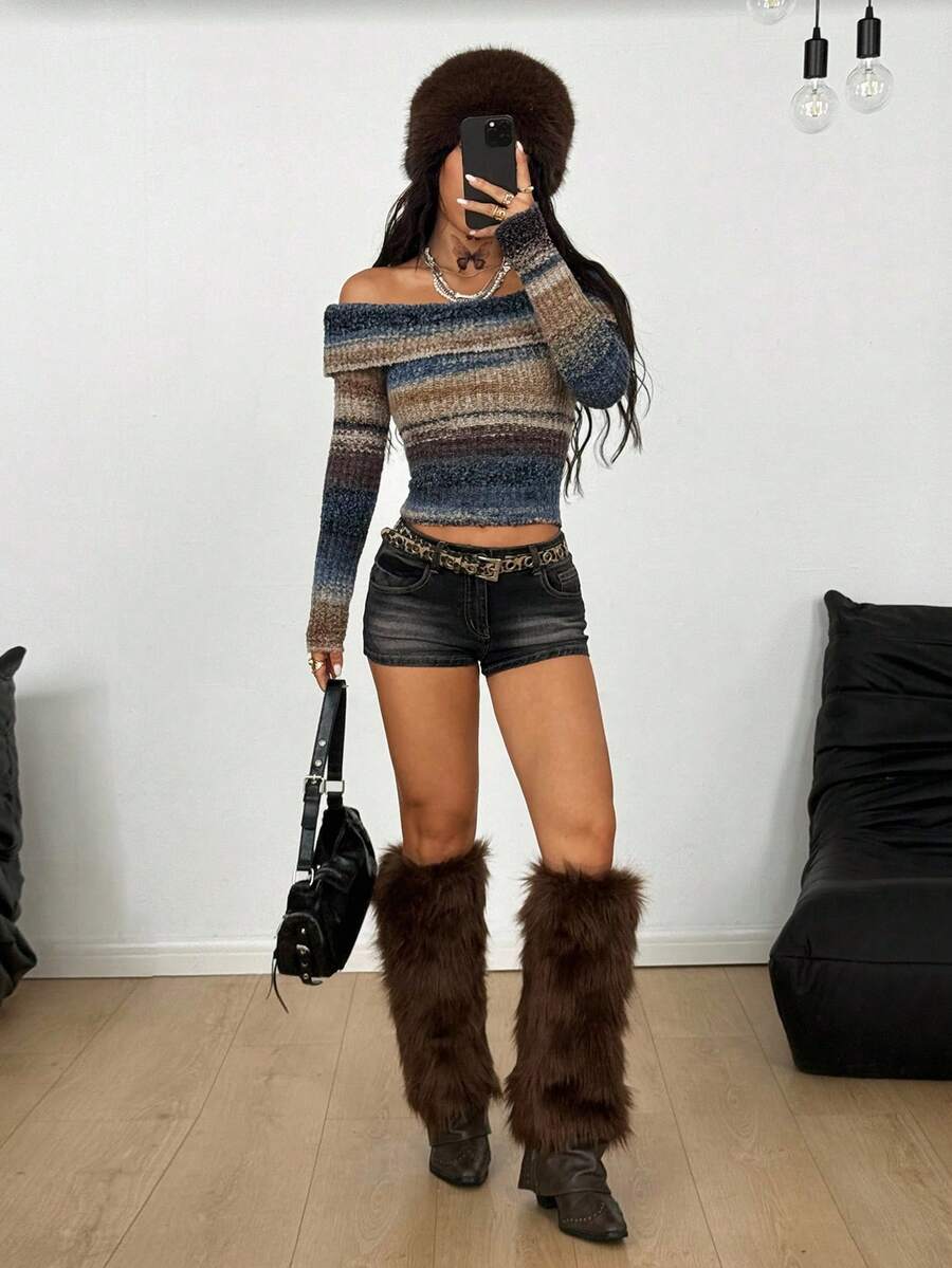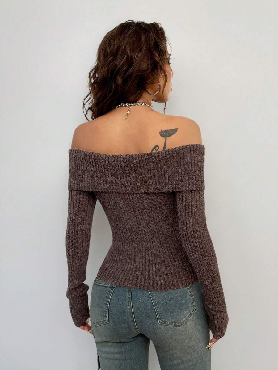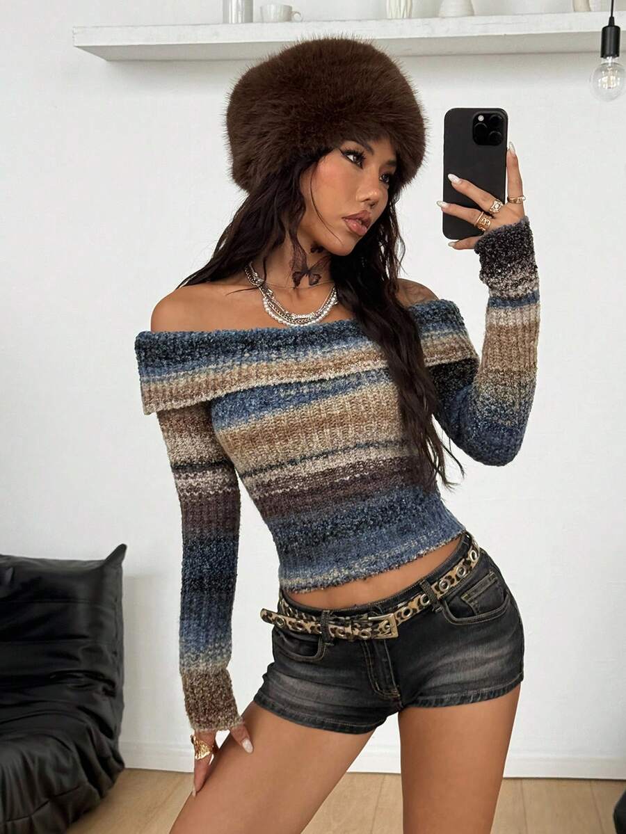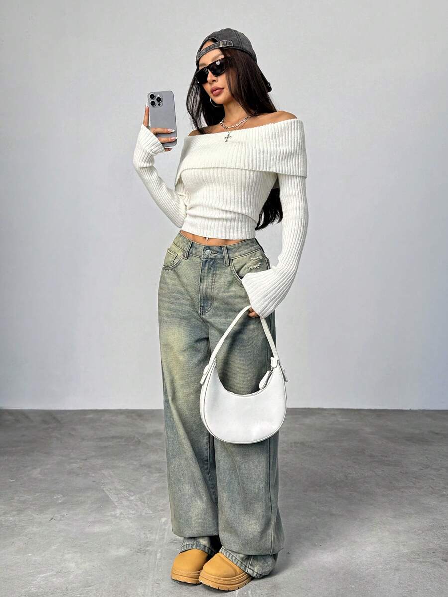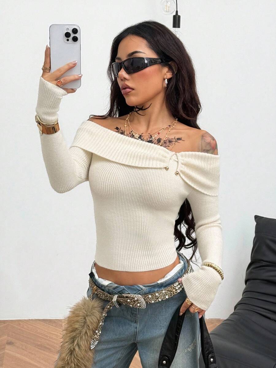 Coolane ženski jesenji pleteni džemper spuštenih ramena, rastezljivog materijala i vintage Y2K dizajna — idealan za izlaske, zabave, koncerte i streetwear kombinacije u retro stilu.