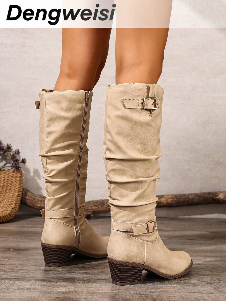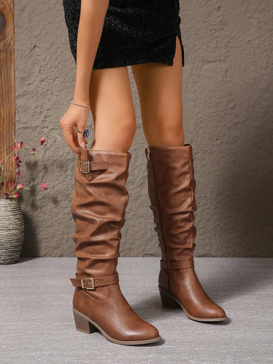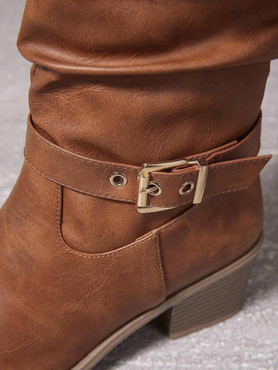Crne PU kožne čizme s okruglim prstima i bočnim patentnim zatvaračem, lanac remen