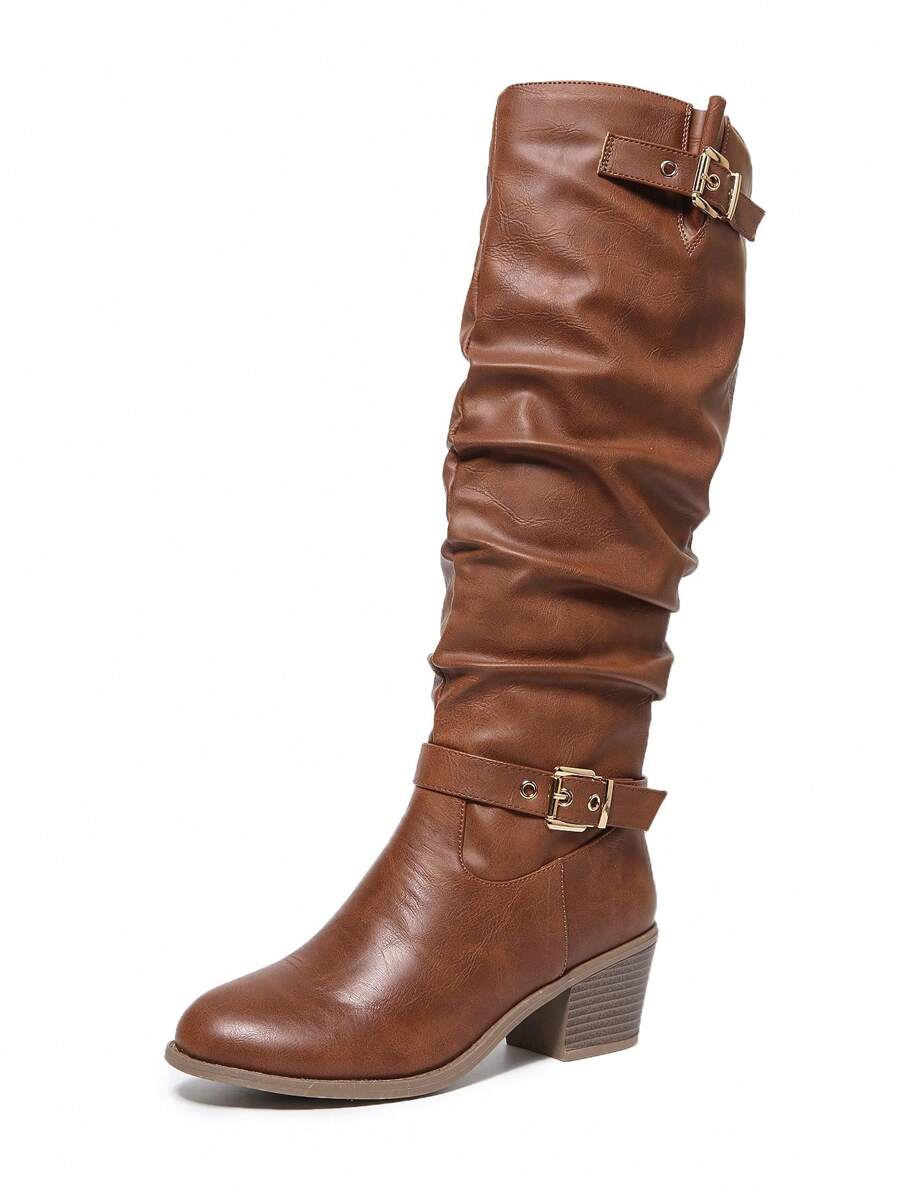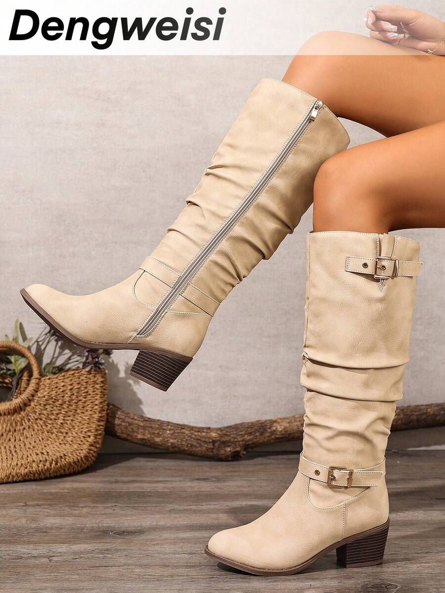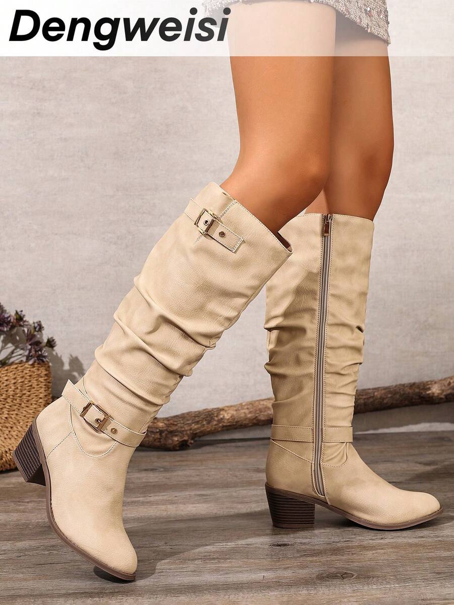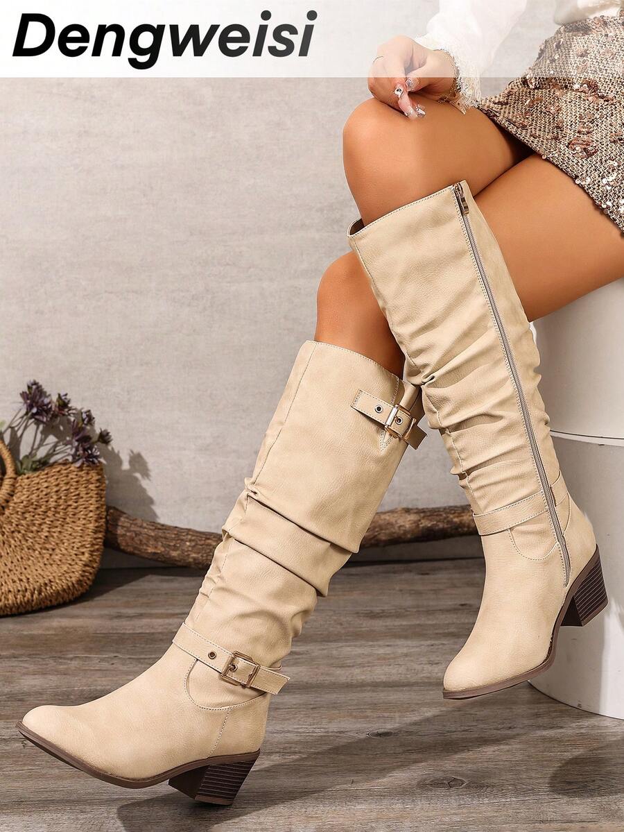 Crne PU kožne čizme s okruglim prstima i bočnim patentnim zatvaračem, lanac remen