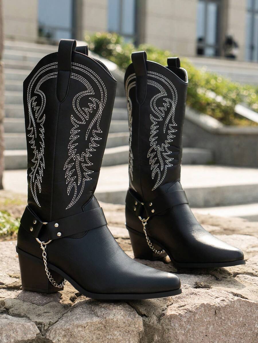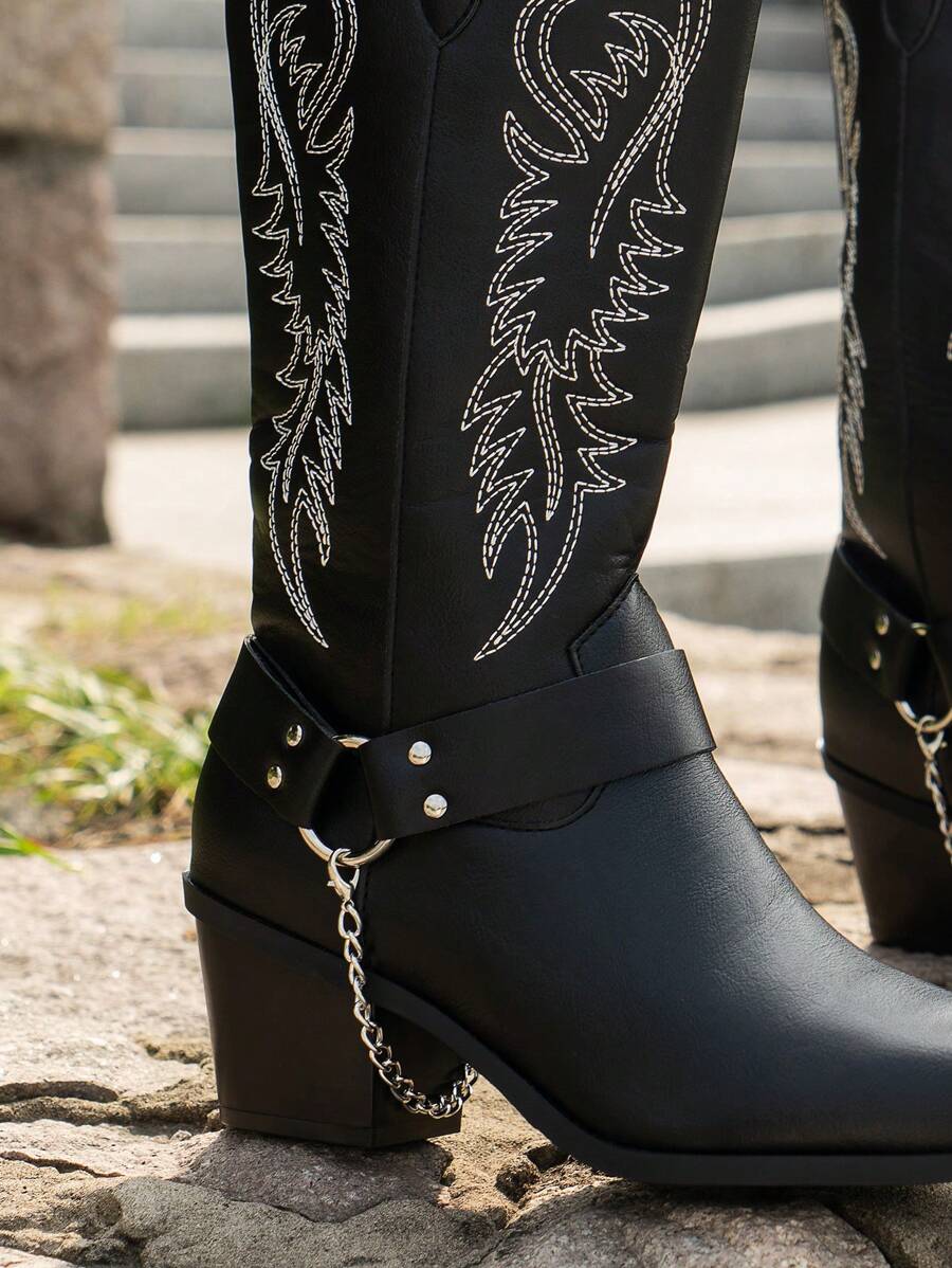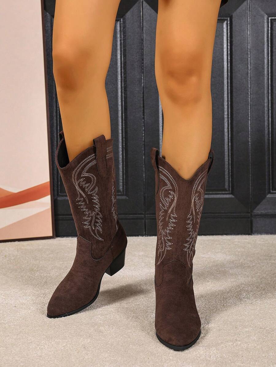 Elegantne vezeni V-rez čizme za žene u plus veličini, Casual Slip-On sa čeličnom kopčom, srednje dužine, zapadnjački stil, Jesen/Zima 2024.
