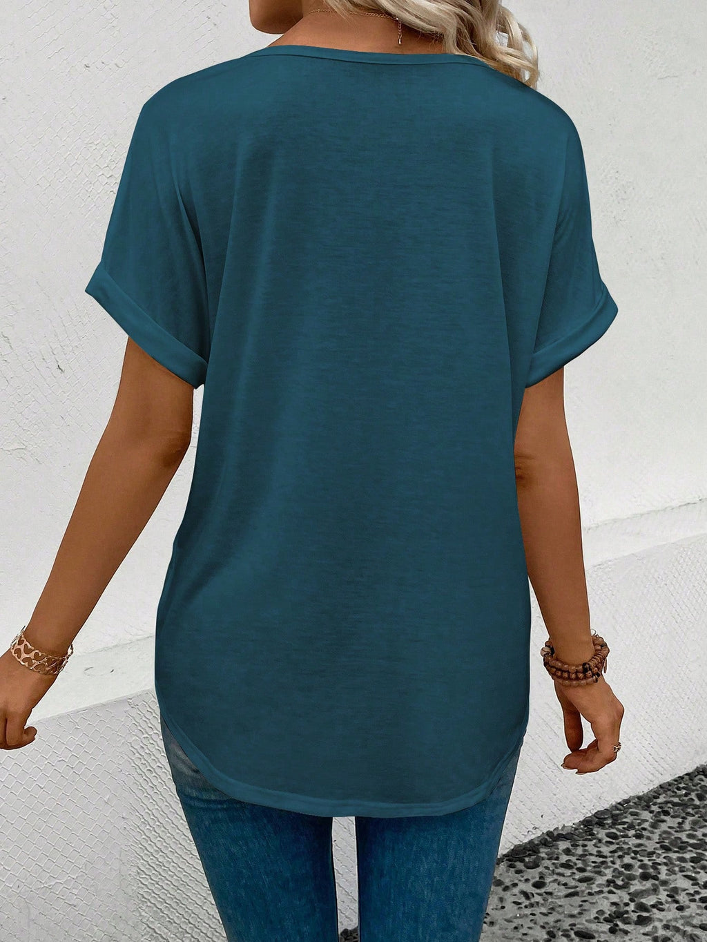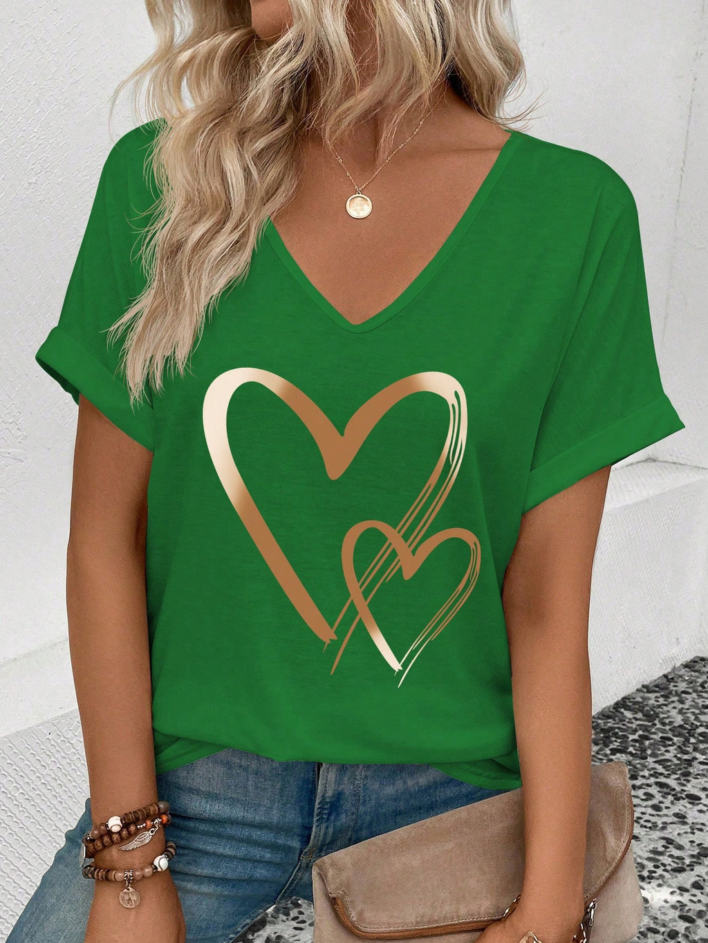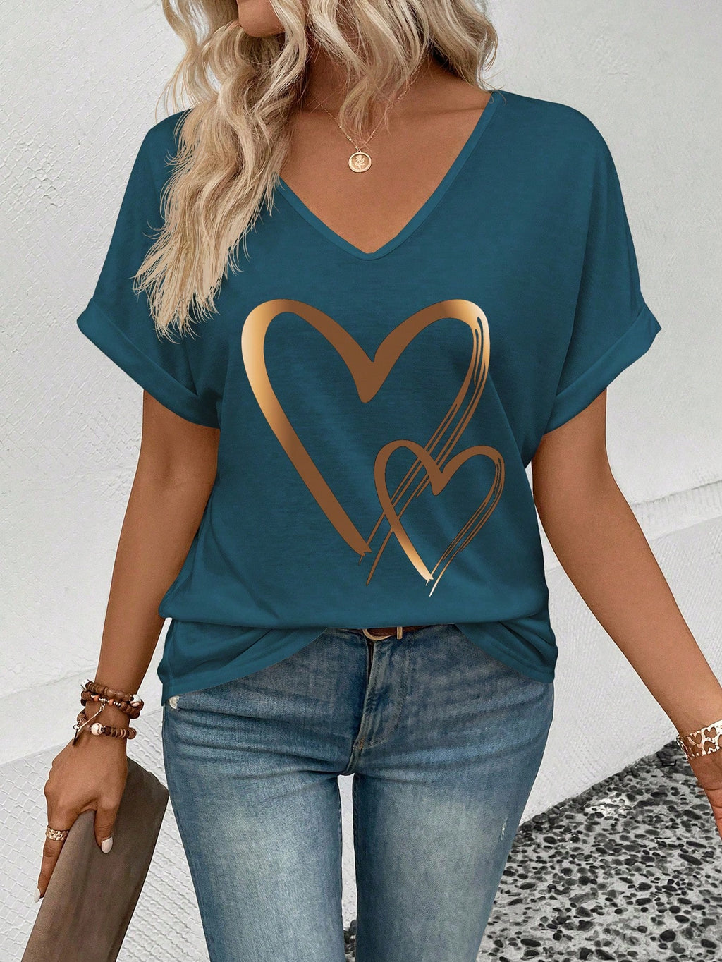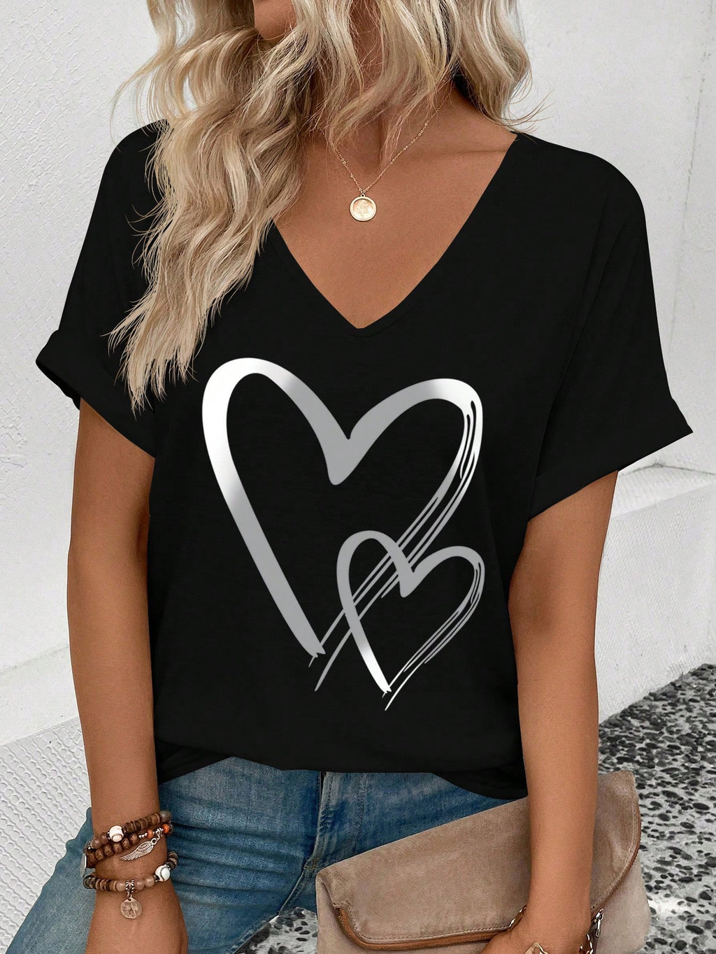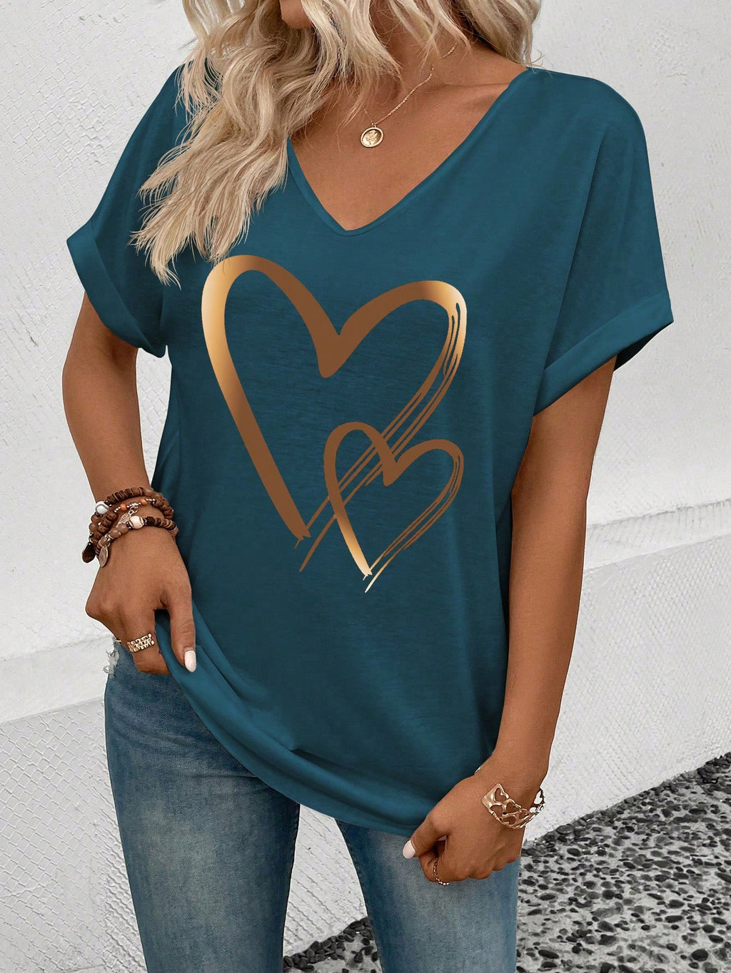 EMERY ROSE Women Summer V-Neck Buttoned Cuff Heart Graphic T-Shirt Graphic Tees Women Tops