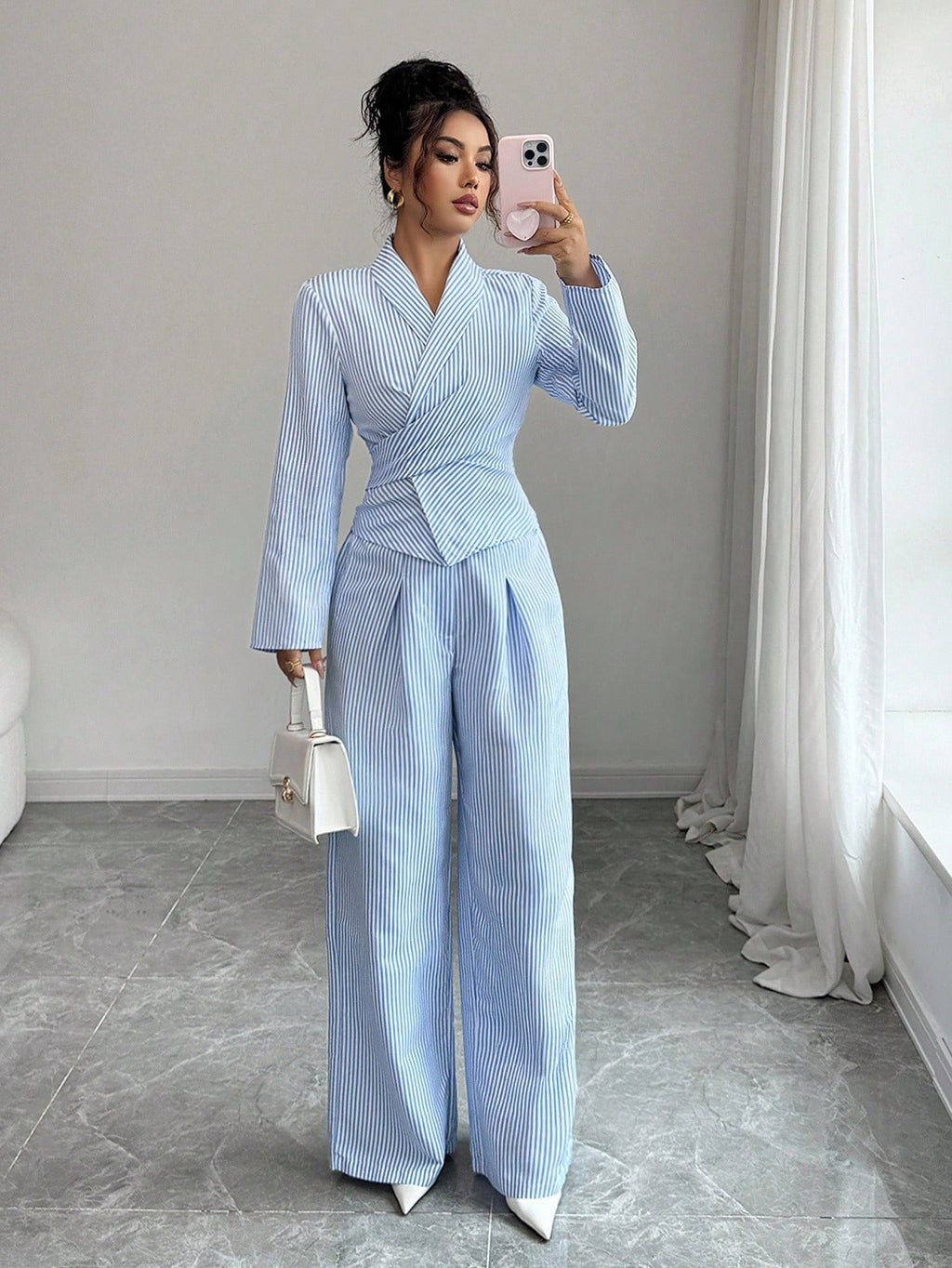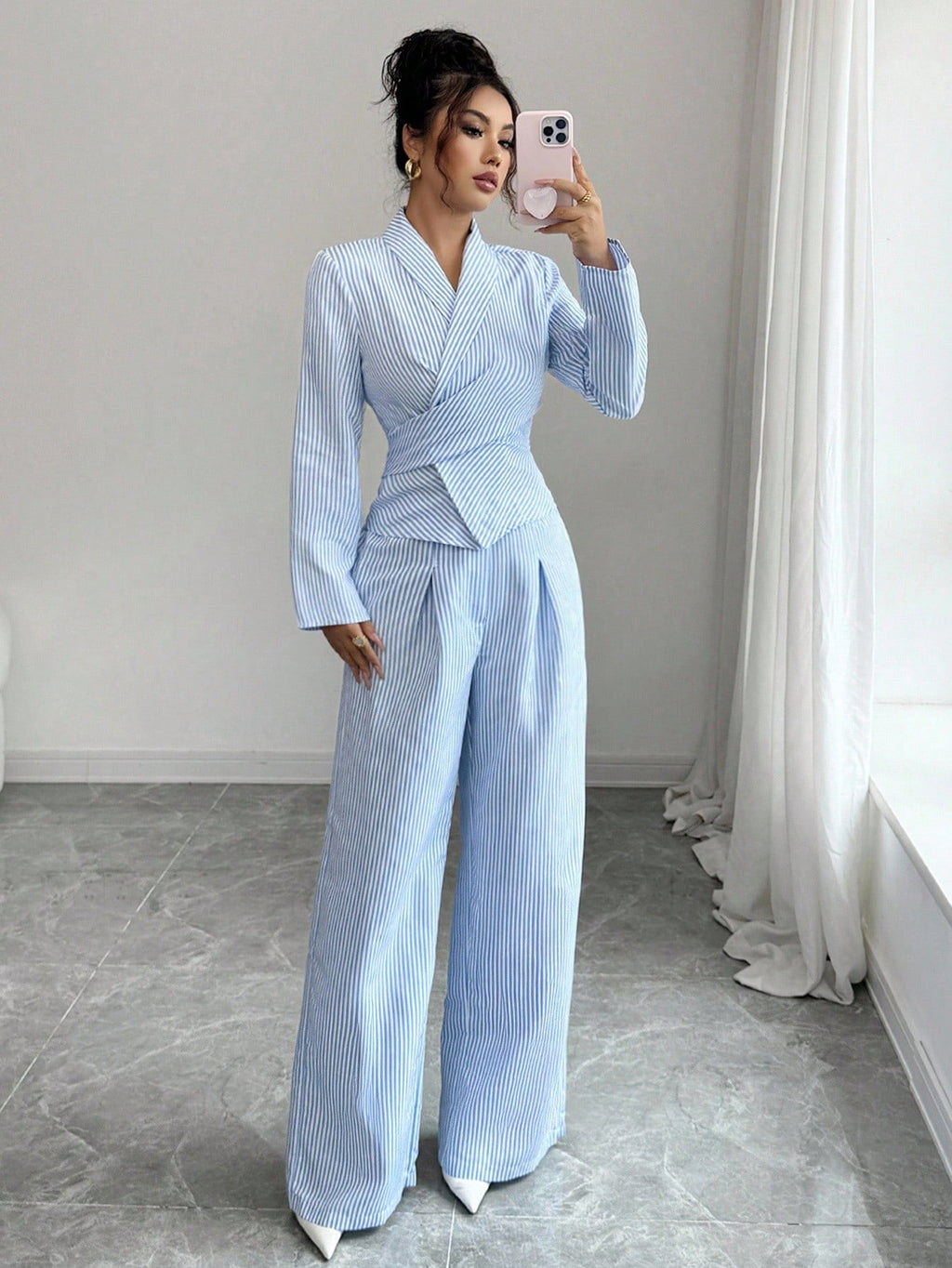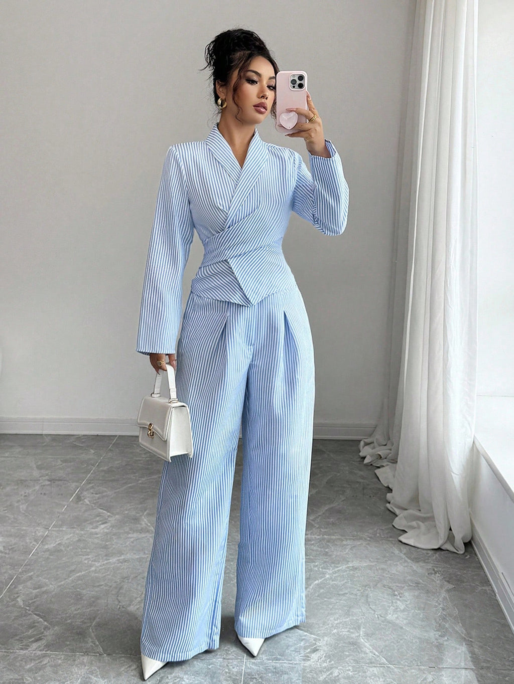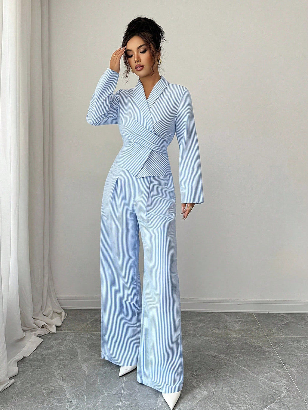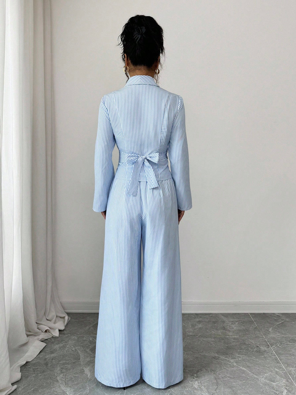 EMI 2pcs Women Casual Tie-Waist Long Sleeve Top And Elastic Waist Pants Set, Autumn/Winter