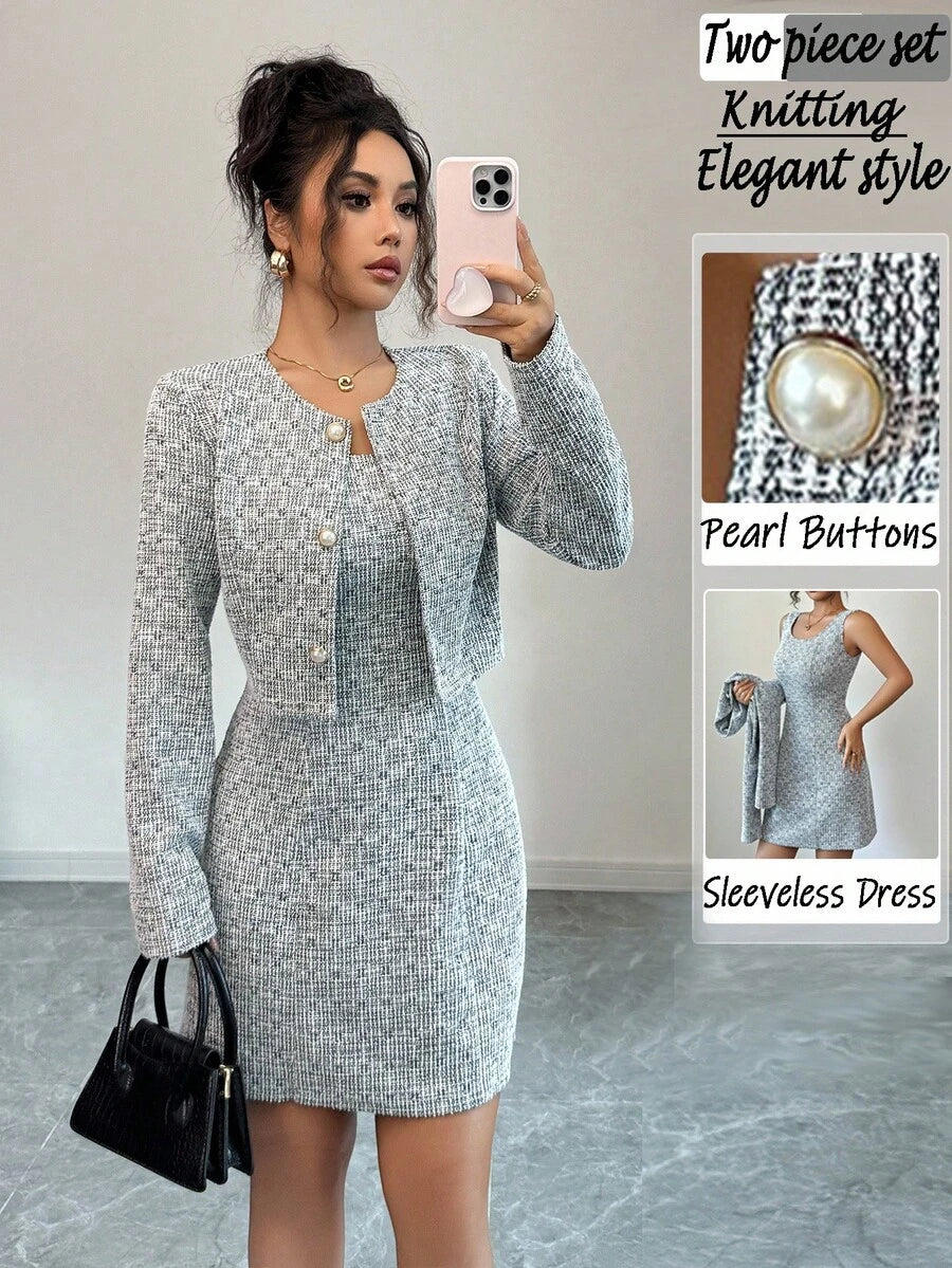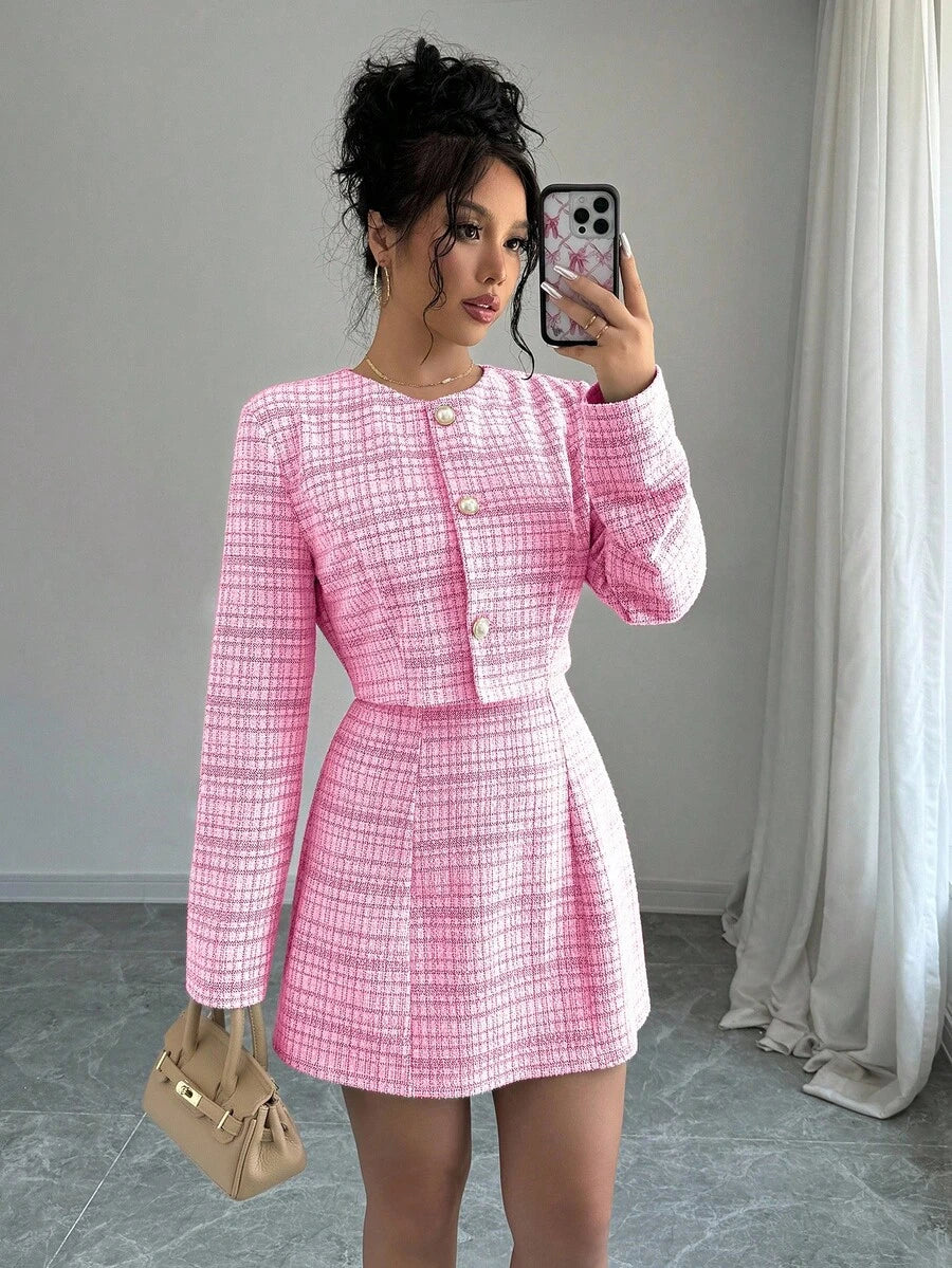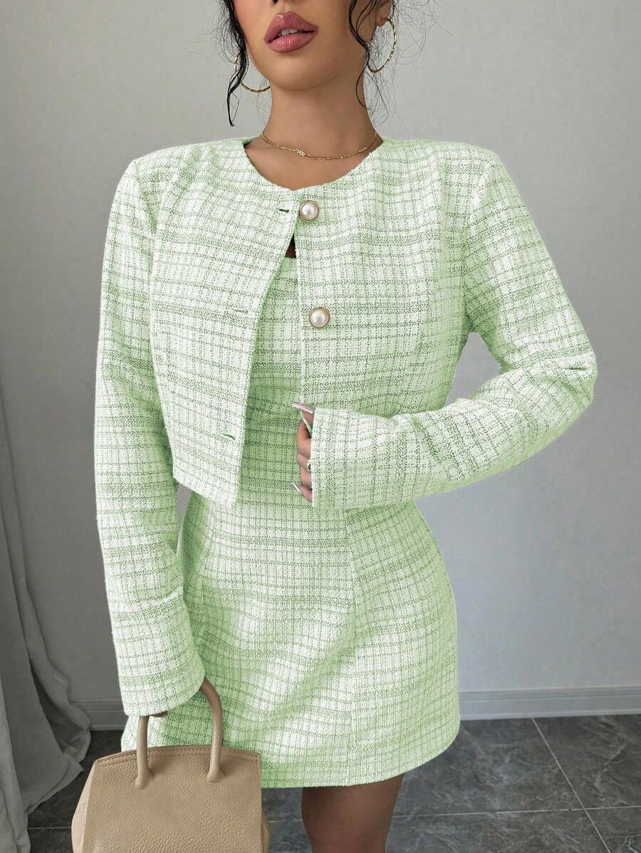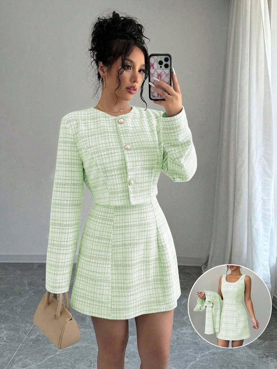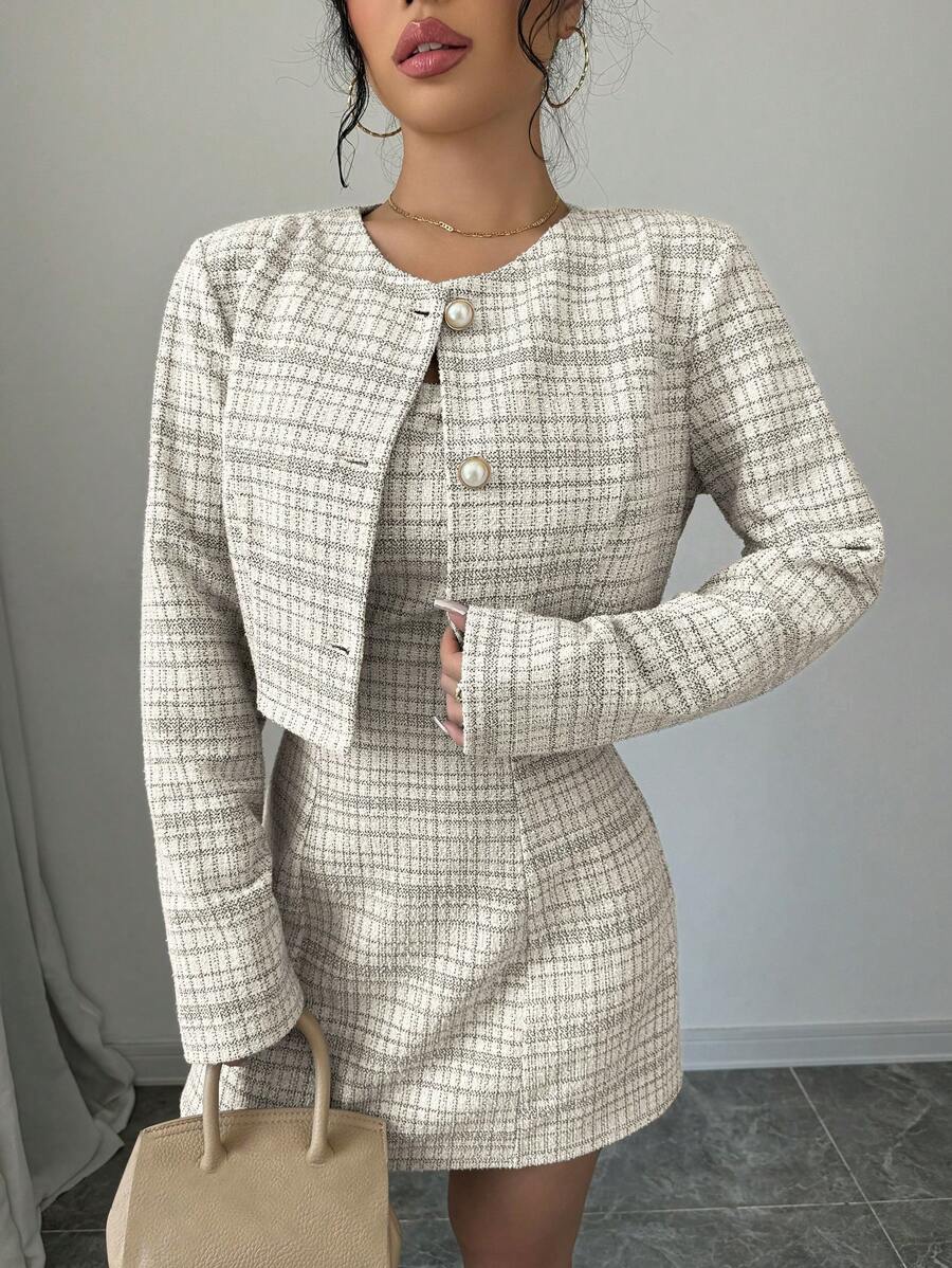 EMI 2pcs Women's Set - Plaid Button Front Jacket And Casual Dress Fall Cloth For Women