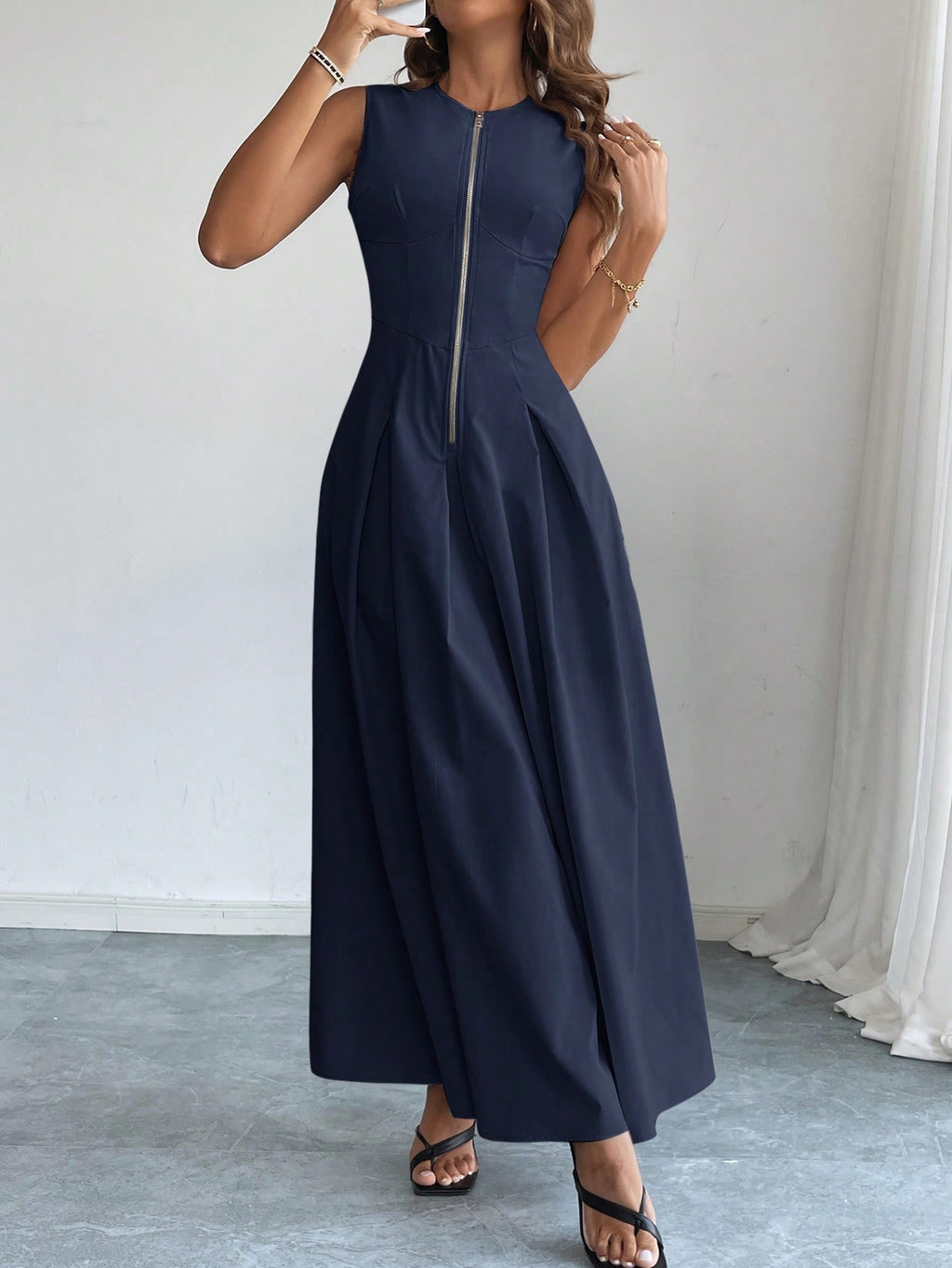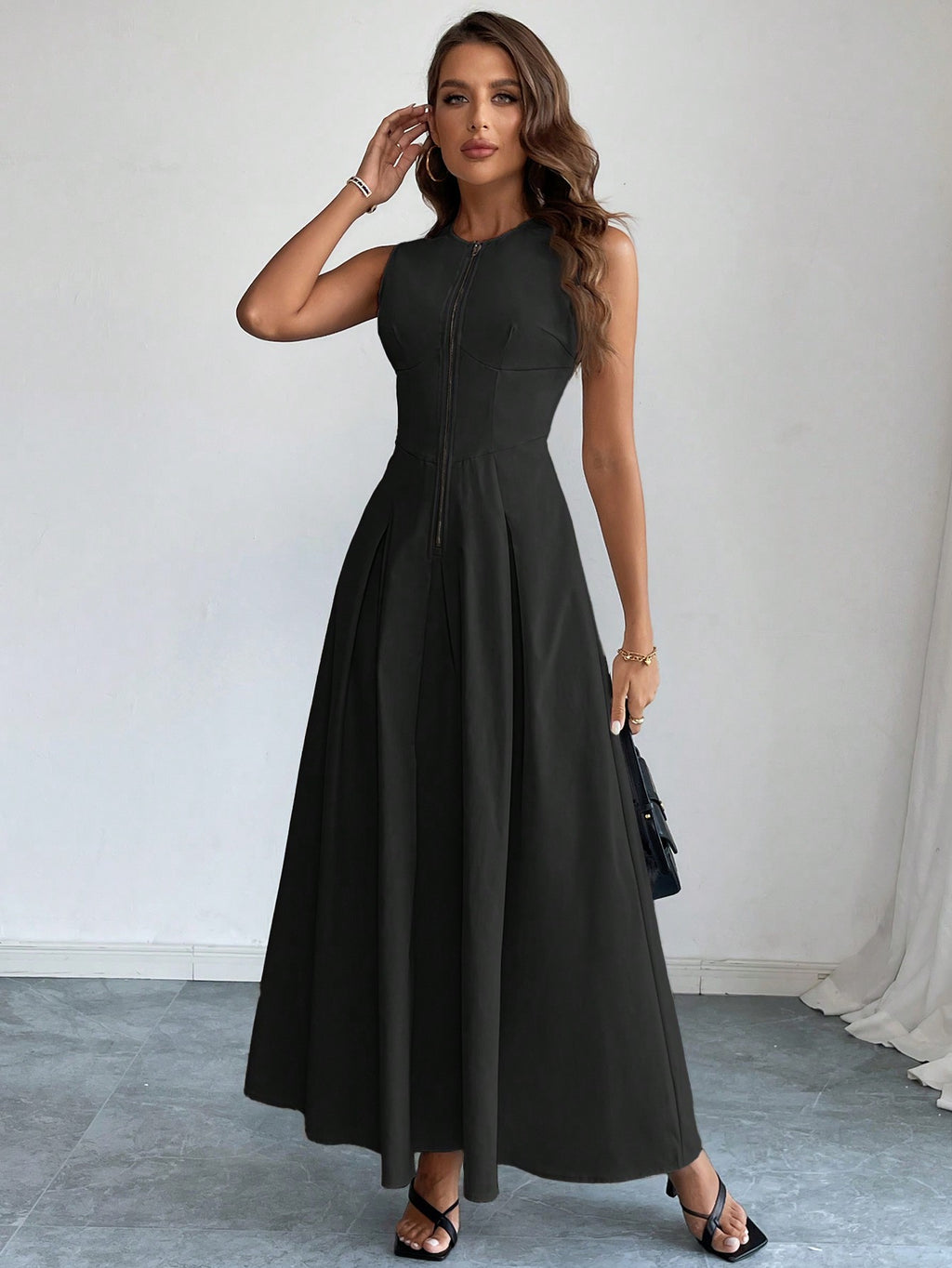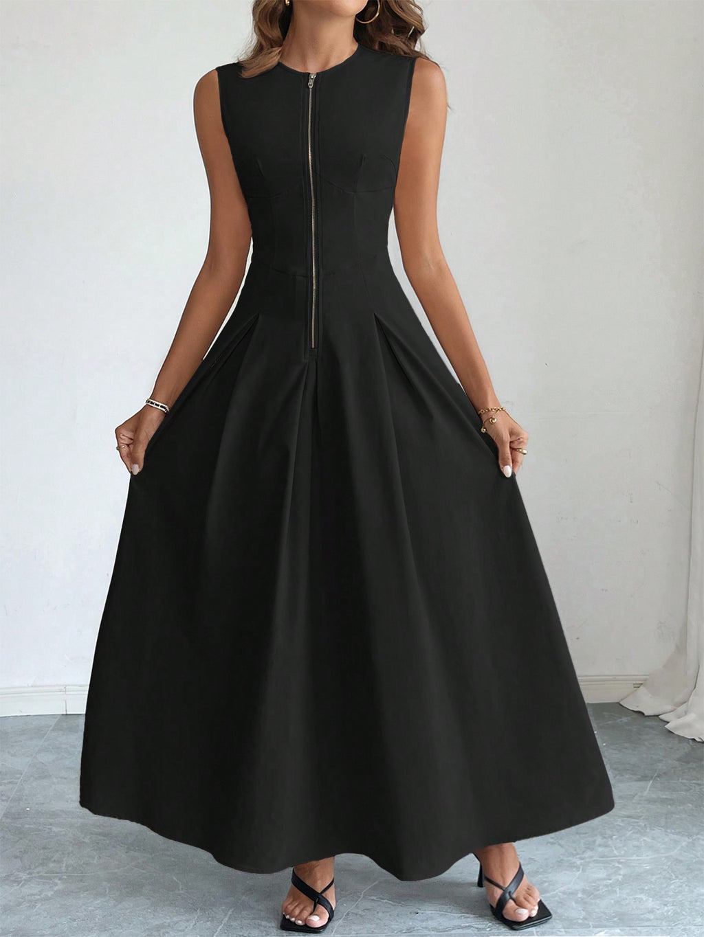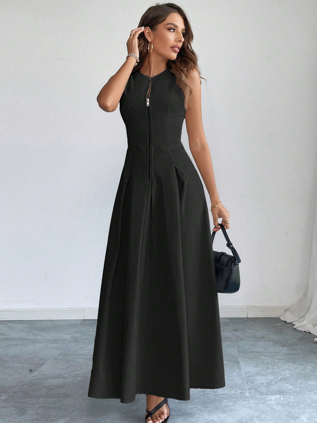 BELLAVOG Women Elegant Commuter Round Neck Sleeveless Front Zipper Dress, Very Flared