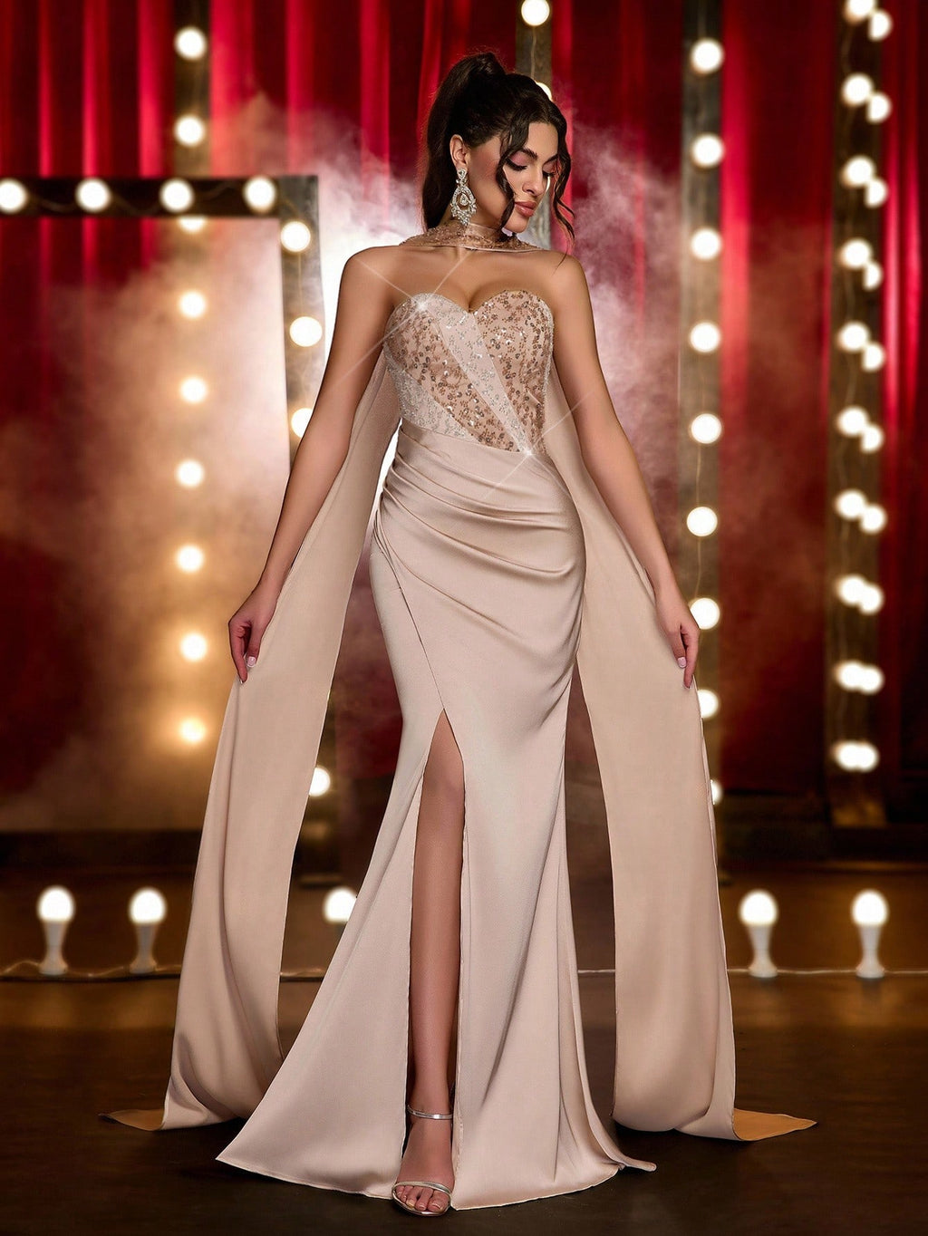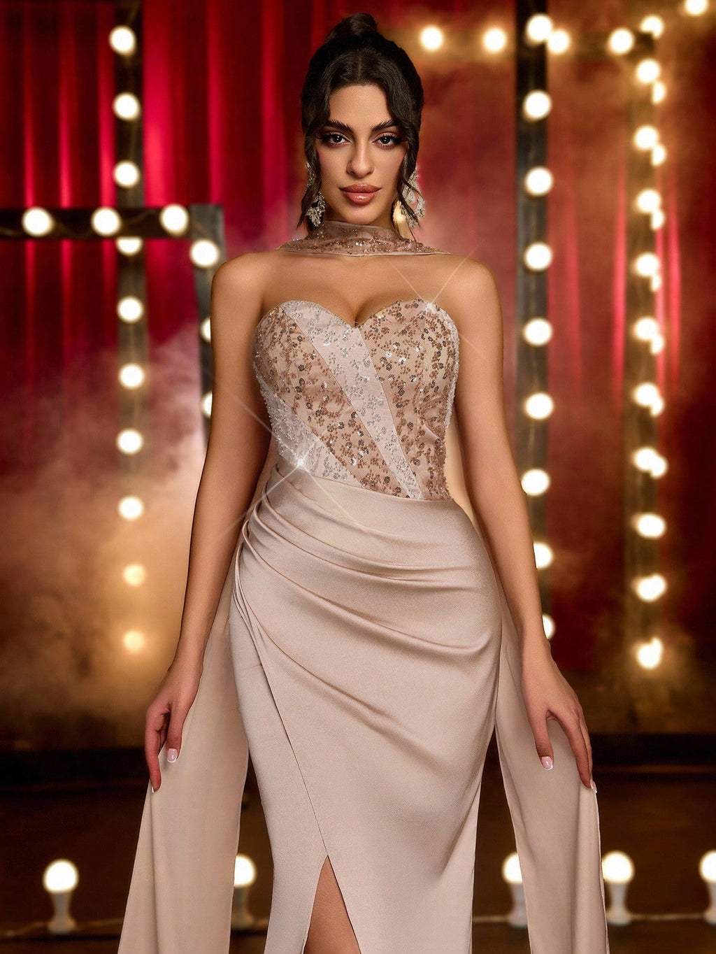 Glamrae Elegantna i Luksuzna Ženska Haljina bez Naramenica u Kaki Boji – Ukrašena Perlicama i Vezom