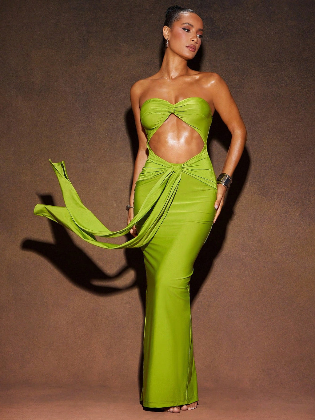 Hauture ljetna duga haljina s prorezom na leđima, u seksi i elegantnom stilu. Ima uvrnuti (twist) prednji dio, izrezane (cut-out) detalje i pojas s trakama (sash), što je čini savršenim izborom za odmor