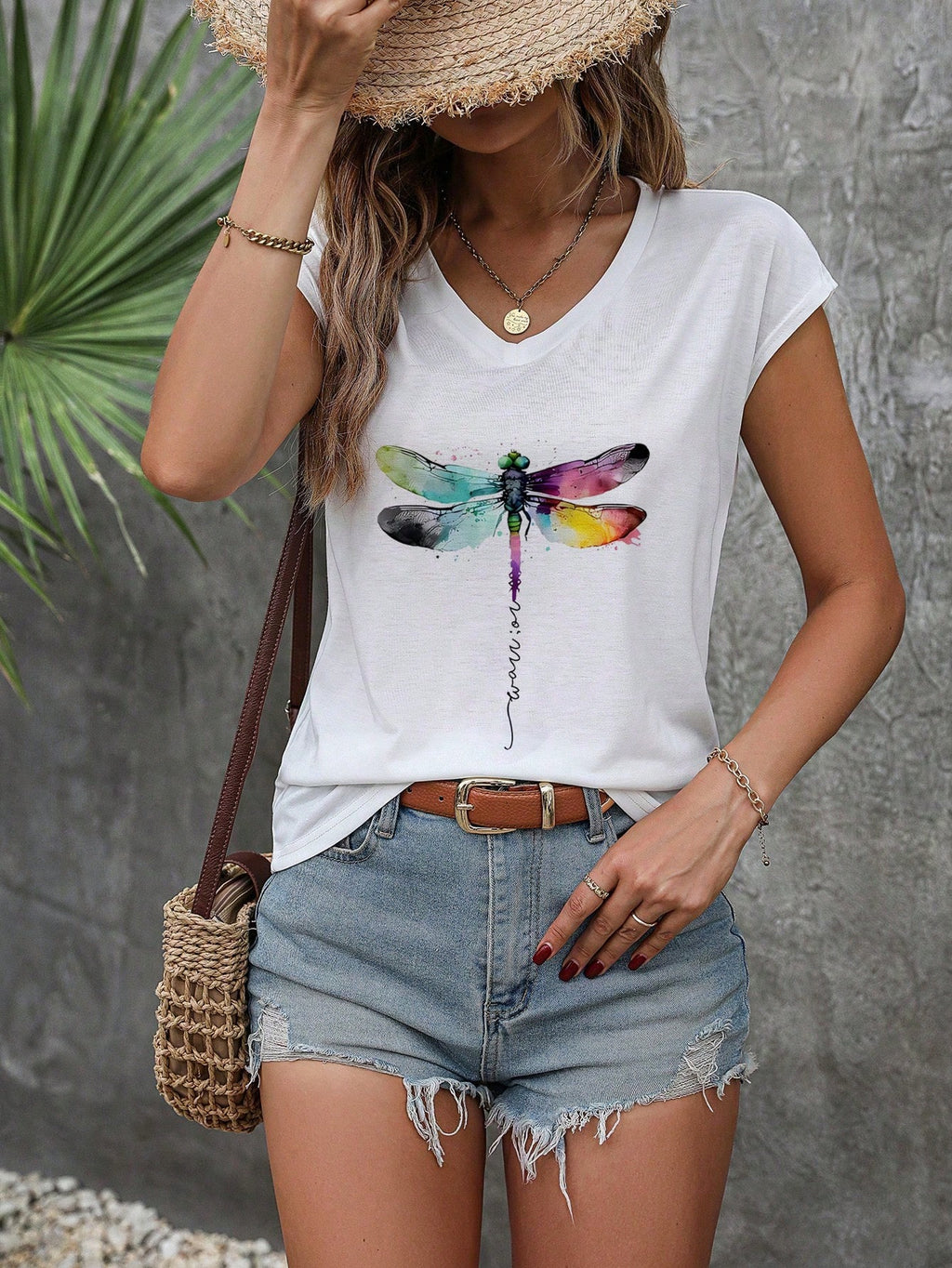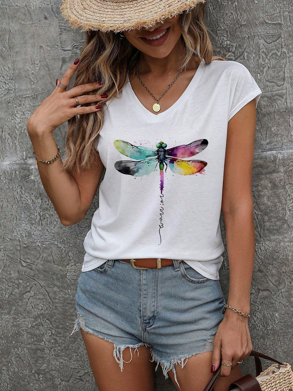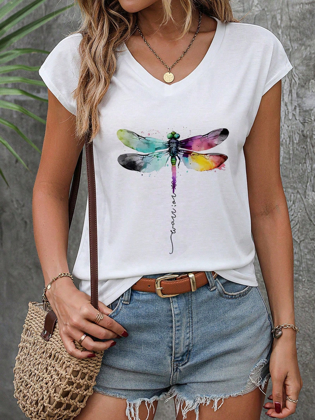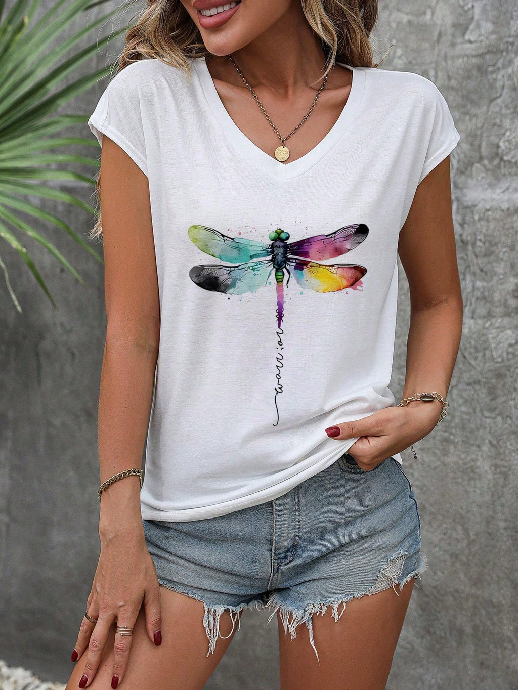 INAWLY Dragonfly Art Printed White Tee With V Neckline And Drop Shoulder Design For Girls Graphic Tees Women Tops