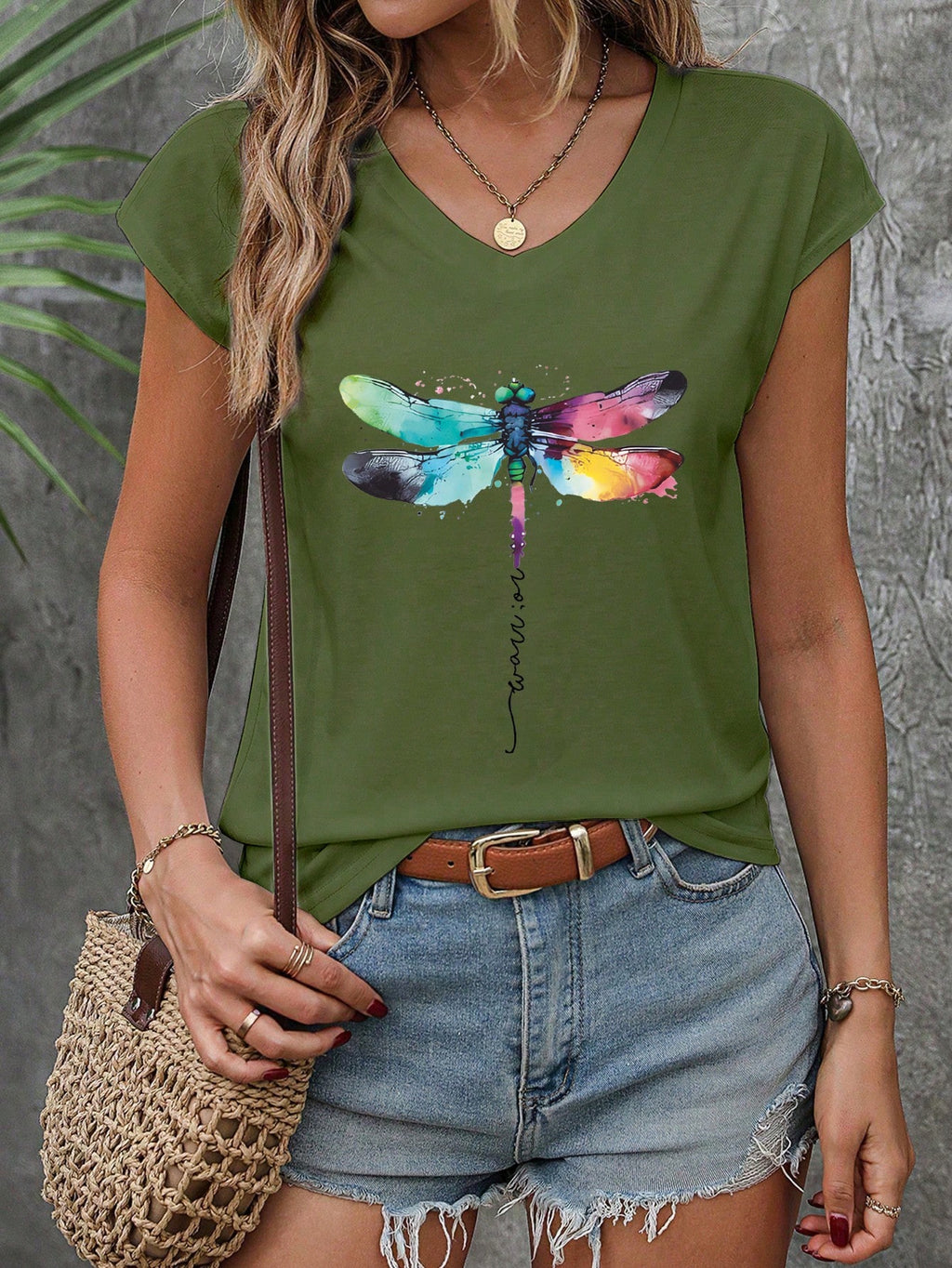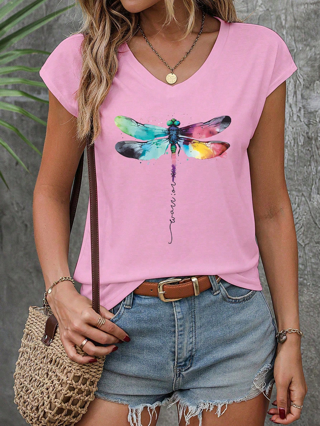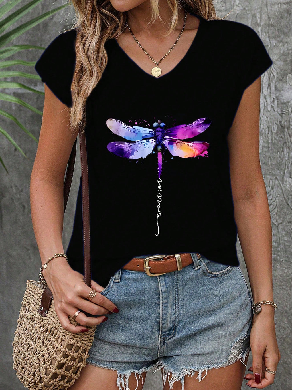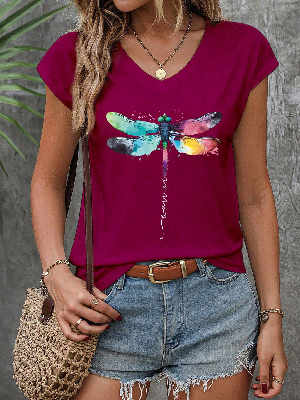 INAWLY Dragonfly Art Printed White Tee With V Neckline And Drop Shoulder Design For Girls Graphic Tees Women Tops