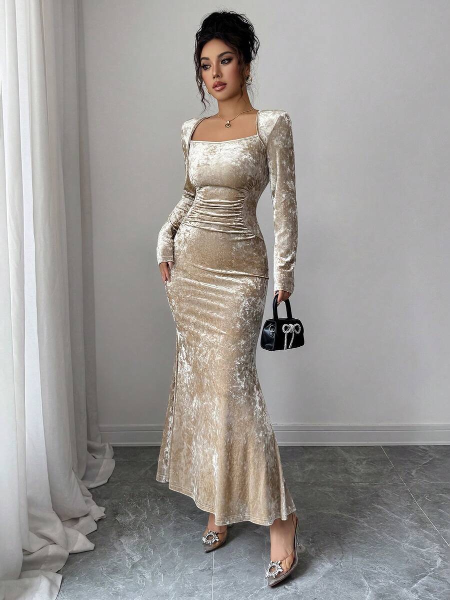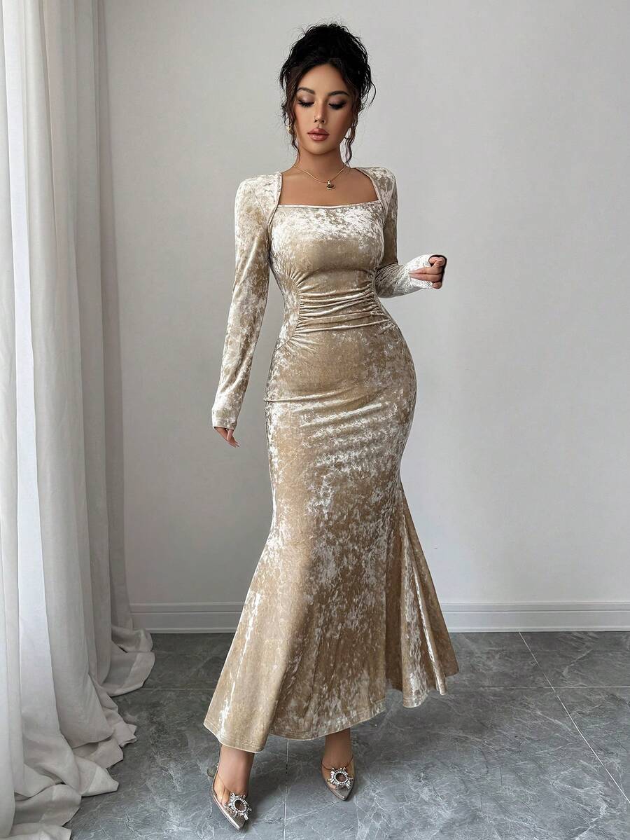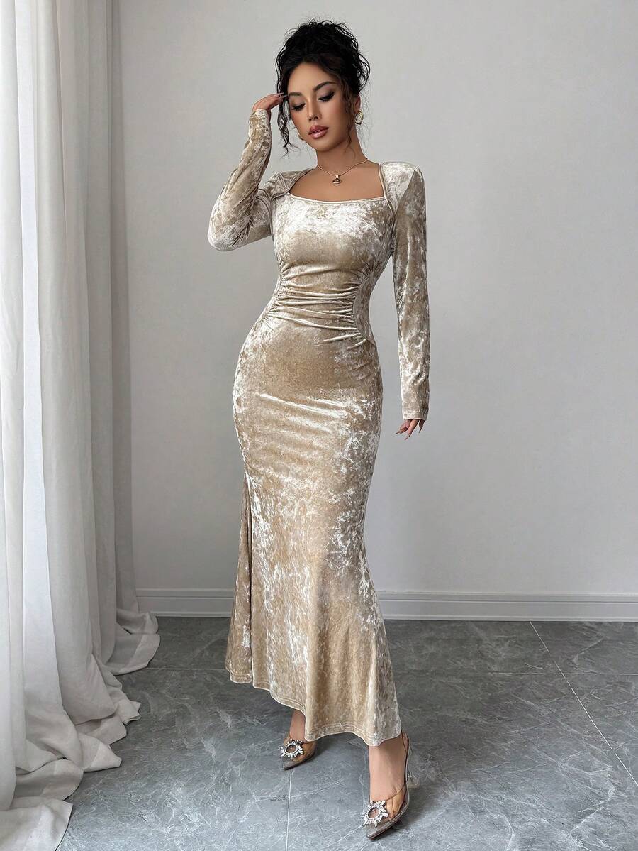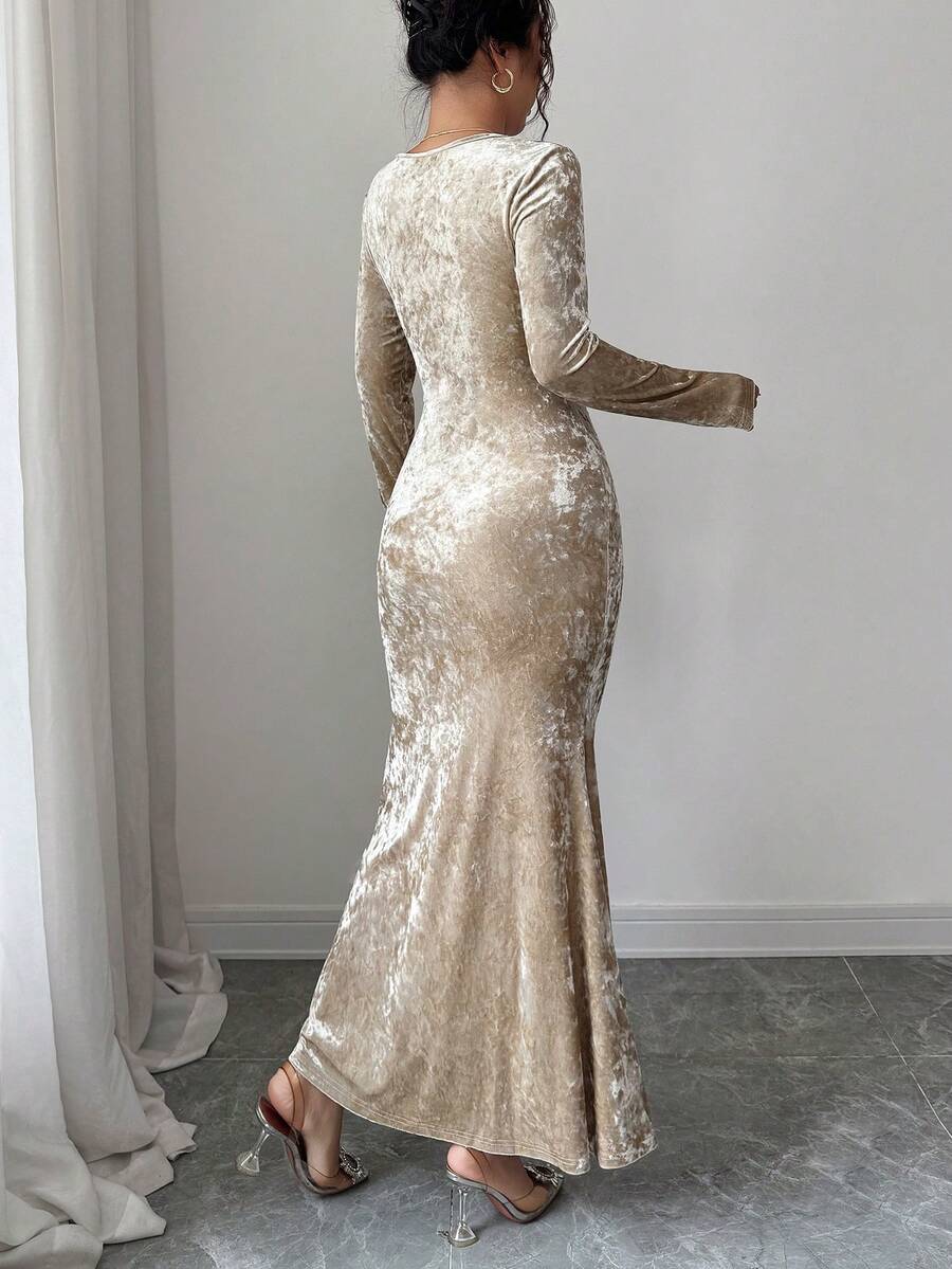 Jesen/Zima Ženska Turtleneck Samt Zlatni Elastični Pleteni Bodycon Haljina, Elegantna Ručana Struk Riblja Špica Midi Haljina za Komunikaciju i Spoj