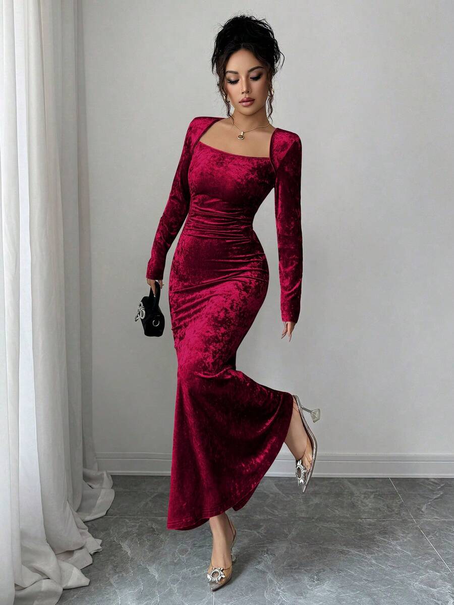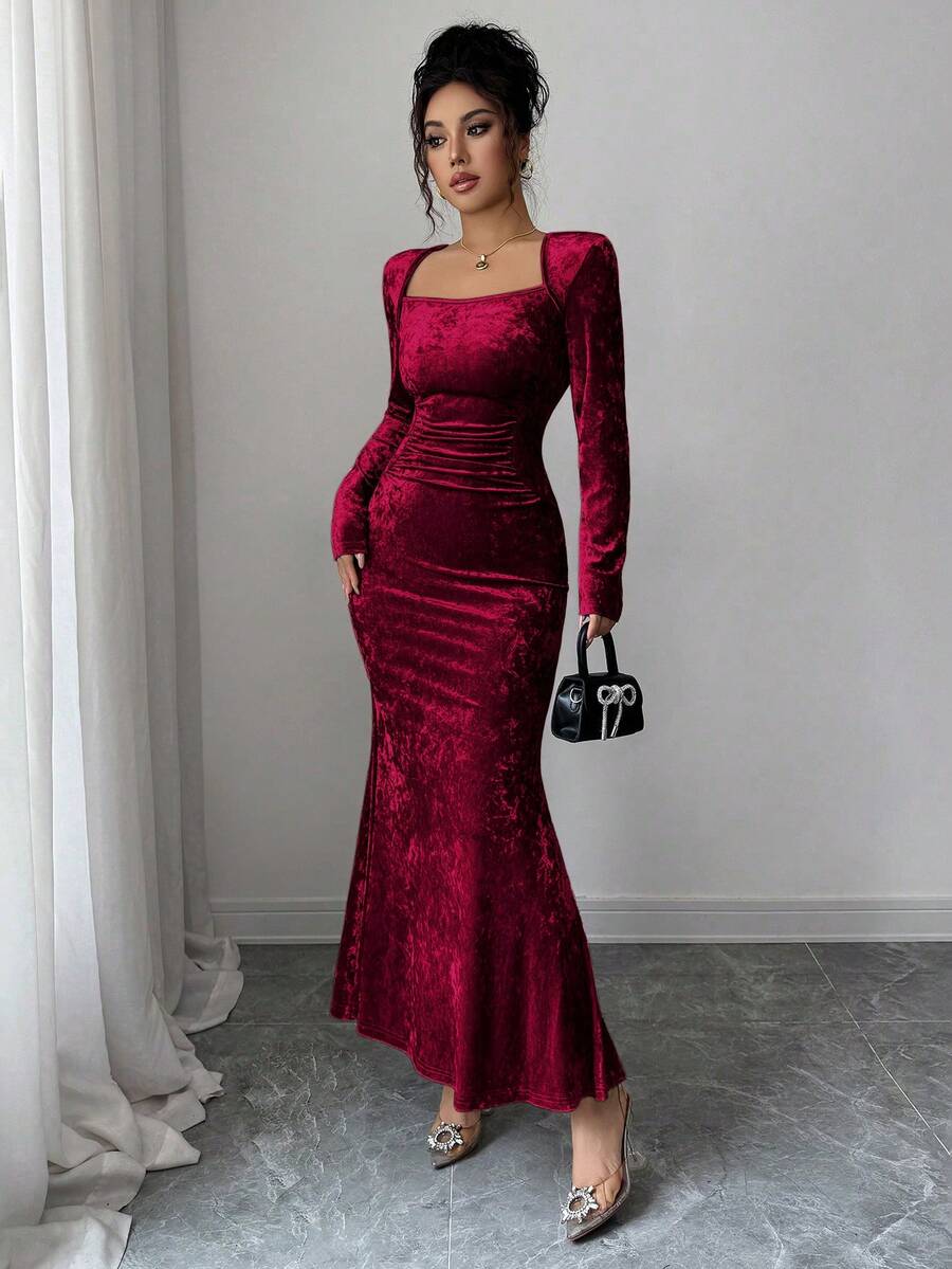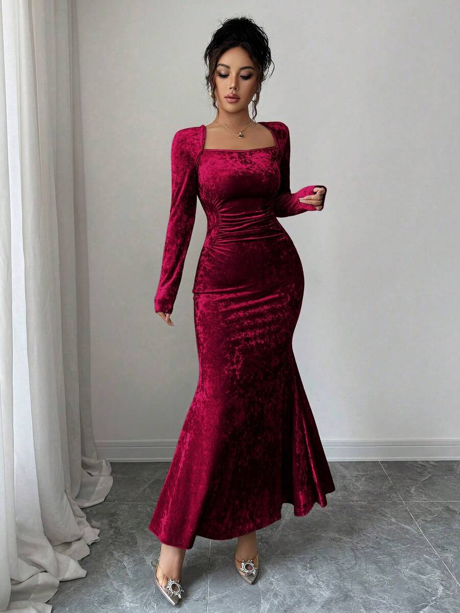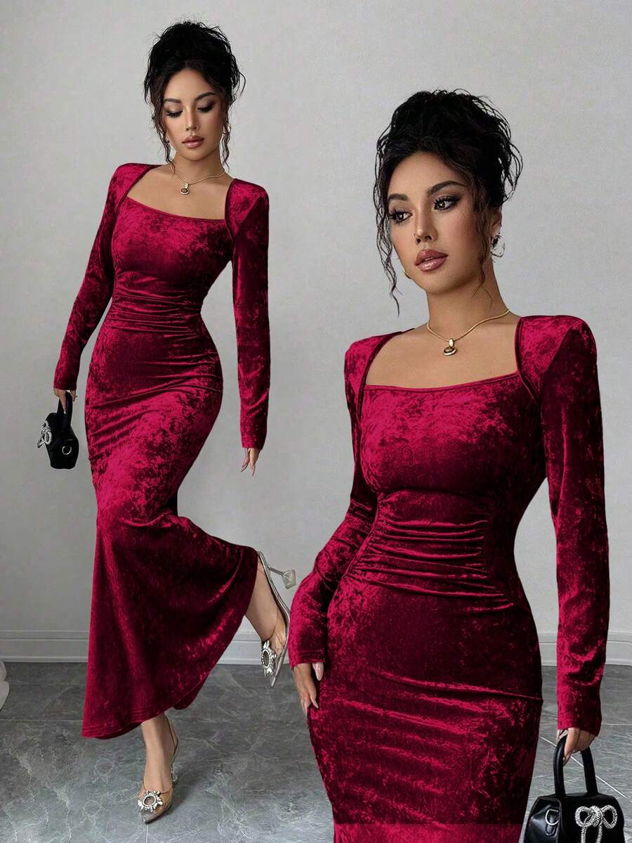 Jesen/Zima Ženska Turtleneck Samt Zlatni Elastični Pleteni Bodycon Haljina, Elegantna Ručana Struk Riblja Špica Midi Haljina za Komunikaciju i Spoj