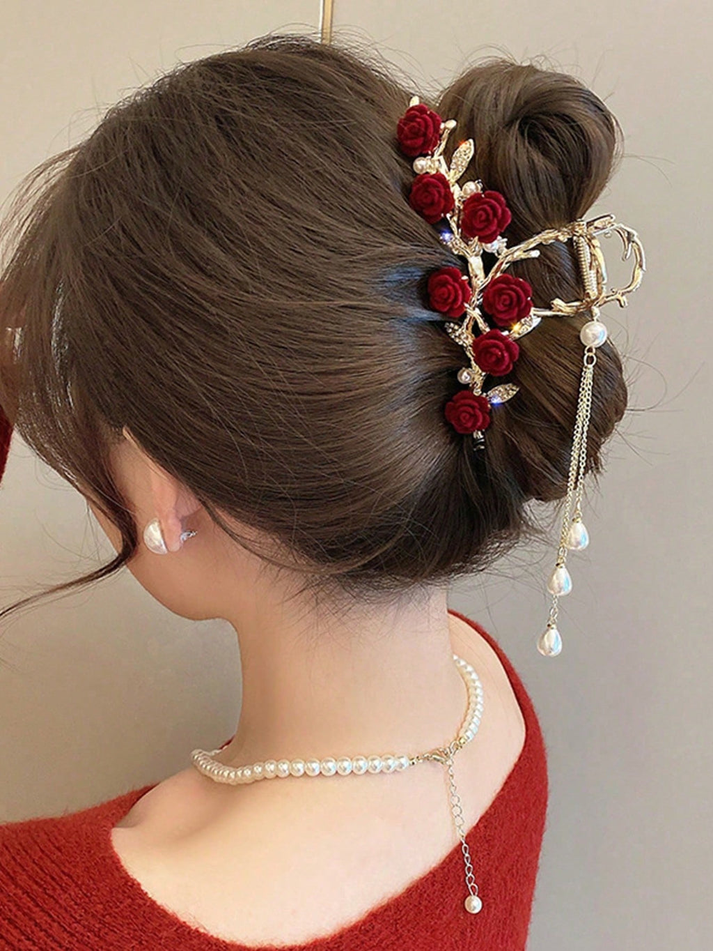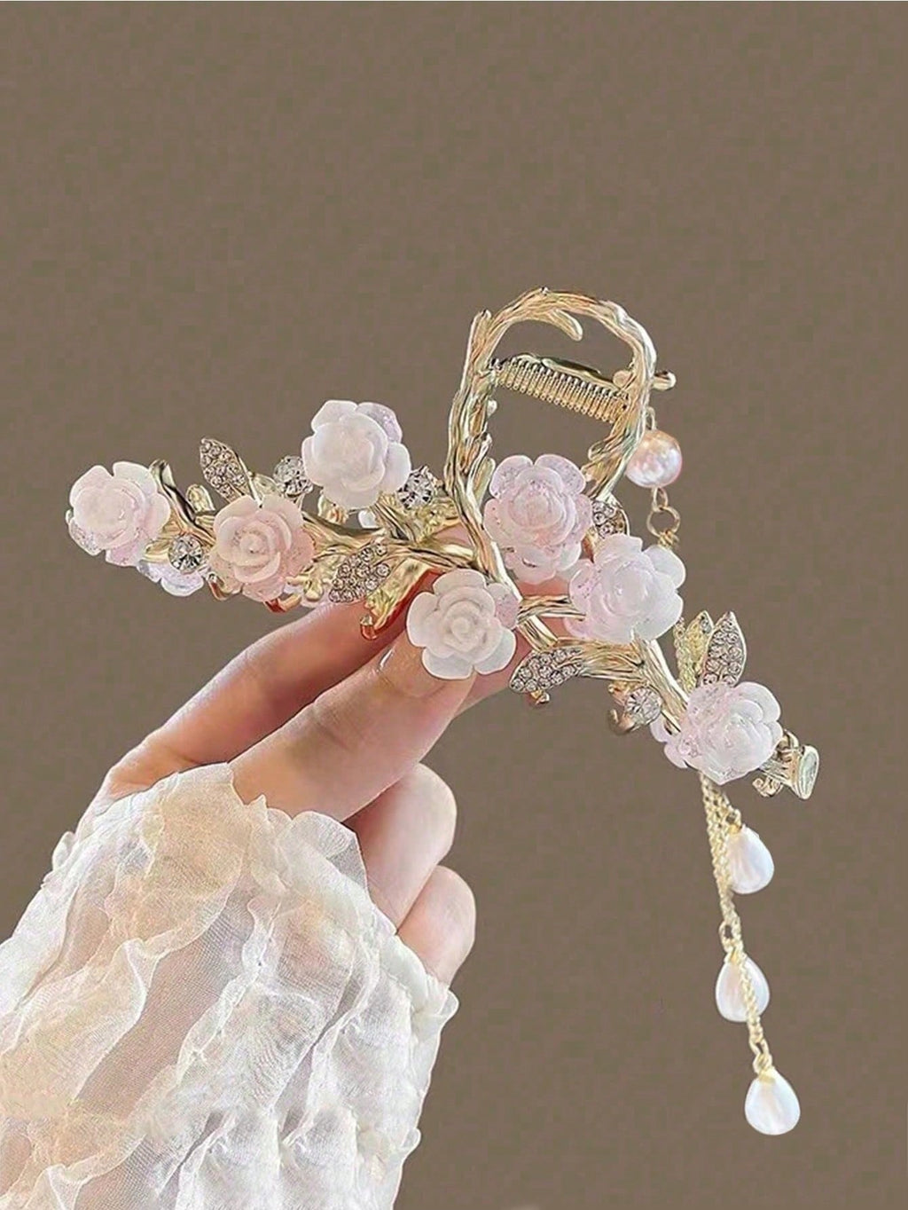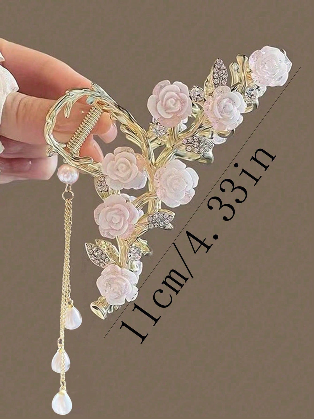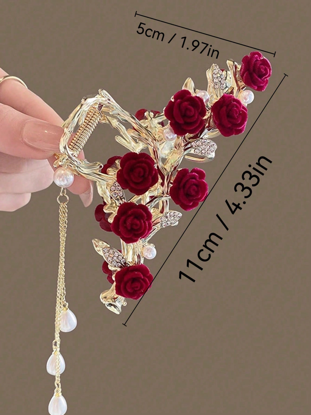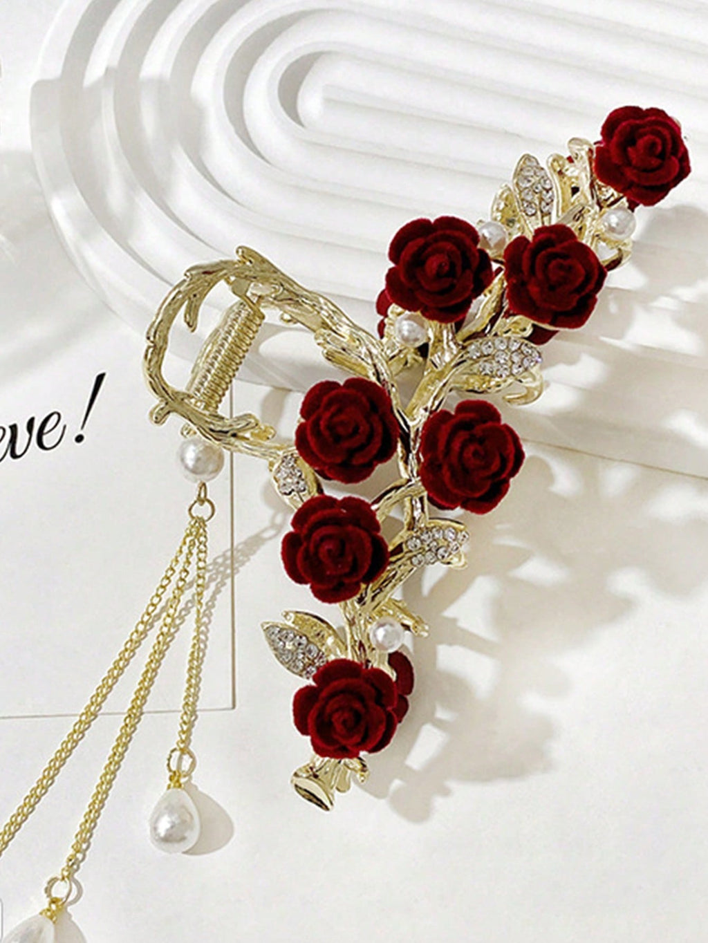 MIU 1pc Women Elegant Sophisticated Alloy Flocked Rose Rhinestones, Pearl