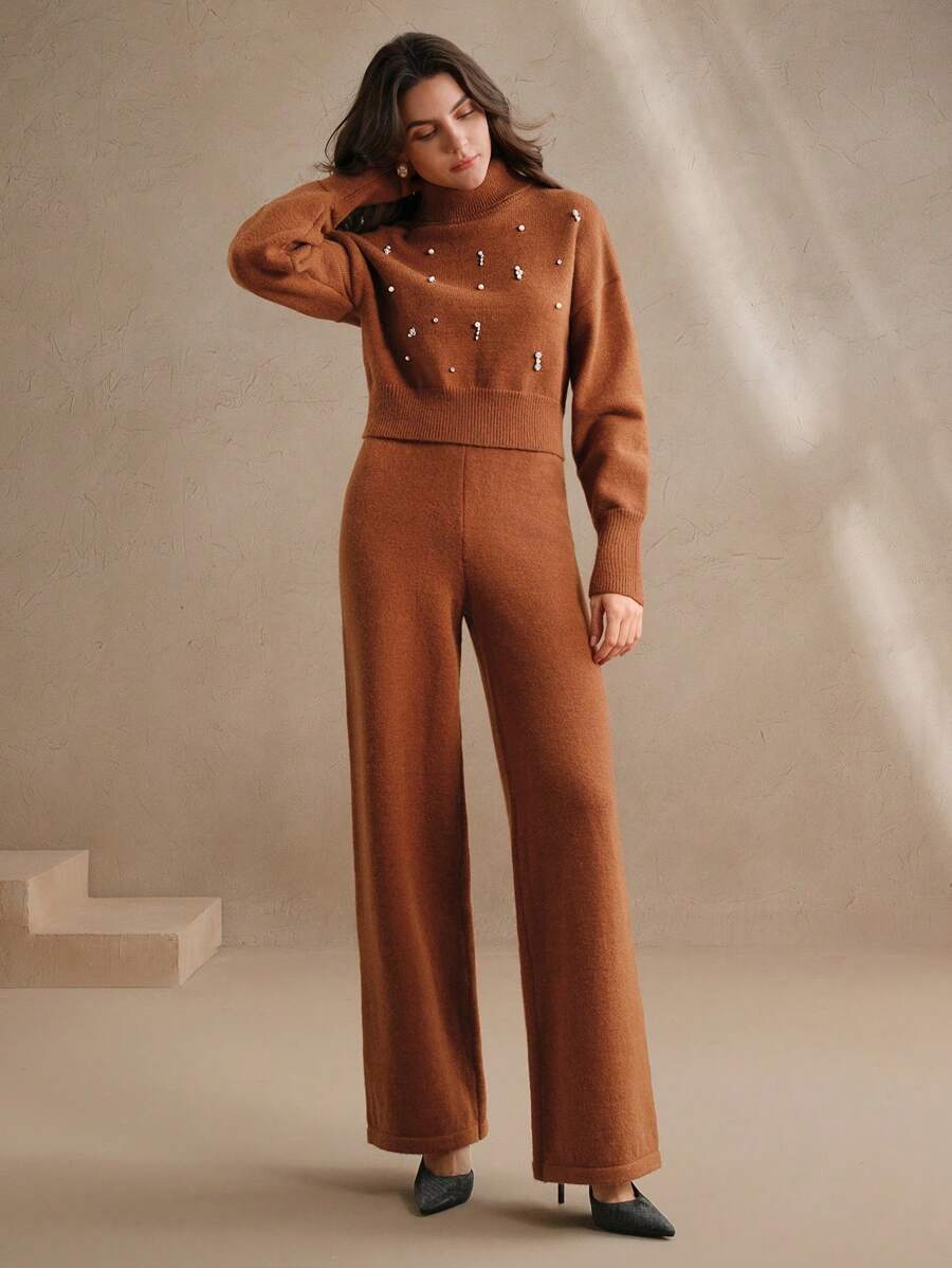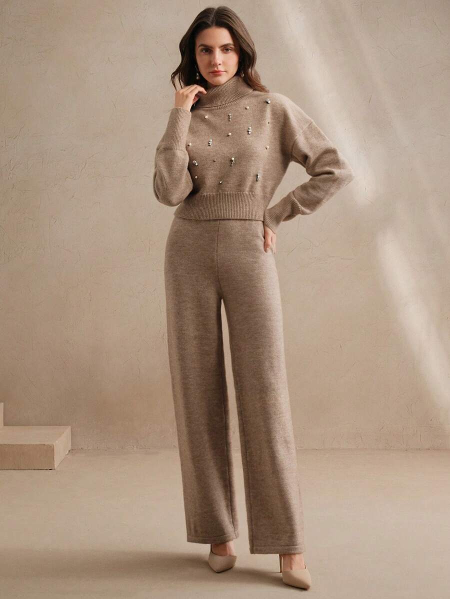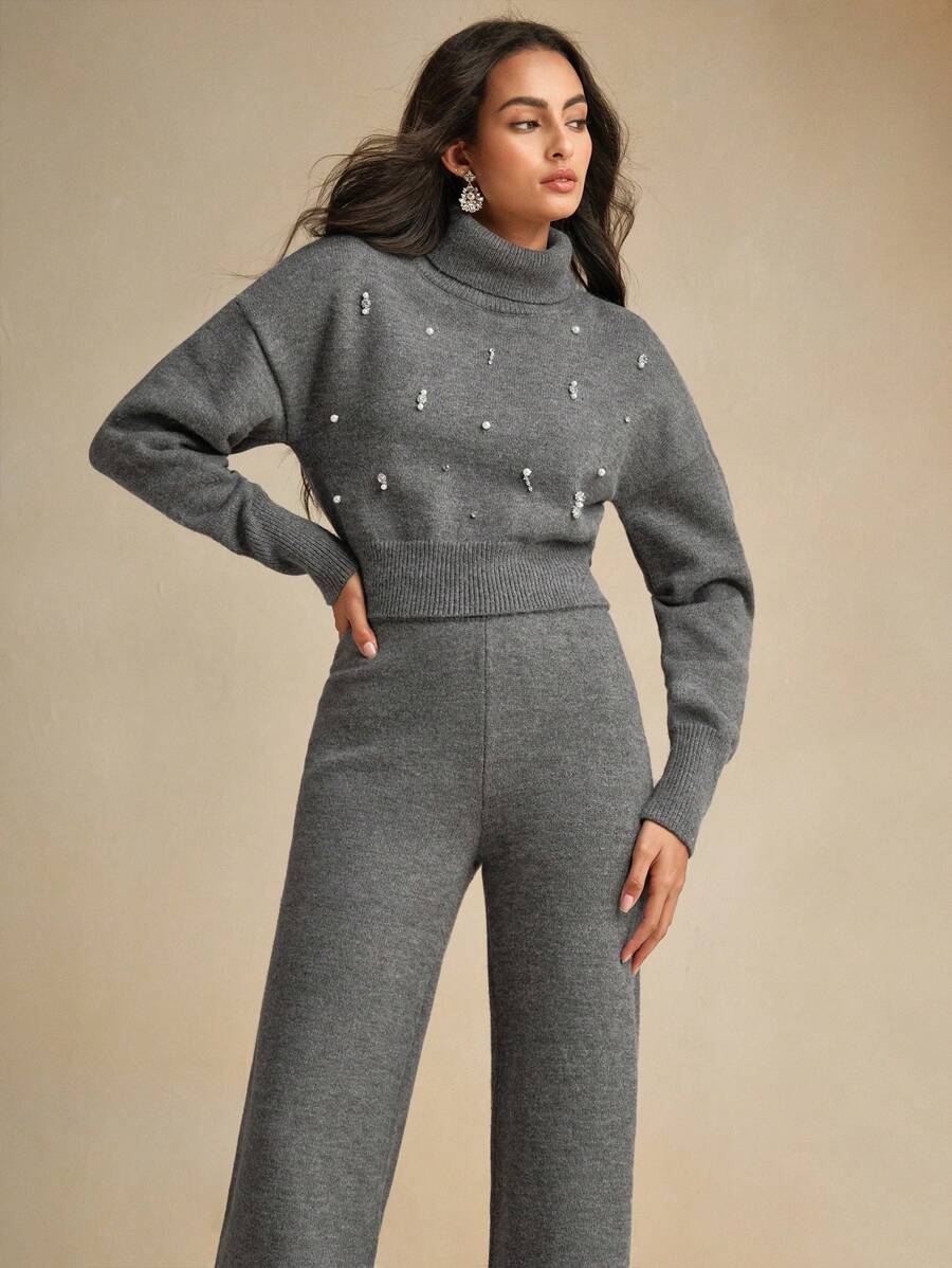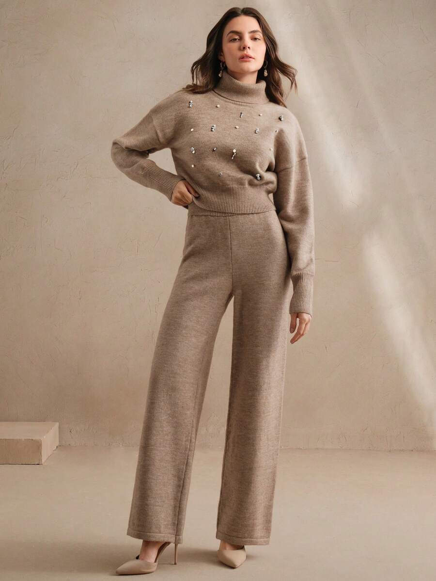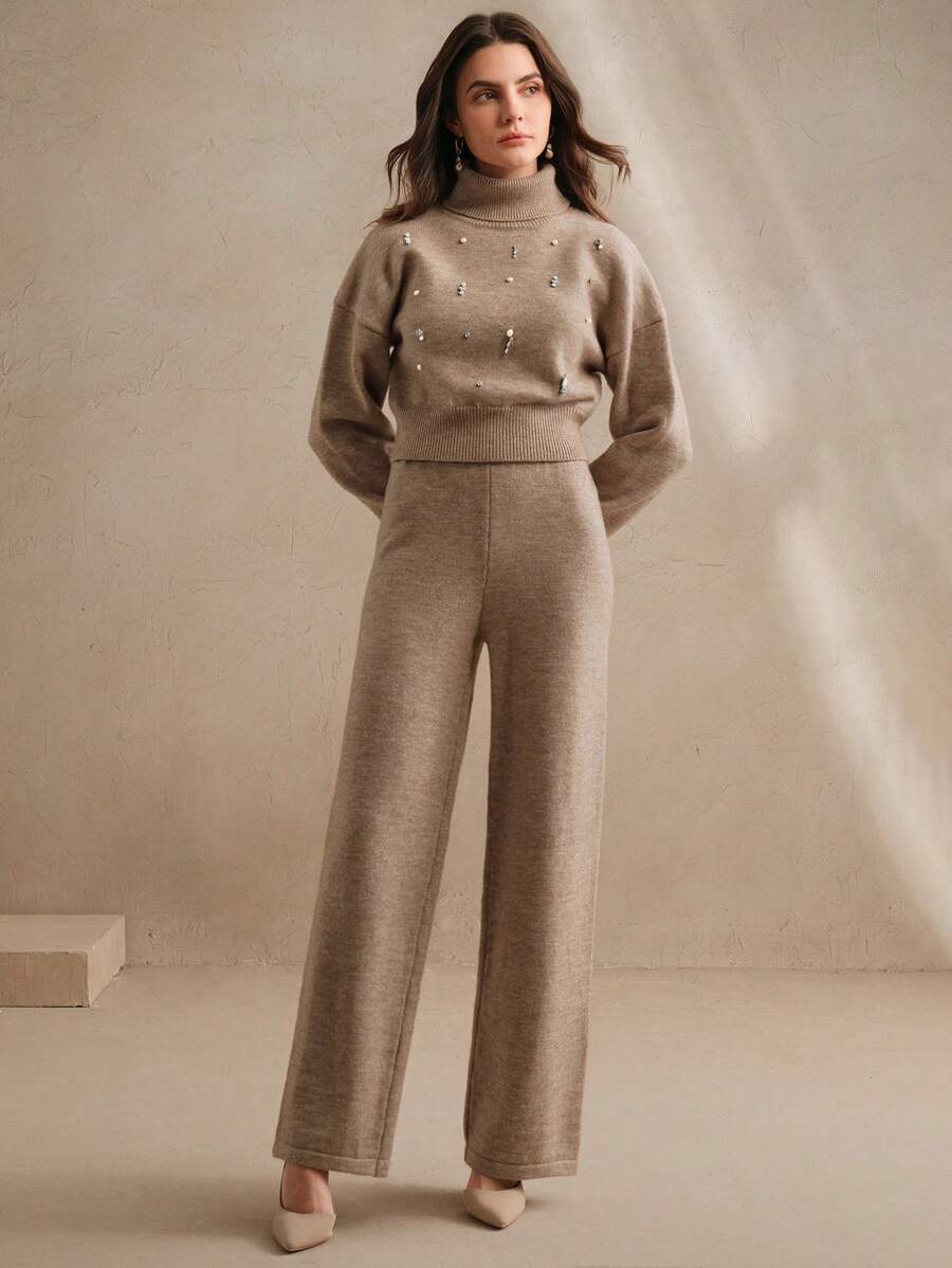 MIU 2 Pieces Set Casual Rhinestone Embellished High Neck Cropped Ribbed Waist Sweater