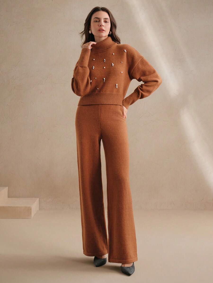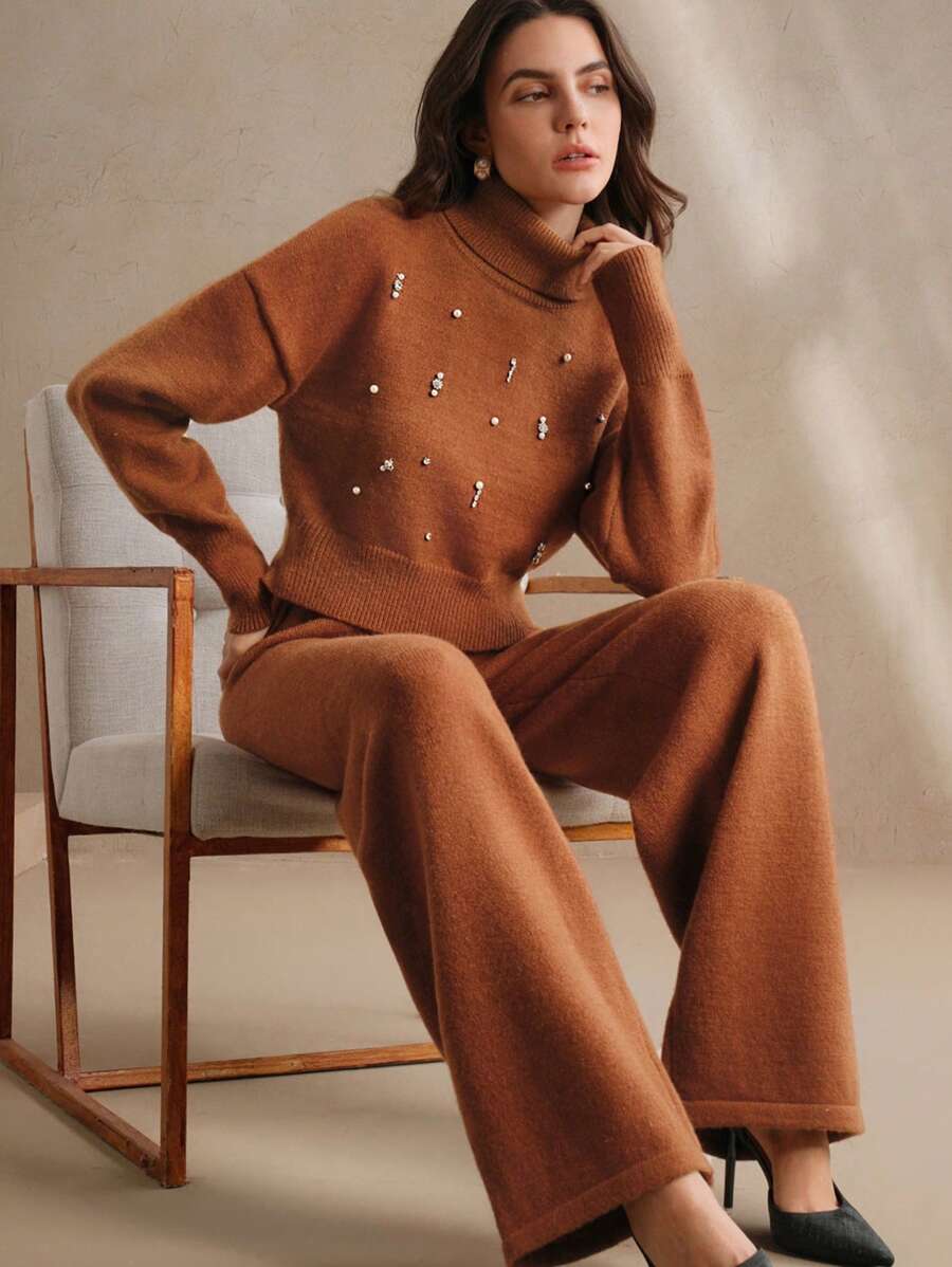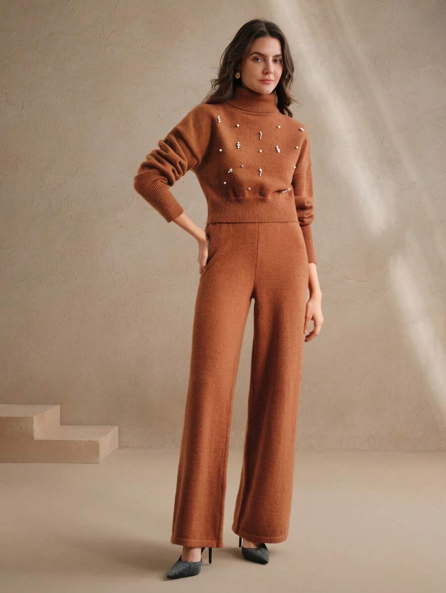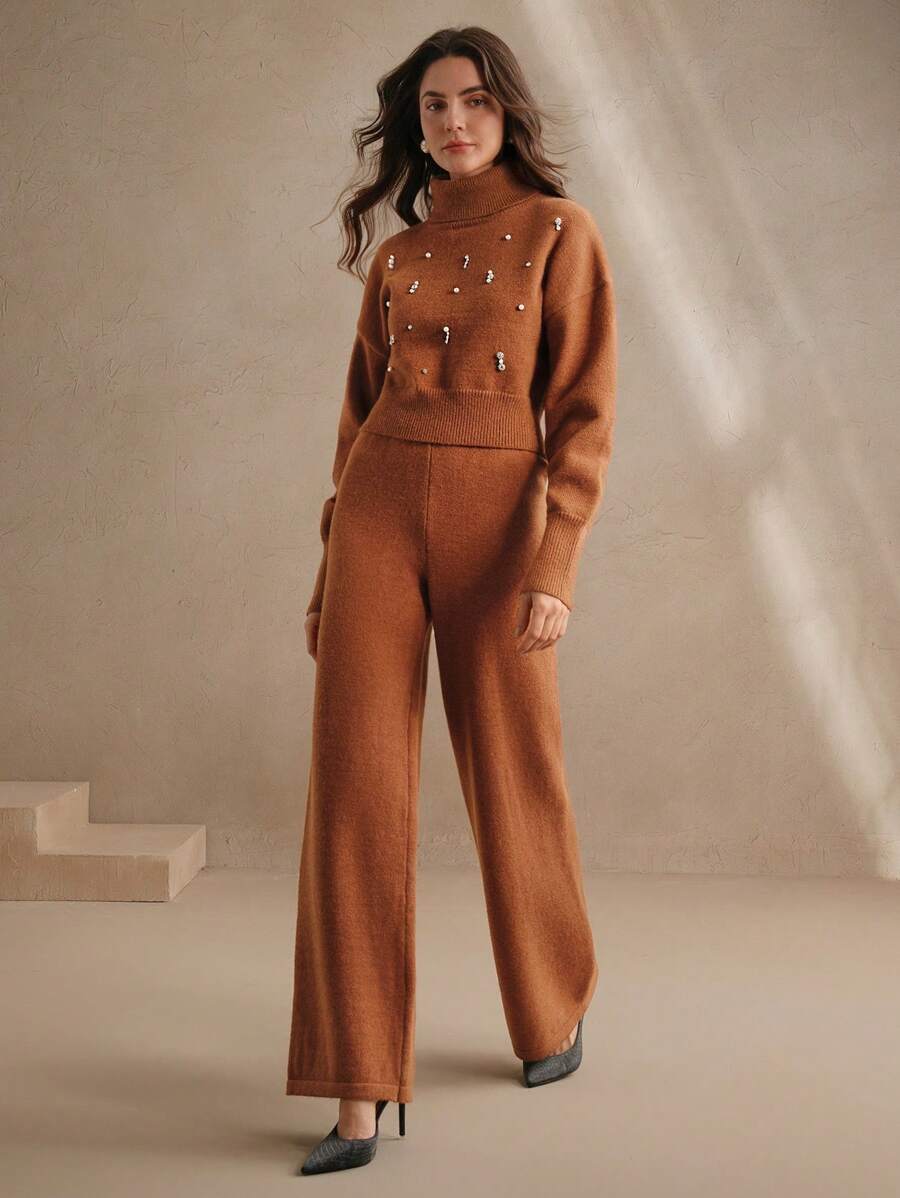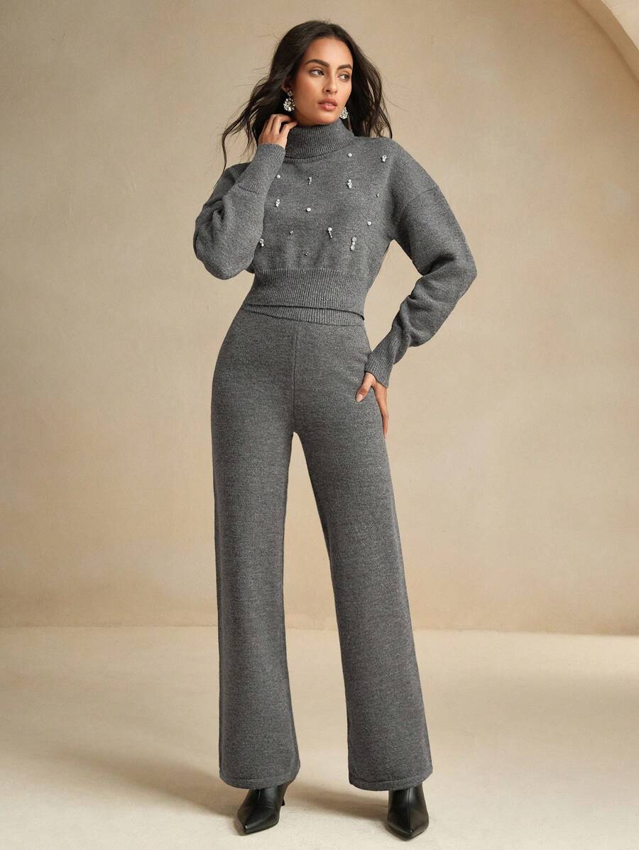 MIU 2 Pieces Set Casual Rhinestone Embellished High Neck Cropped Ribbed Waist Sweater