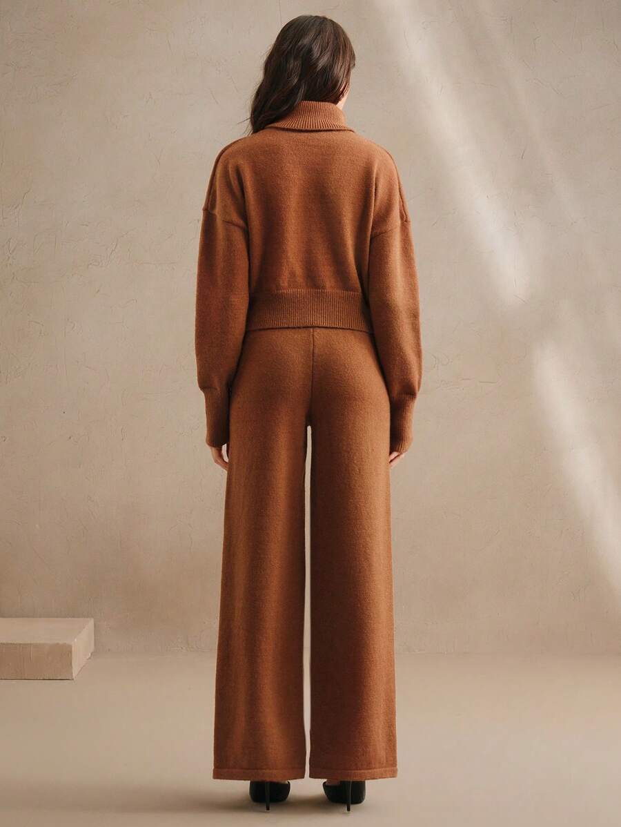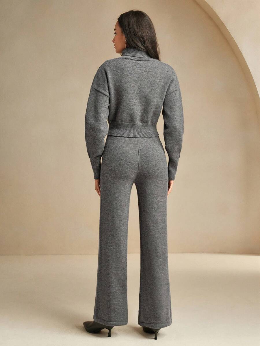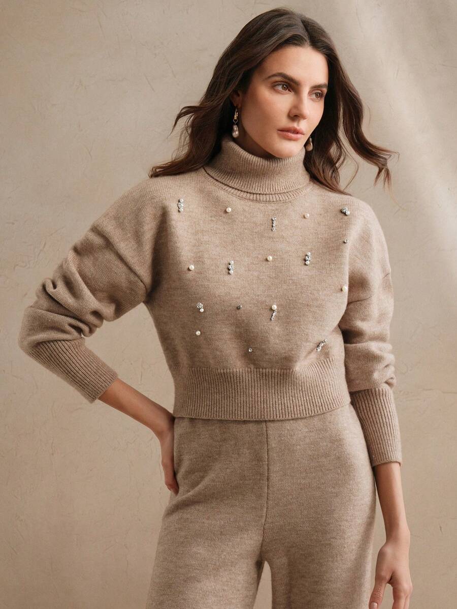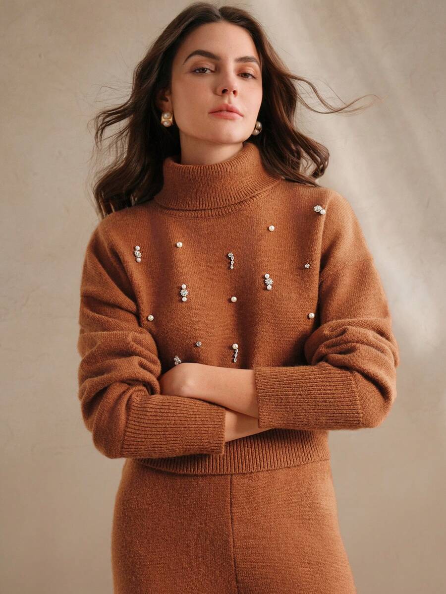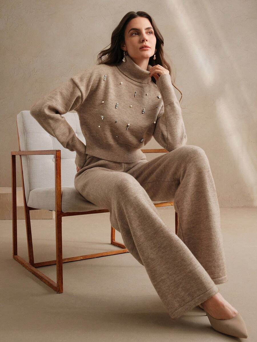 MIU 2 Pieces Set Casual Rhinestone Embellished High Neck Cropped Ribbed Waist Sweater