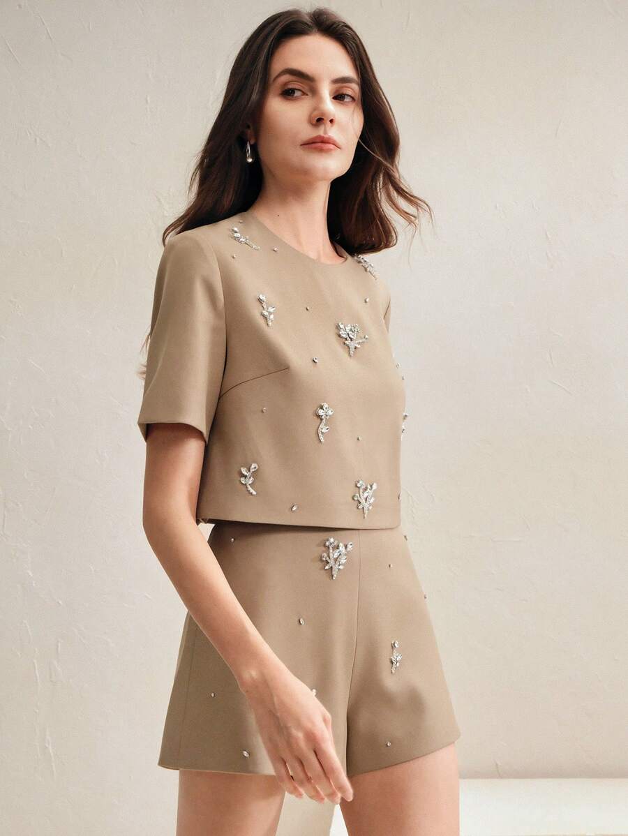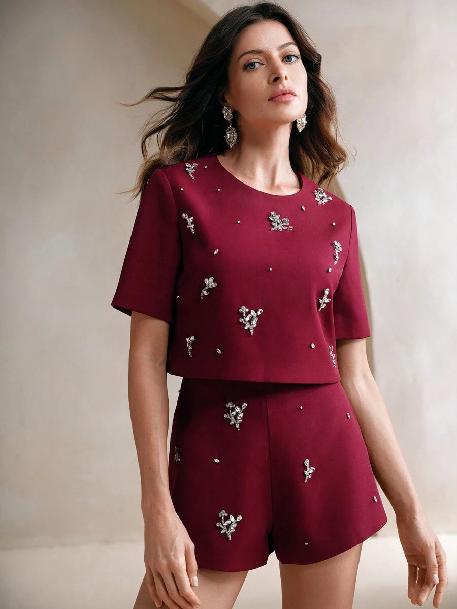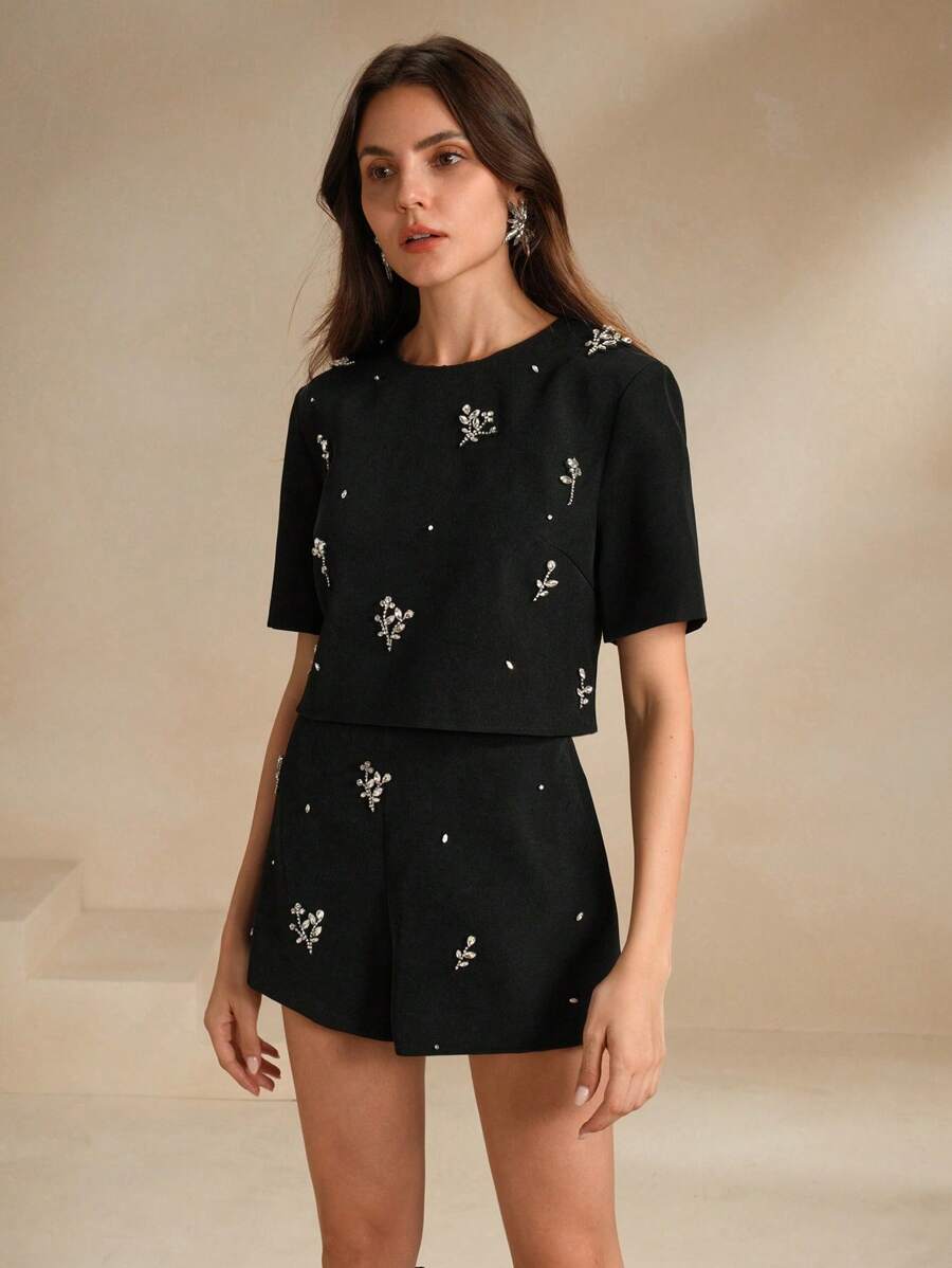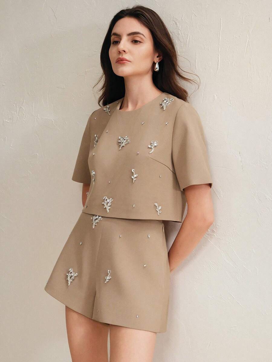 MIU 2pcs Elegant Floral Beaded Top And Shorts Set