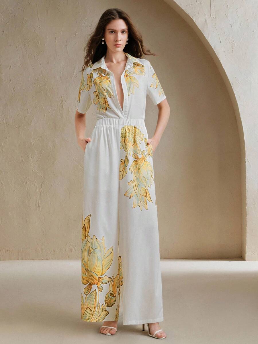 MIU 2pcs Elegant Resort Floral Print Short Sleeve Loose Shirt